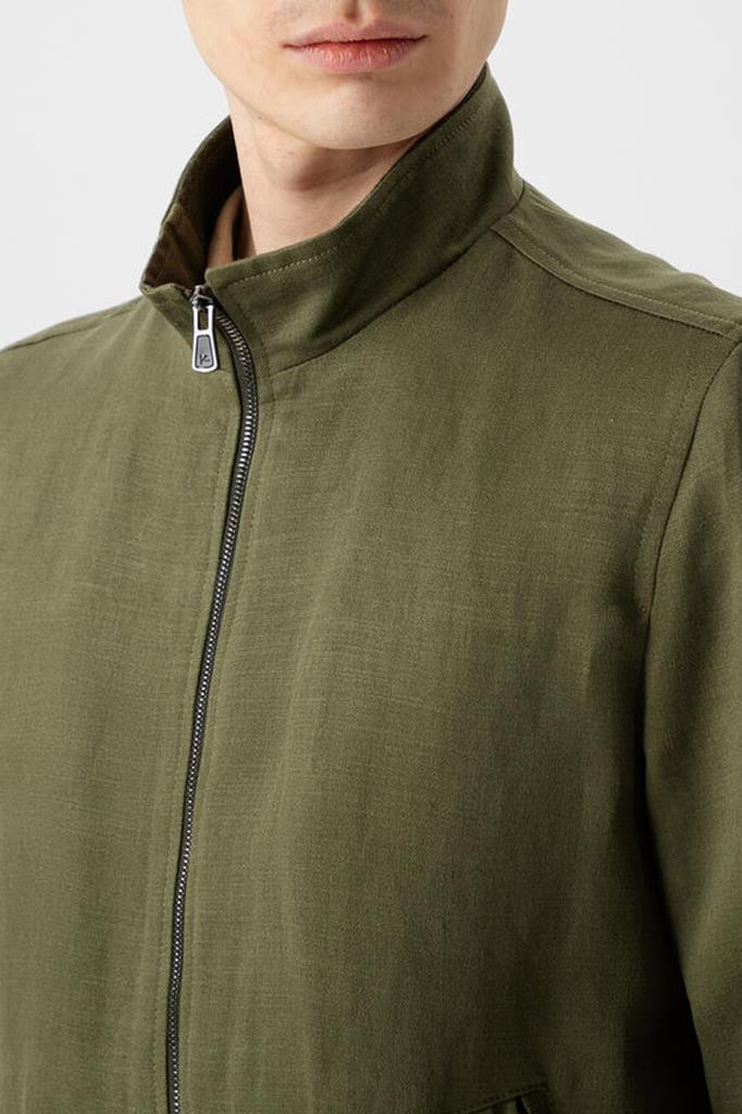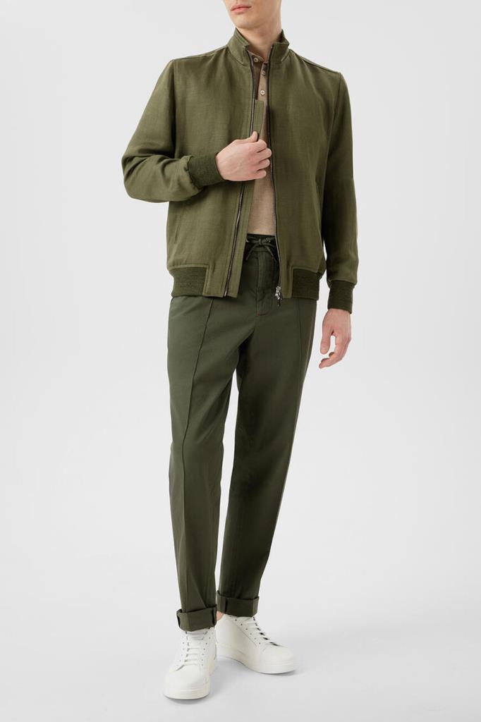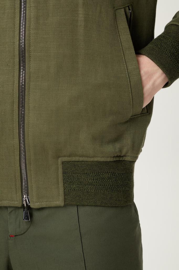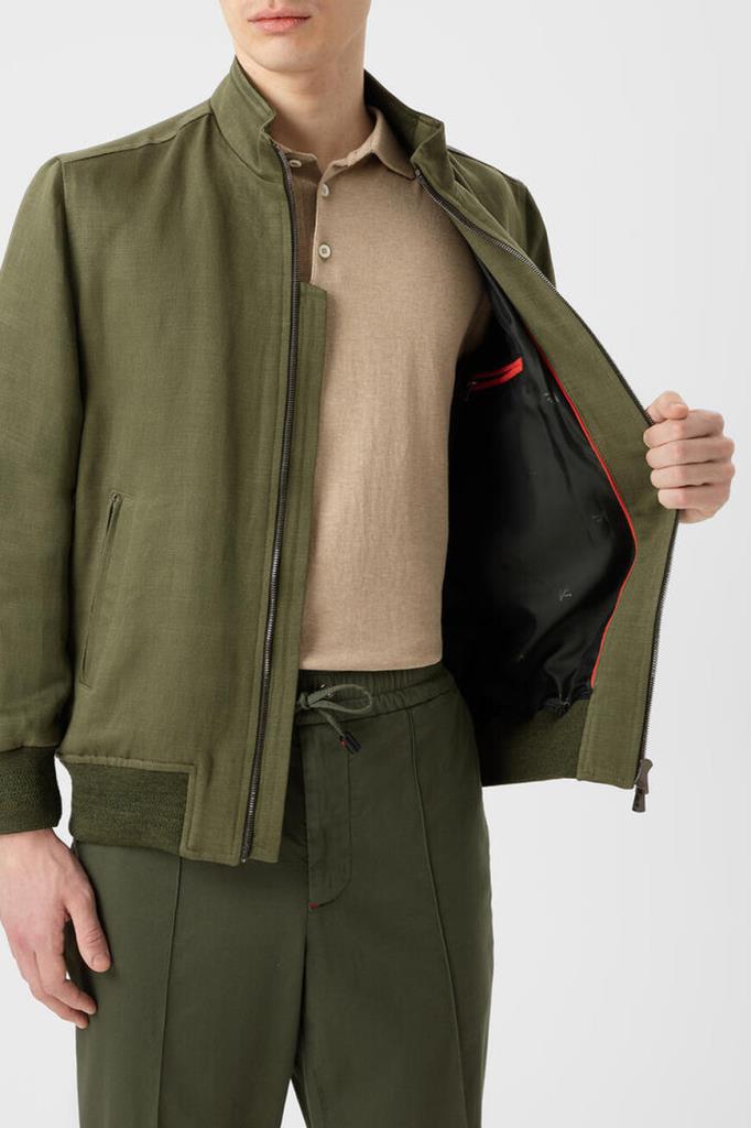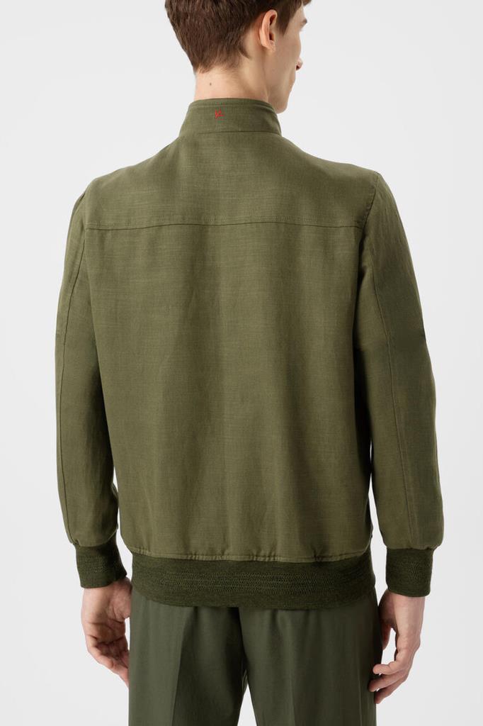 Стильная куртка-бомбер от Isaia в изысканном оттенке хаки. Оригинальная модель прямого кроя выполнена из мягкого трикотажа на основе фирменного кашемира, гладкого шёлка и льна и украшена фирменной миниатюрной вышивкой с культовым символом бренда - красной коралловой веточкой сзади на воротнике.