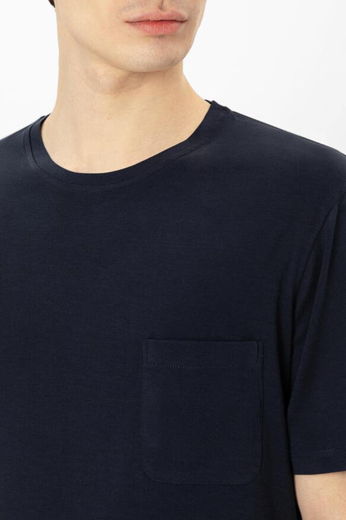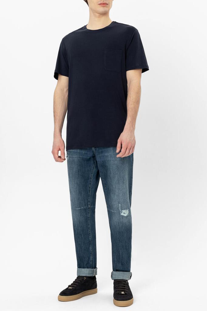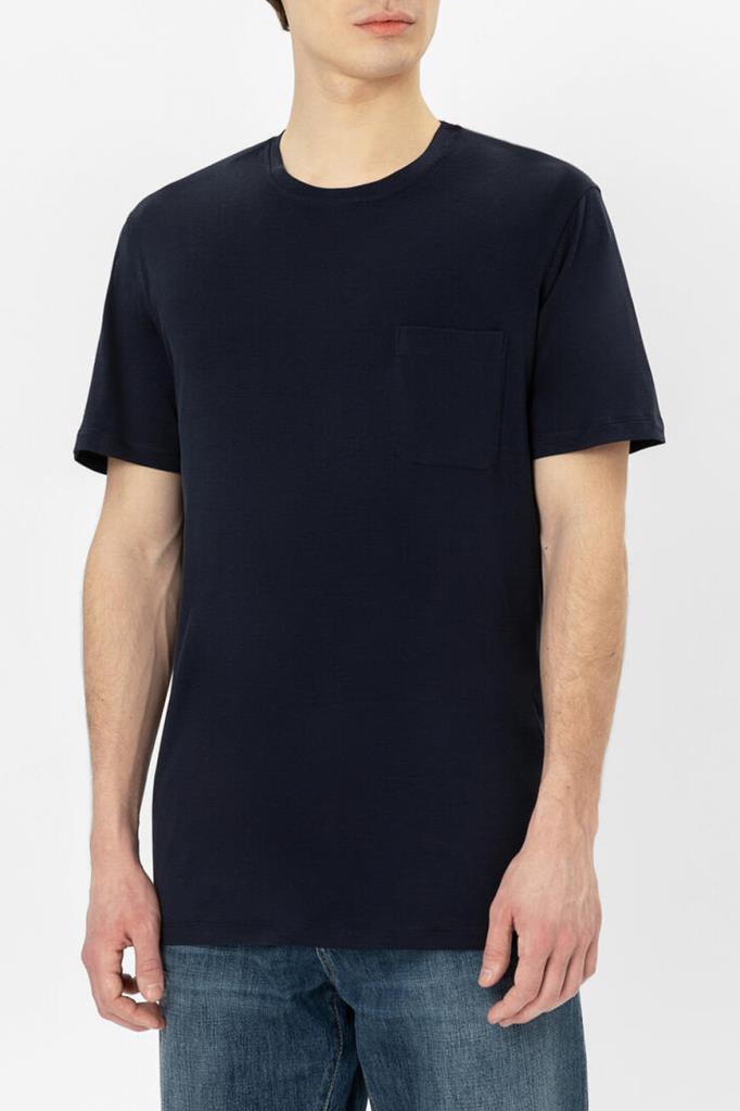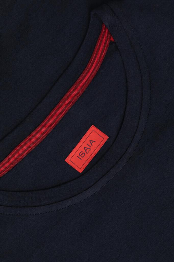 Базовая мужская футболка Isaia из мягкого трикотажа на основе хлопка и гладкого шёлка универсального тёмно-синего цвета. Лаконичная модель комфортного прямого кроя, с круглым вырезом горловины с фактурой в рубчик, короткими рукавами и нагрудным накладным карманом слева. Изделие украшает стильная миниатюрная вышивка с культовым символом бренда - коралловой веточкой в тон спереди снизу.