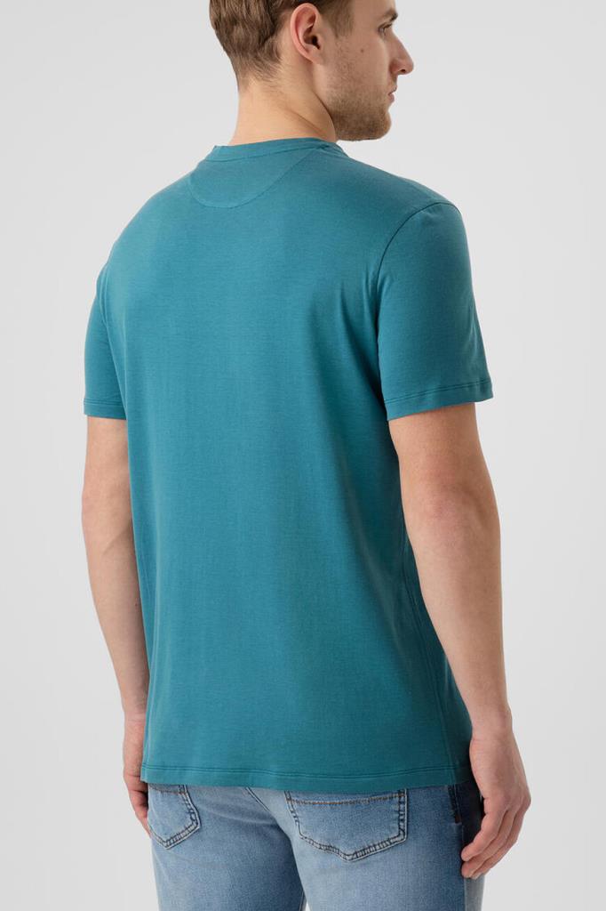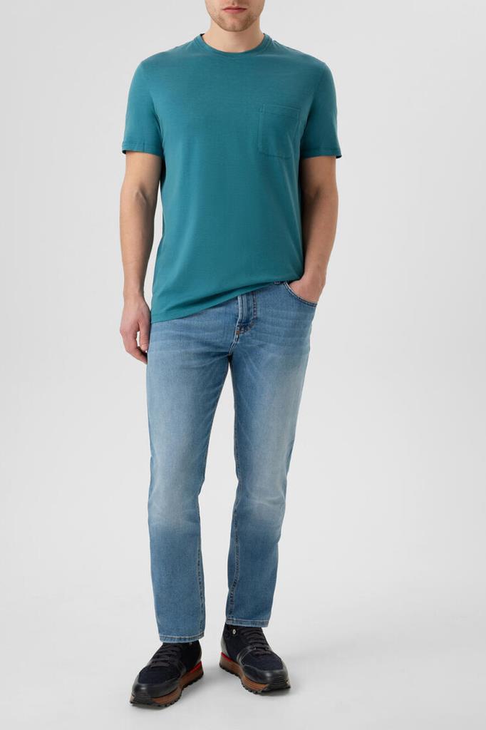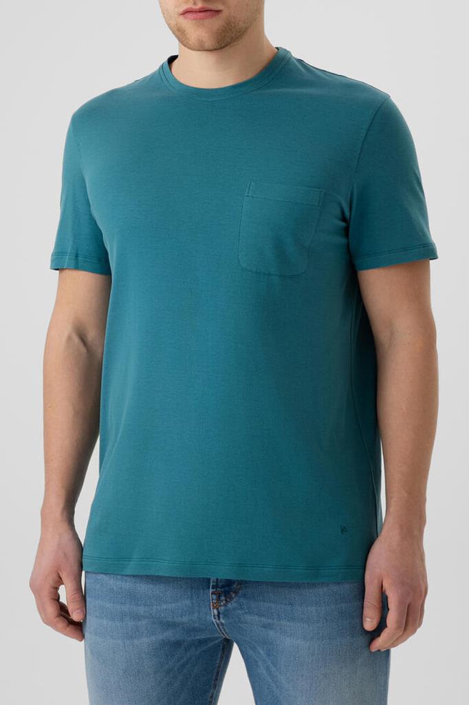 Стильная футболка Isaia из мягкого трикотажа на основе хлопка и гладкого шёлка. Лаконичная модель насыщенного бирюзового оттенка украшена миниатюрной вышивкой с культовым символом бренда - коралловой веточкой спереди снизу.