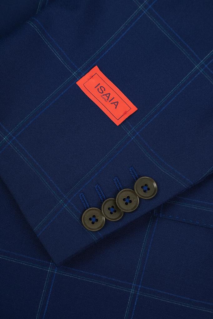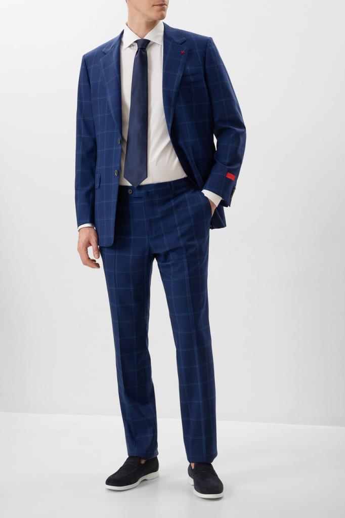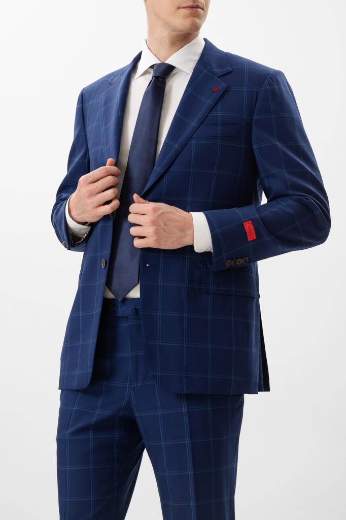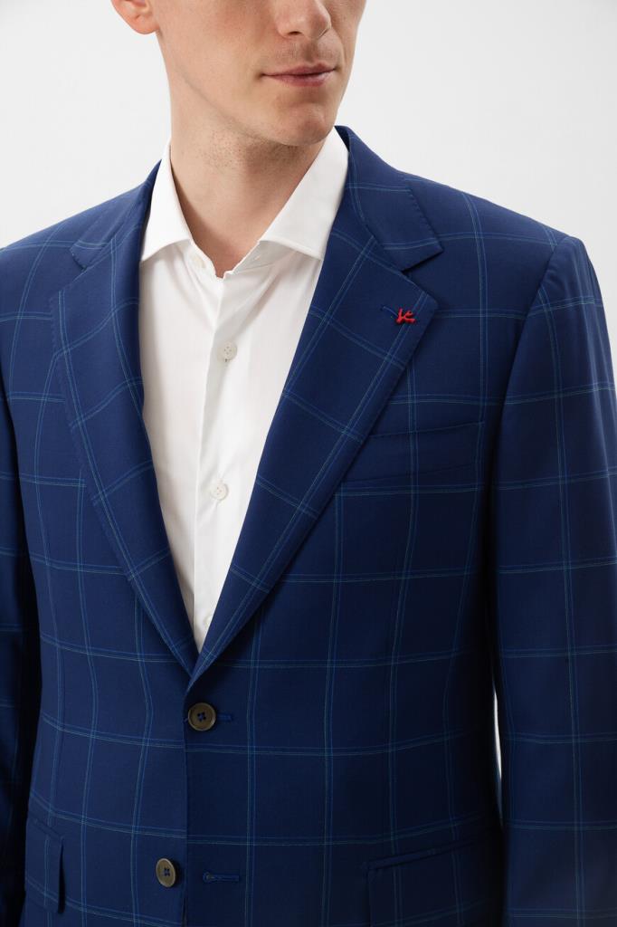 Шерстяной костюм-двойка в синей гамме от Isaia. Однобортный полуприталенный пиджак и брюки прямого кроя со стрелками украшены геометрическим принтом в крупную клетку. Особый неаполитанский крой, высокие проймы и широкие отвороты пиджака, в сочетании с классическим кроем брюк обеспечивают комфортную посадку по фигуре. Принадлежность изделия бренду обозначена ярко-красной коралловой ветвью, присутствующей в петлице, и красной накладкой с логотипом бренда на левом рукаве.