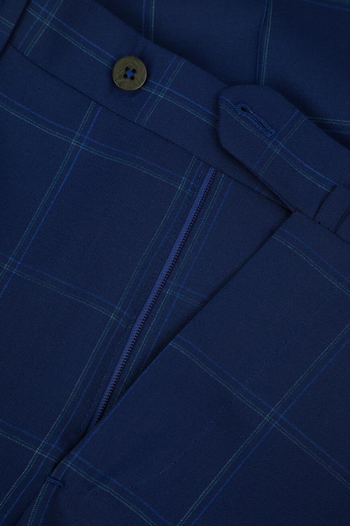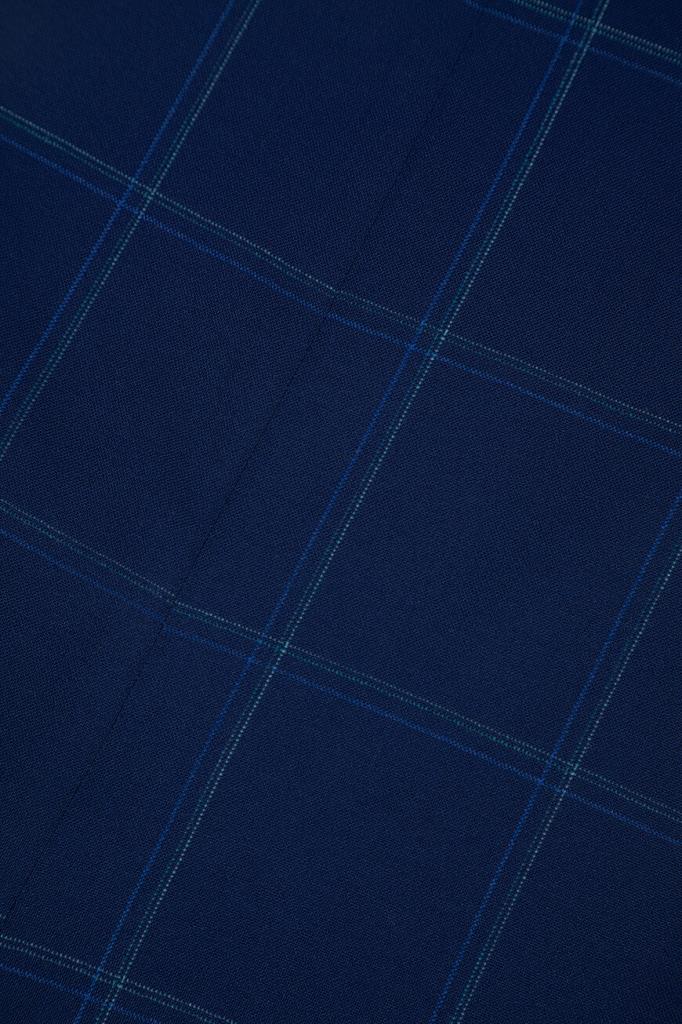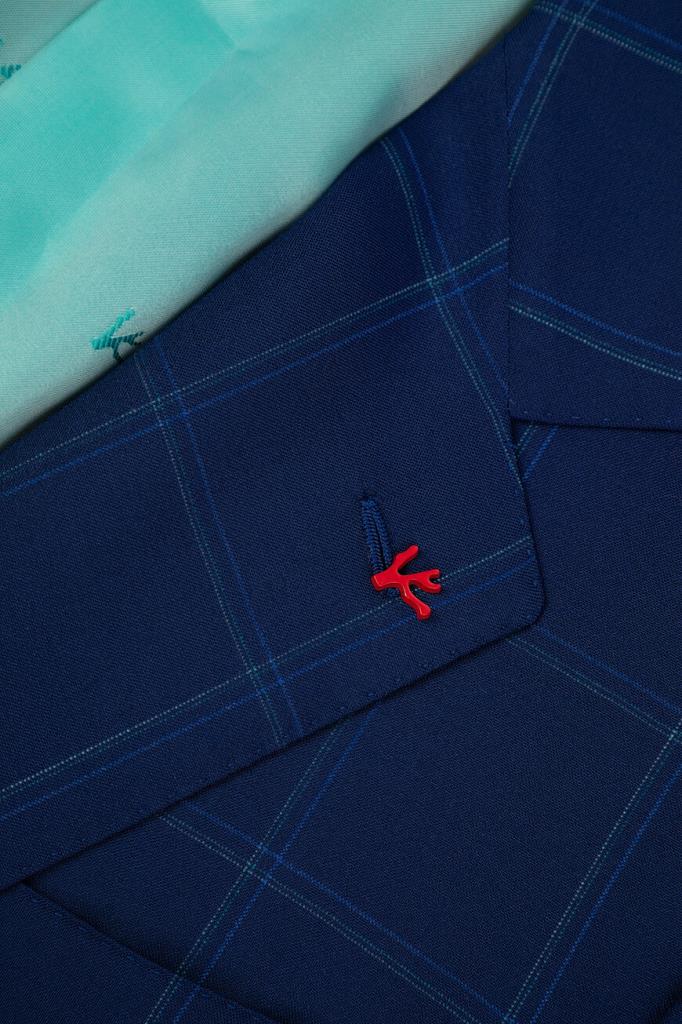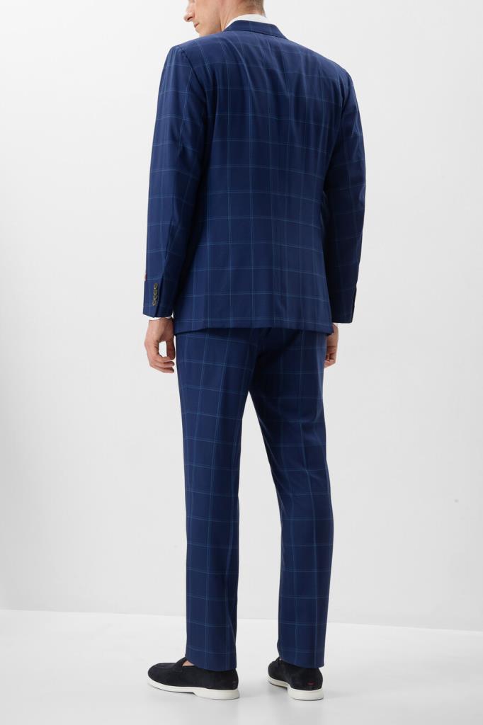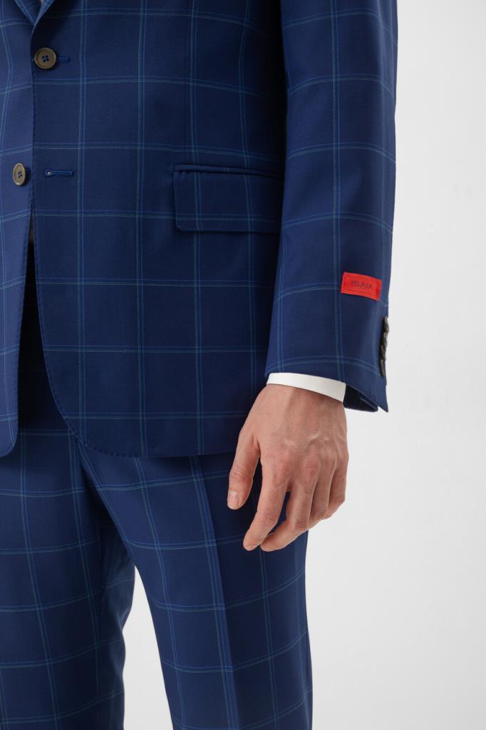 Шерстяной костюм-двойка в синей гамме от Isaia. Однобортный полуприталенный пиджак и брюки прямого кроя со стрелками украшены геометрическим принтом в крупную клетку. Особый неаполитанский крой, высокие проймы и широкие отвороты пиджака, в сочетании с классическим кроем брюк обеспечивают комфортную посадку по фигуре. Принадлежность изделия бренду обозначена ярко-красной коралловой ветвью, присутствующей в петлице, и красной накладкой с логотипом бренда на левом рукаве.