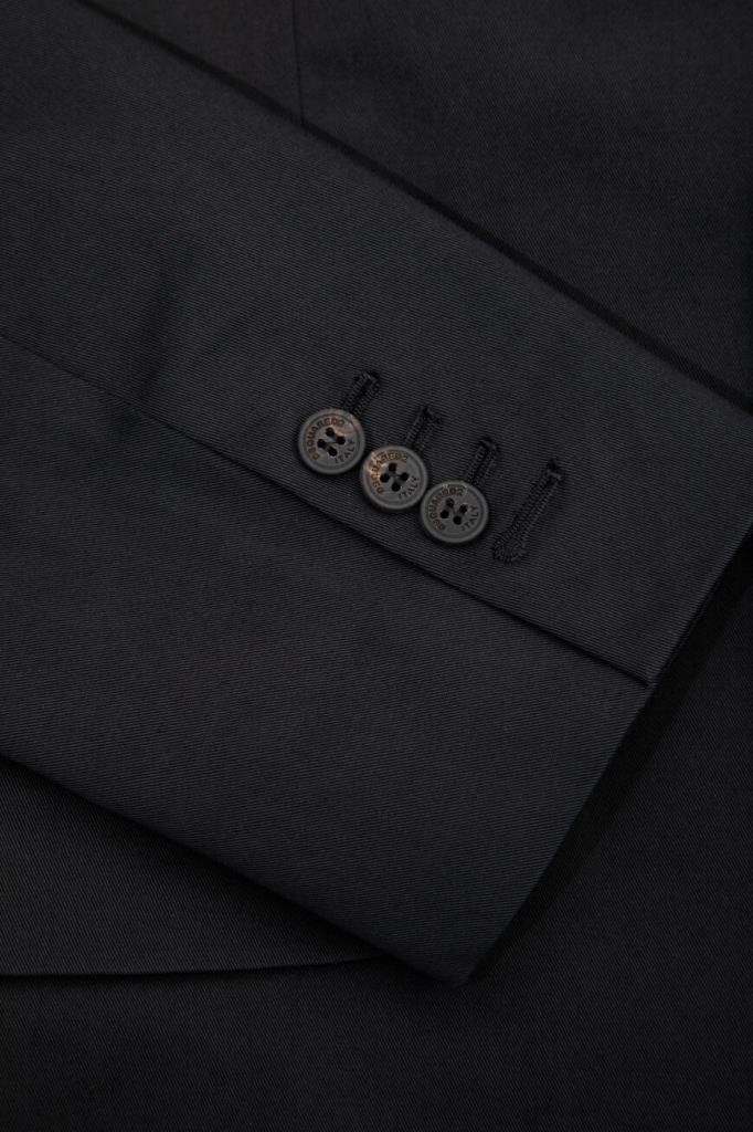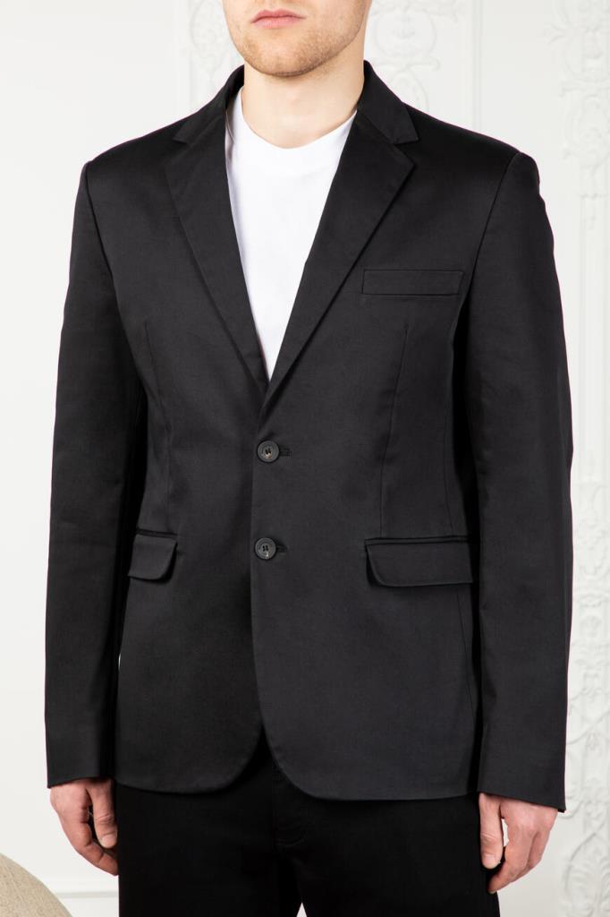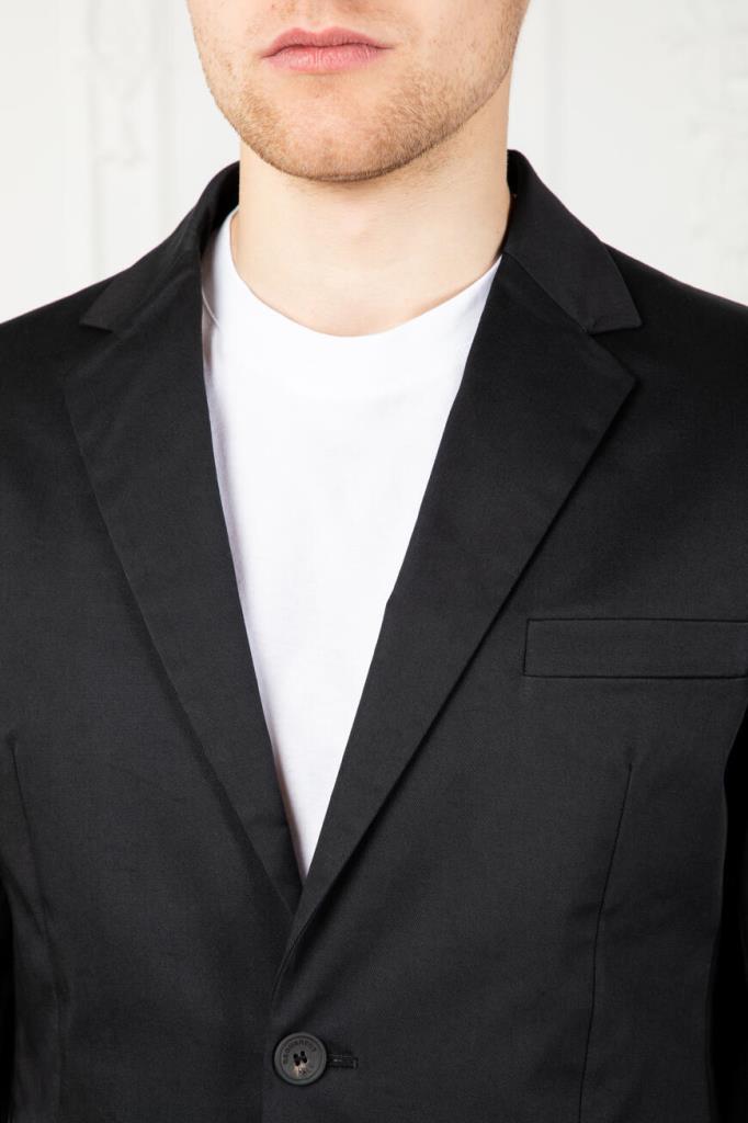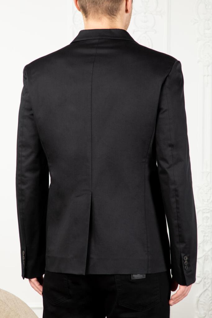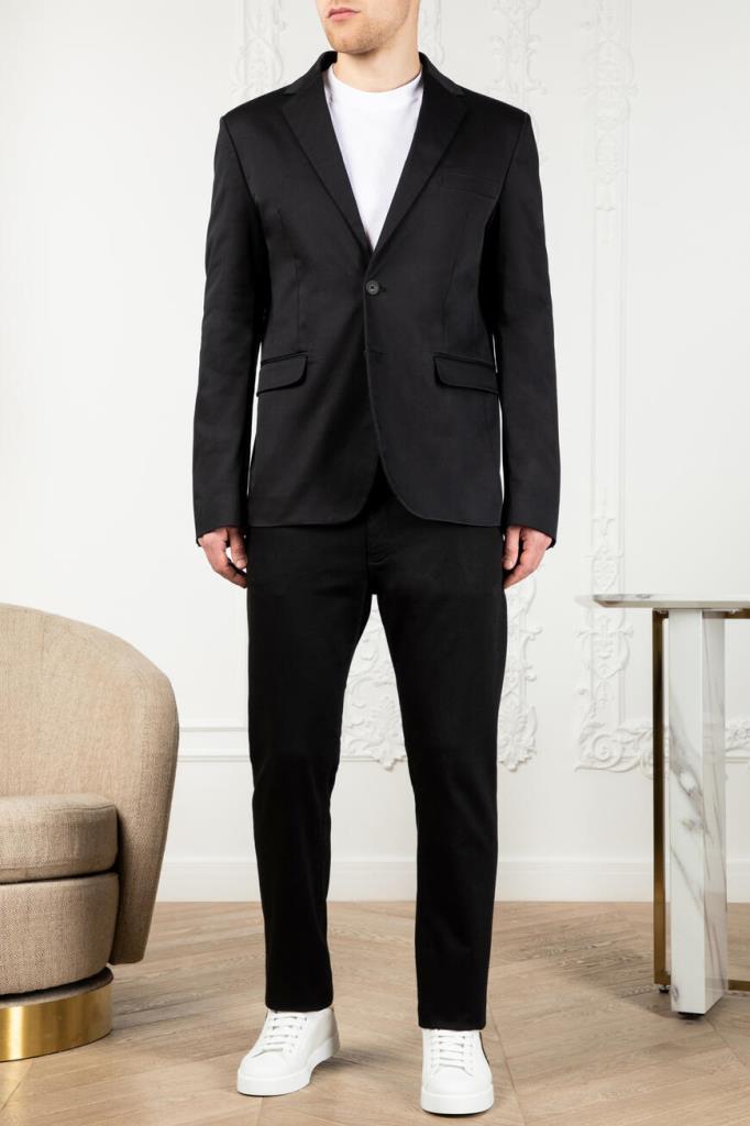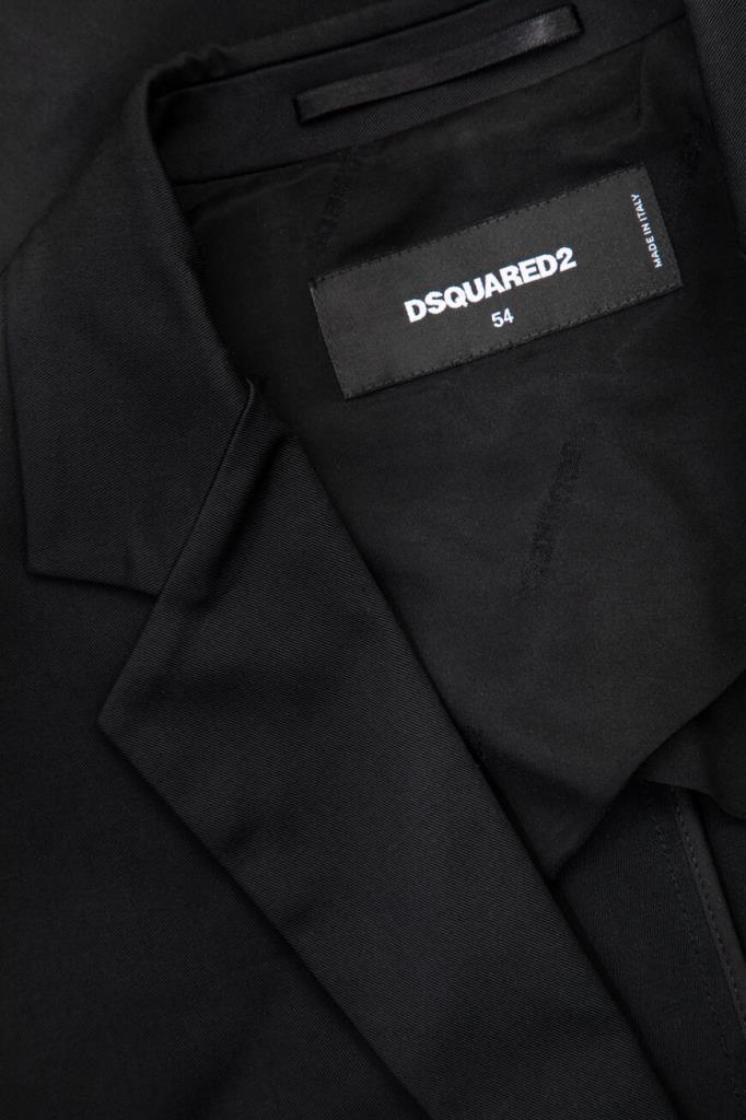 Мужской пиджак от DSQUARED. Изготовлен из натурального хлопка с добавлением небольшого количества укрепляющего синтетического волокна. Материал плотный, гладкий, хорошо держит заданную форму. Модель классического черного цвета, приталенного силуэта, с неширокими прямоугольными лацканами. Символика бренда присутствует на фирменных пуговицах и подкладке в тон изделию. Подкладка частичная, присутствует только спереди. Такой пиджак сочетается как с классическими брюками и сорочками. Подходит для делового гардероба и формальных мероприятий.