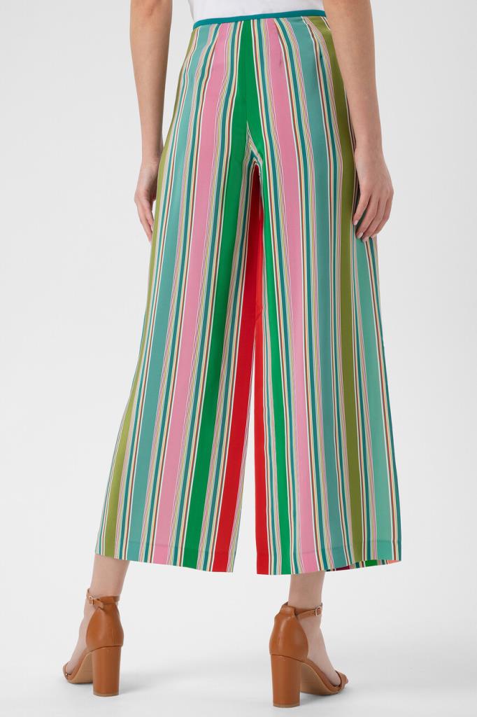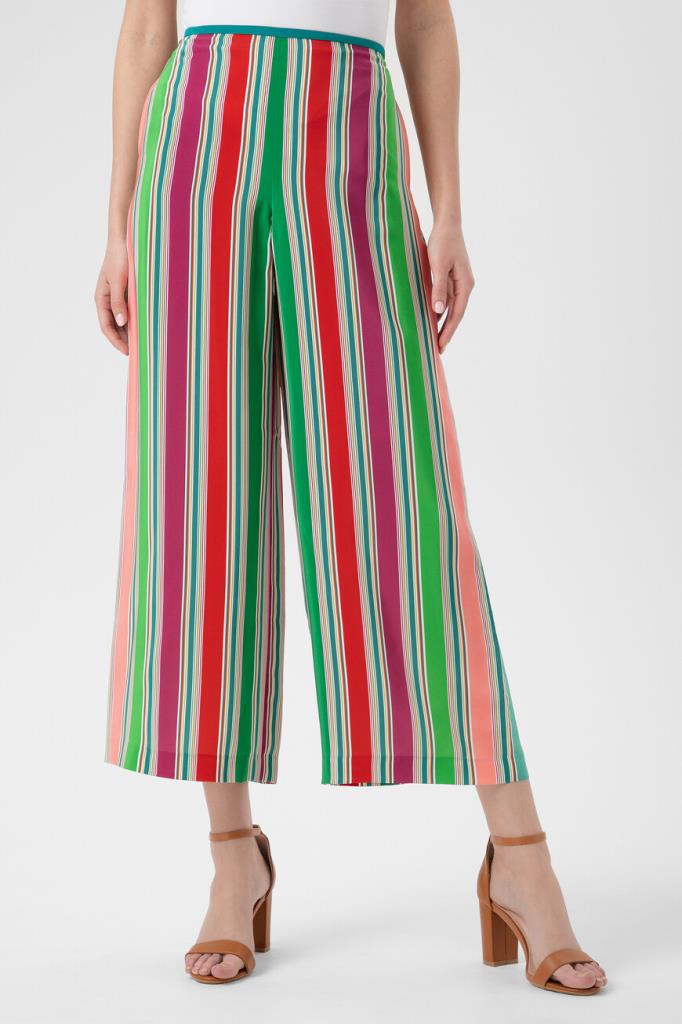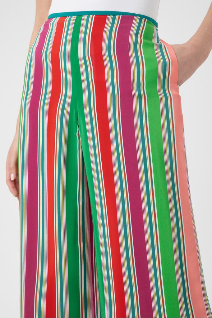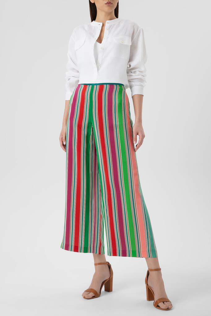 Женские брюки от известного итальянского бренда Loro Piana. Изготовлены из тонкого, гладкого и прохладного на ощупь полотна. Натуральный шелк – один из самых комфортных и ценных видов ткани. Он отлично впитывает влагу тела и быстро испаряет её, оставаясь сухим и комфортным. А кроме того, этот материал благотворно влияет на кожу. Модель прямого, свободного кроя, с рисунком в продольные полосы разных оттенков зеленого, розового и красного тонов. Плотную посадку на бёдрах обеспечивает застёжка на потайную молнию сбоку. Лёгкая, комфортная и эффектная модель.