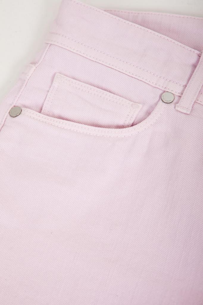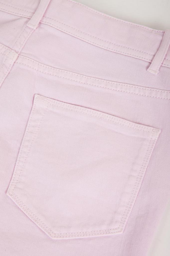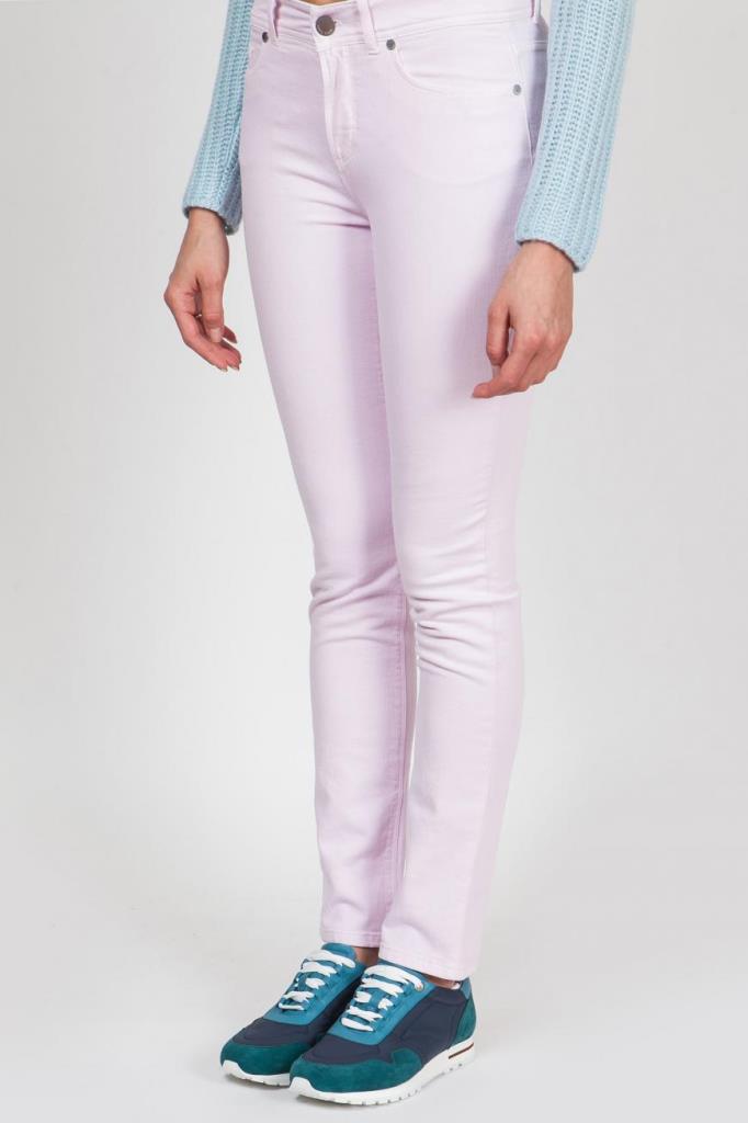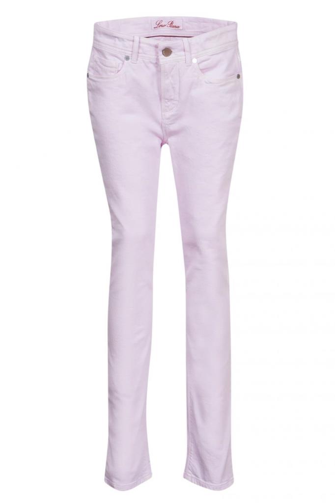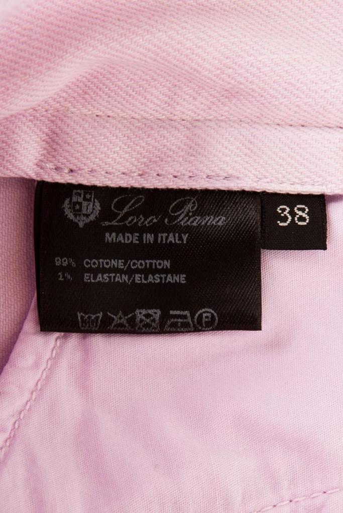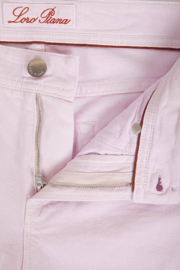 Женские джинсы от итальянского бренда Loro Piana. Изготовлены из тонкого, но плотного и прочного хлопкового полотна. В меру эластичны. Плотно облегают фигуру. Тип облегания — slim fit. Цвет приглушенный, розовый (оттенок чайной розы). Классический джинсовый, 5-карманный дизайн. Вся фурнитура, включая пуговицу-клепку серебристого цвета, брендирована. Традиционная бирка на поясе сзади отсутствует. Ярлычок с названием марки пришит на поясе изнутри.