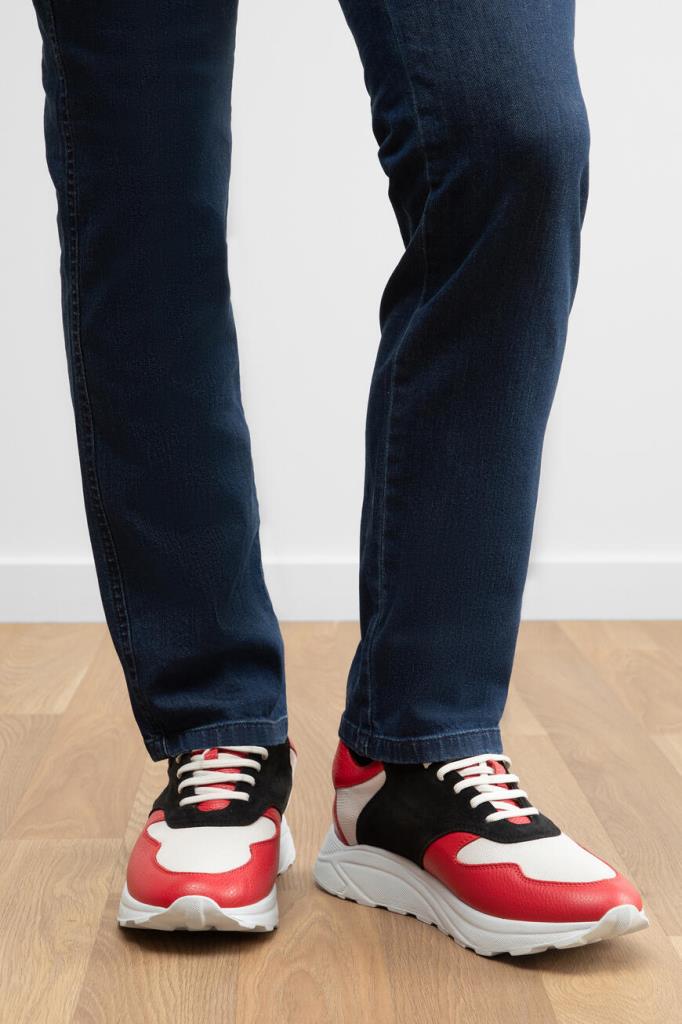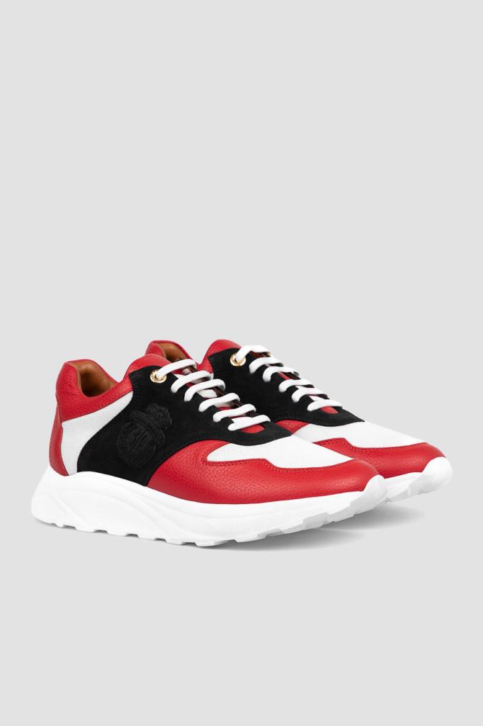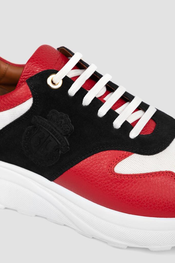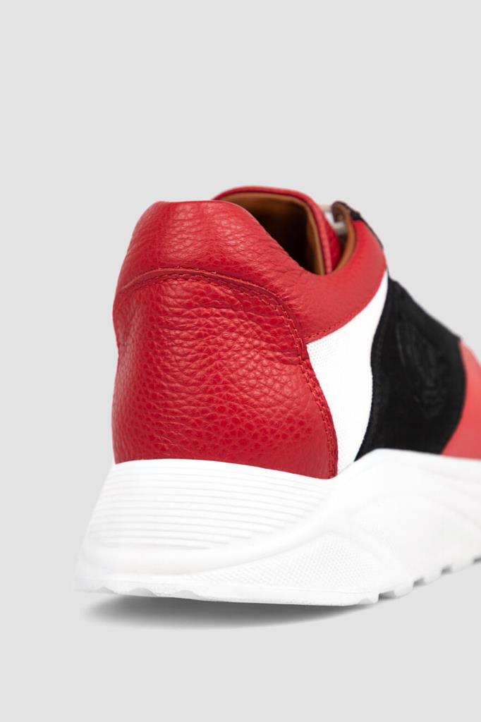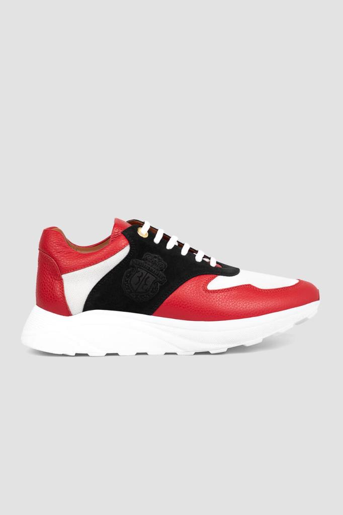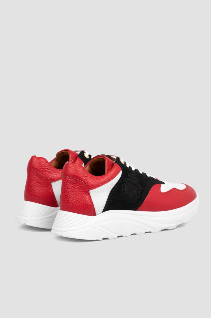 Яркие стильные мужские кроссовки Billionaire из мягкой натуральной зернистой кожи красного цвета со вставками из мягкой чёрной замши и белыми контрастными вставками из микросетки. Модель с комфортной колодкой, закрытой белой шнуровкой и объемной контрастной белой подошвой с фирменным рифлением и нескользящим покрытием. Боковины украшены фирменными лого бренда.