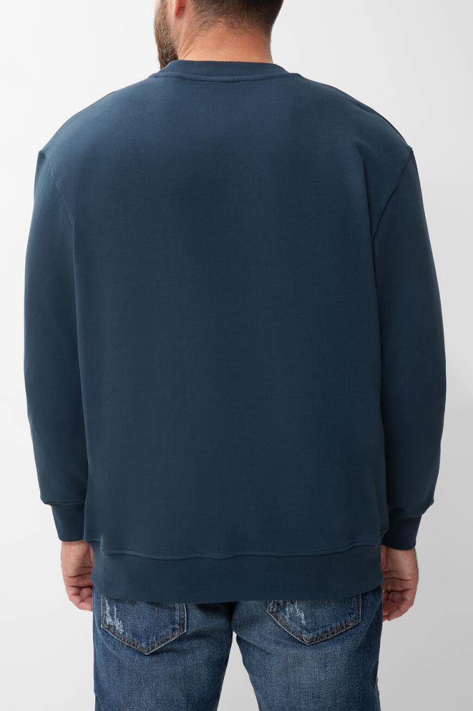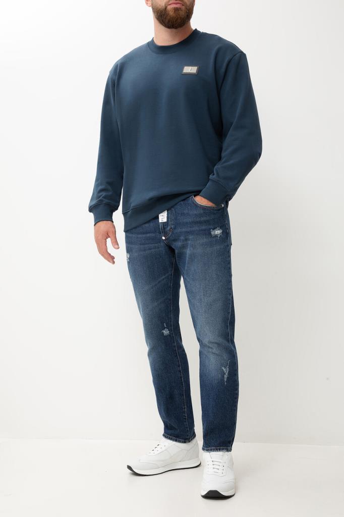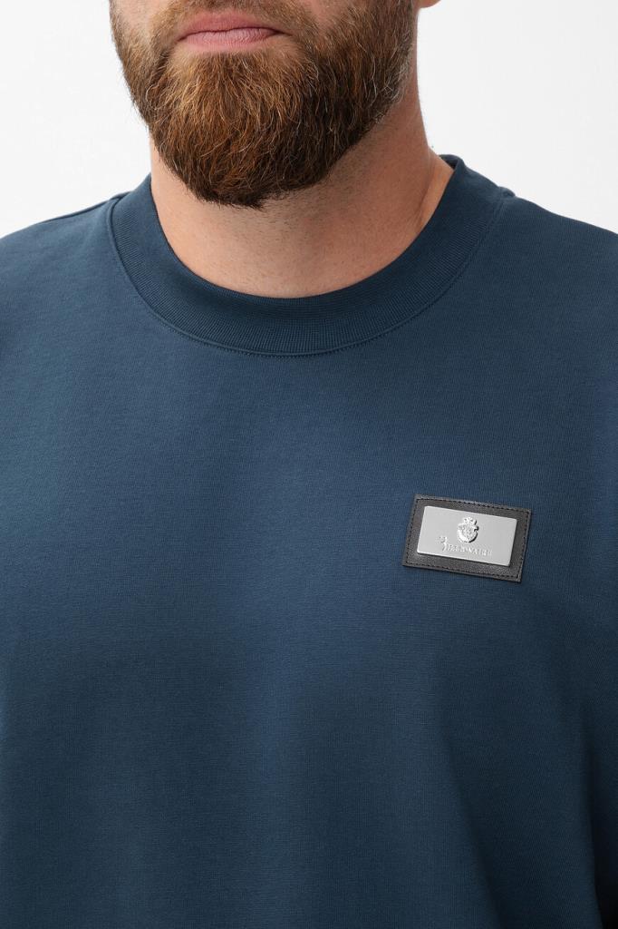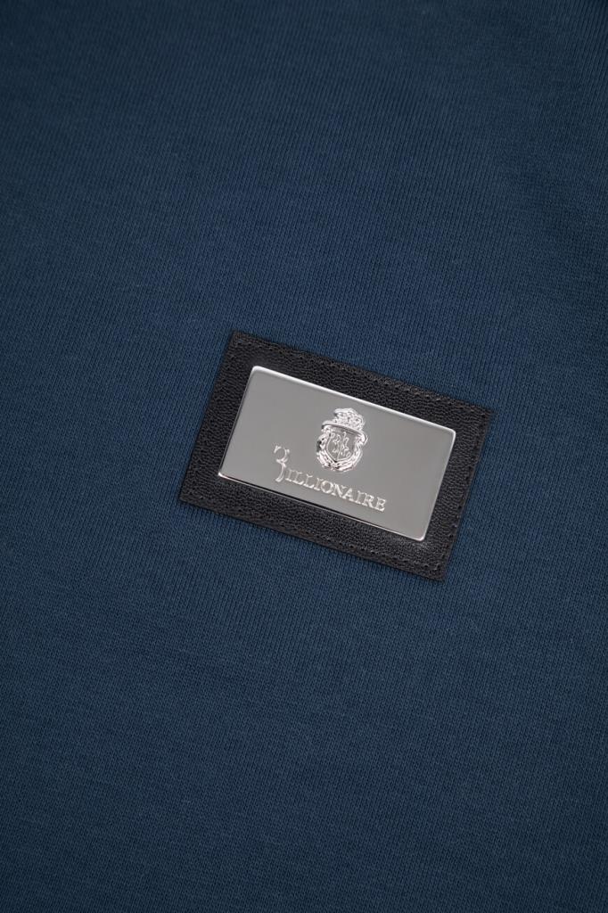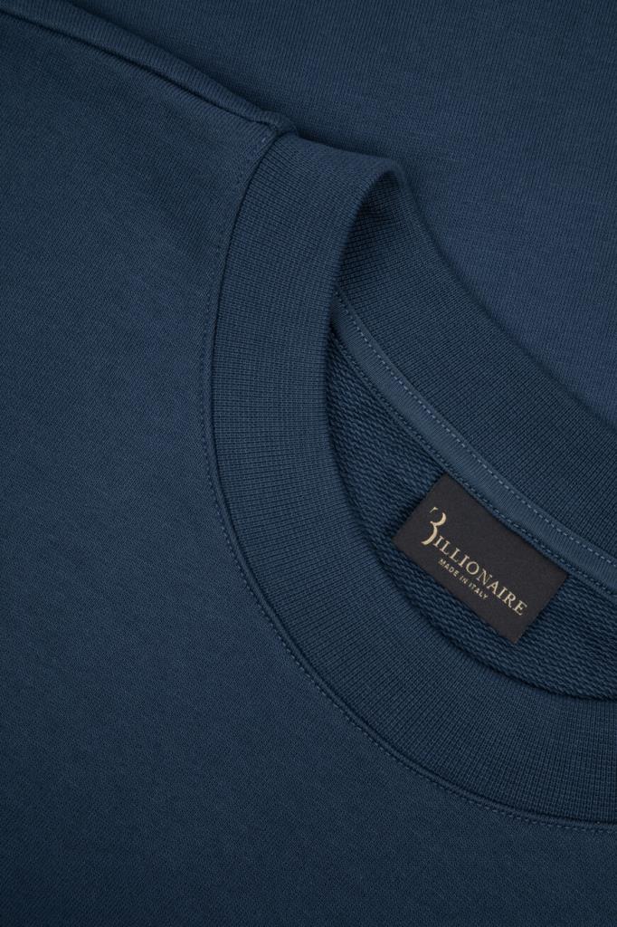 Свитшот с культовой символикой бренда Billionaire. Для пошива модели прямого силуэта используется синий хлопковый трикотаж. Мягкий материал поддерживает комфортный микроклимат, не сковывает движения и не пилингуется со временем. На принадлежность изделия Дому указывают чёрная кожаная нашивка с металлическим лейблом слева на груди и миниатюрный флаг Италии сбоку слева.