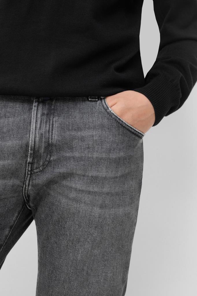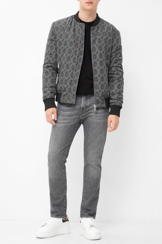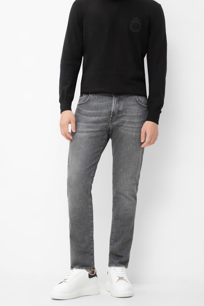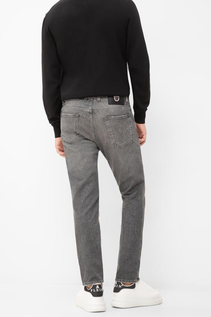 Хлопковые джинсы Billionaire с пятью карманами. Добавление небольшого количества эластичных волокон в состав материала обеспечивает комфортную посадку модели по фигуре. Изделие выполнено в сером цвете с эффектом делаве и дизайнерскими разрывами. Декором выступают брендированная вставка на маленьком кармане спереди и чёрная кожаная накладка с серебристым металлическим гербом Дома на поясе сзади.