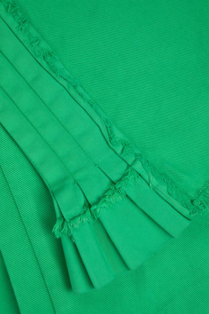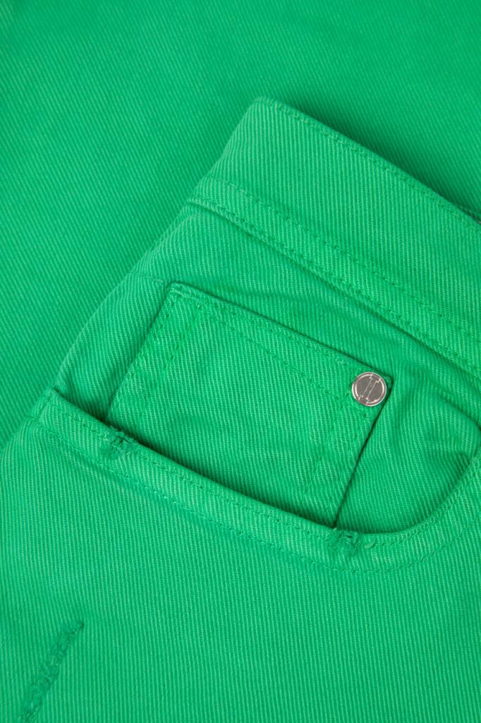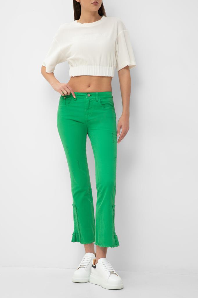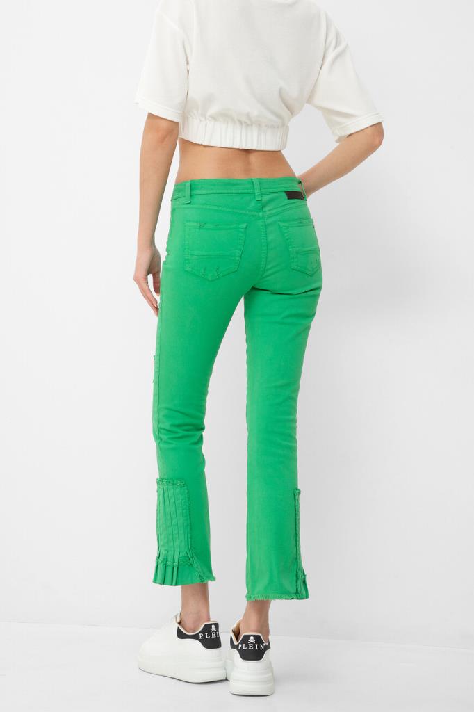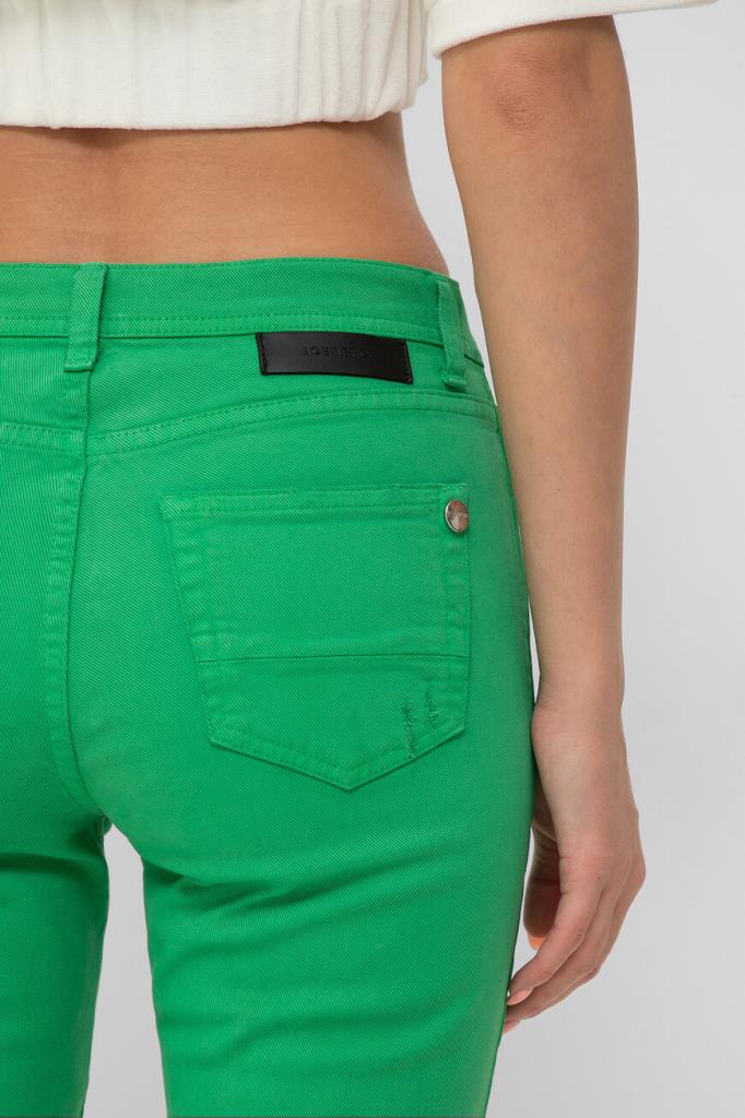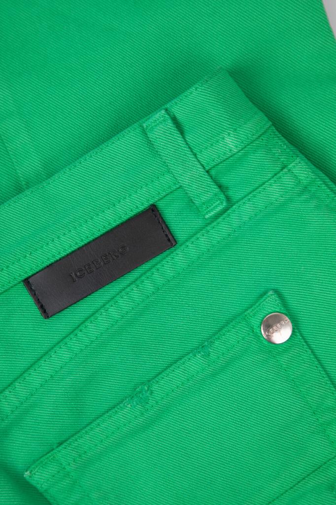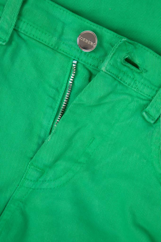Женские джинсы от итальянской марки ICE iceberg. Изготовлены из плотного денима. Натуральный хлопковый материал очень гигеничен. Он хорошо пропускает воздух и впитывает влагу, удерживает тепло. Модель насыщенно ярко-зеленого цвета, расклешенного кроя. Верх классический, пятикарманный с застёжкой на молнию и брендированную пуговицу-клепку. Фирменные детали: дизайнерские потертости, нижняя часть брюк оставлена необработанной, декоративная плиссировка в нижней части брючин.