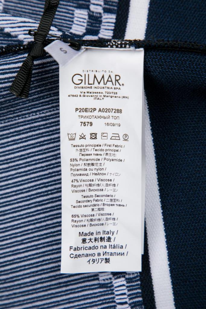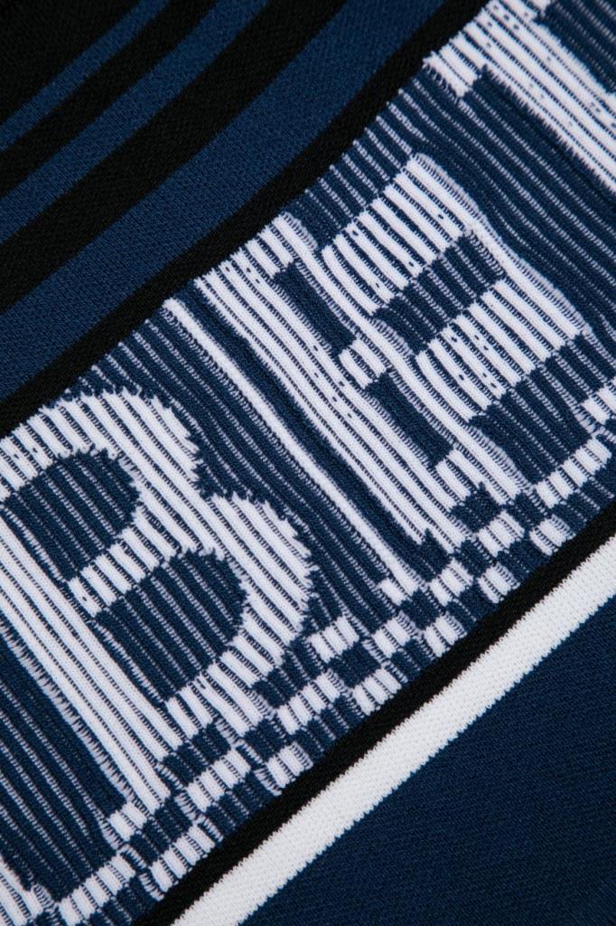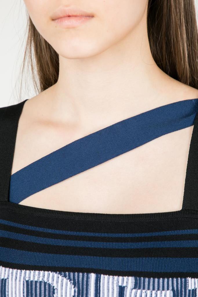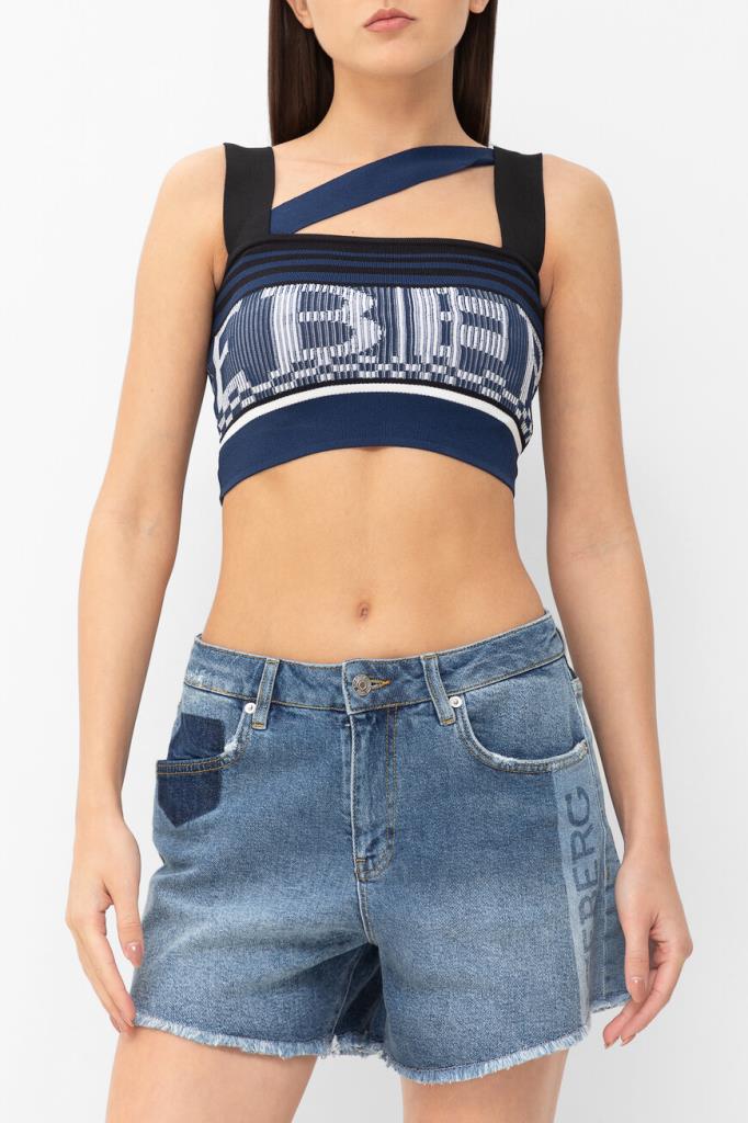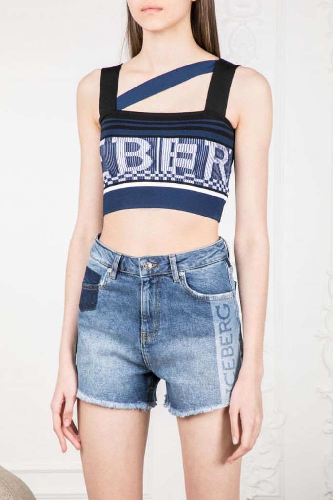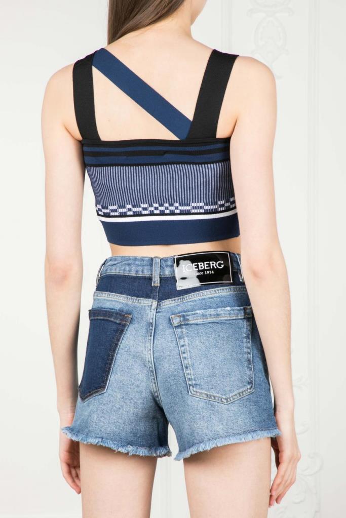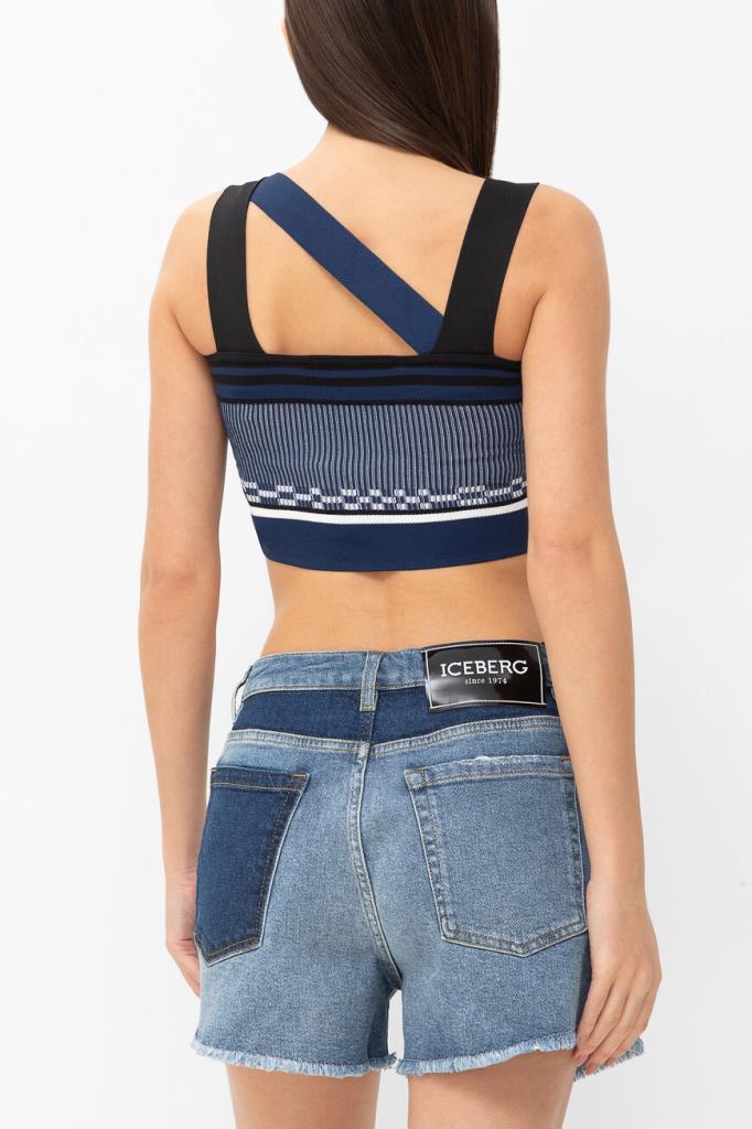 Облегающий топ без рукавов от бренда ICEBERG. Укороченная модель изготовлена из мягкого трикотажа на основе прочного нейлона и вискозного волокна в чёрно-белой-синей гамме. Изделие украшает геометрический мотив в полоску и крупная белая символика Дома спереди и сзади.