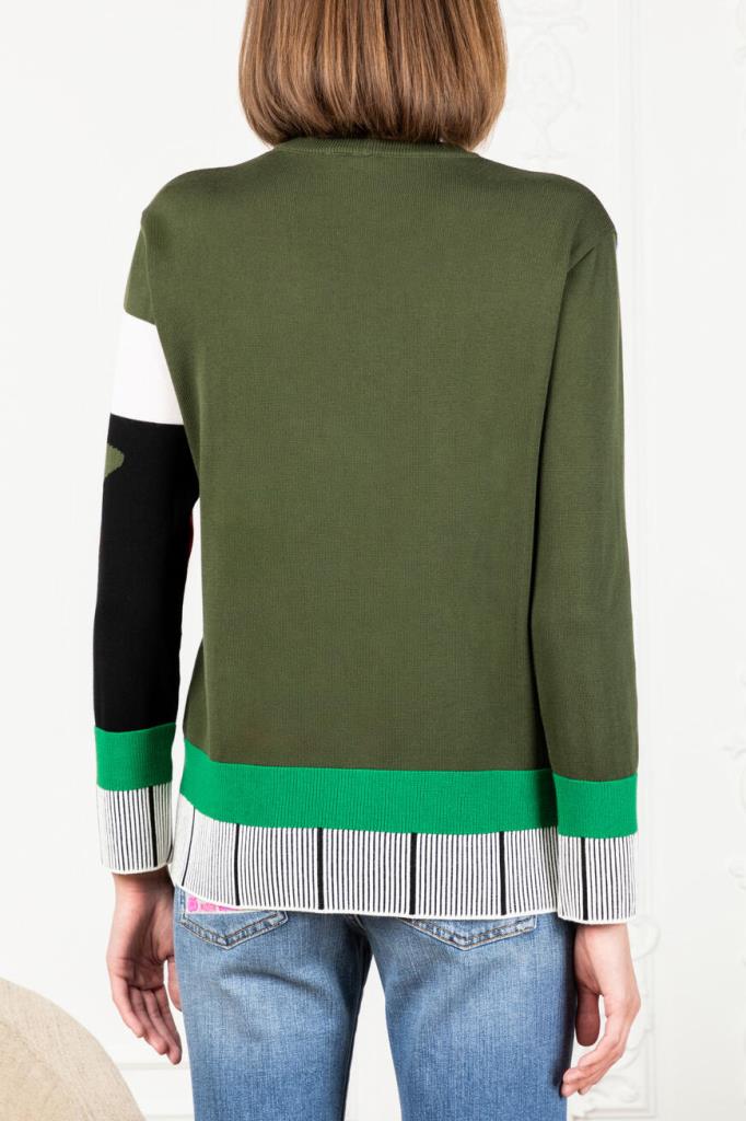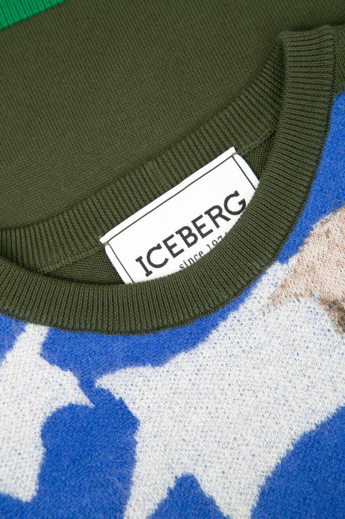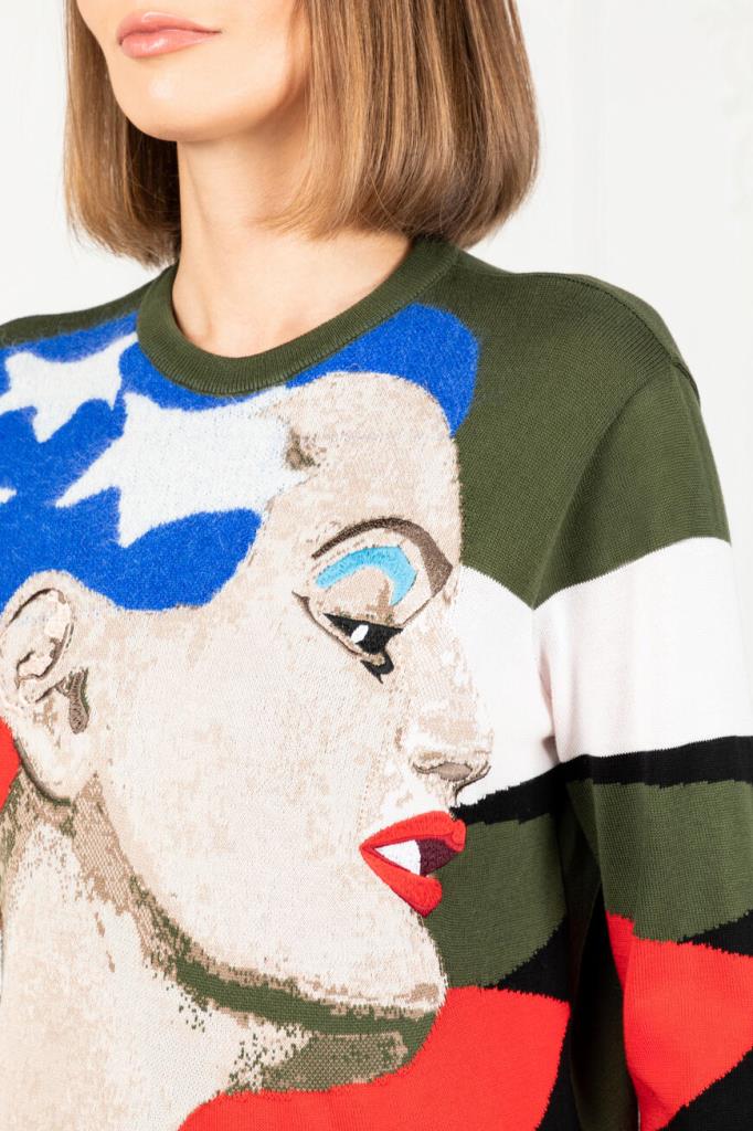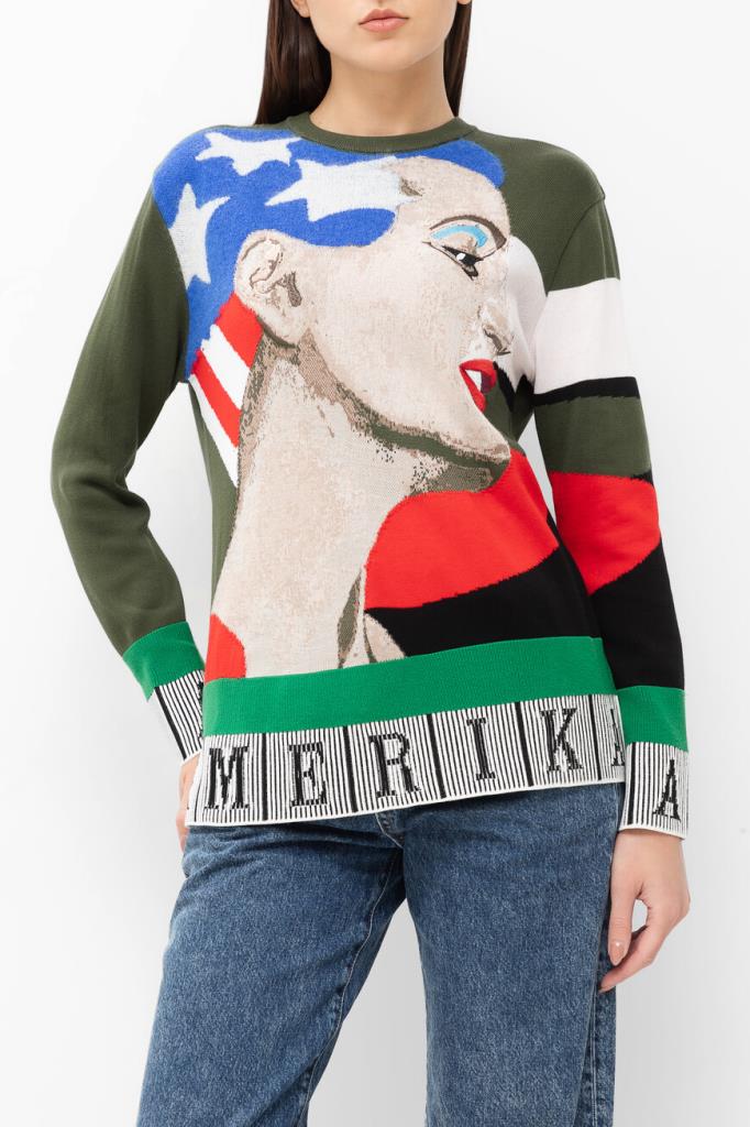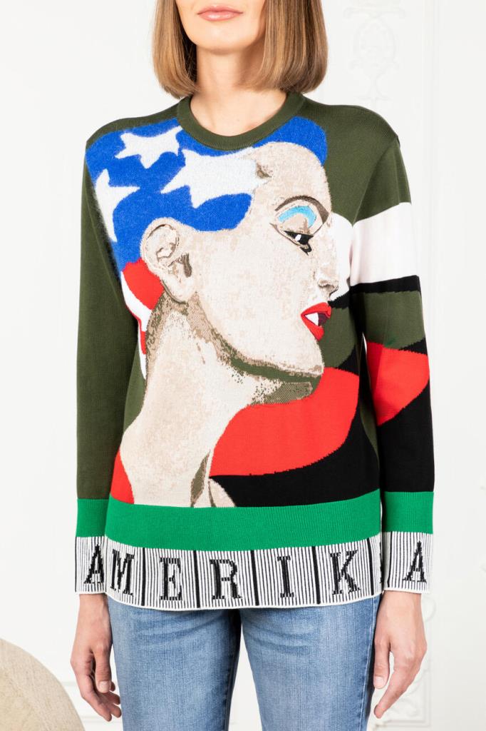 Комбинированный свитер прямого силуэта от бренда ICEBERG. Основа изделия выполнена из мягкого хлопкового трикотажа в оттенке хаки. Отличительными особенностями модели стали чулочная вязка и разноцветные вставки с американской символикой, изготовленные из других материалов: натуральной шерсти, прочного нейлона и мохера. Спереди расположен крупный принт с изображением человеческой головы и элементами вышивки, а низ украшают зелёная полоса и геометрический мотив в чёрно-белую полоску с надписью «AMERIKA».