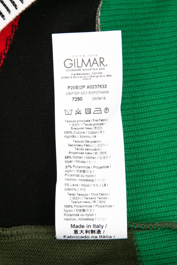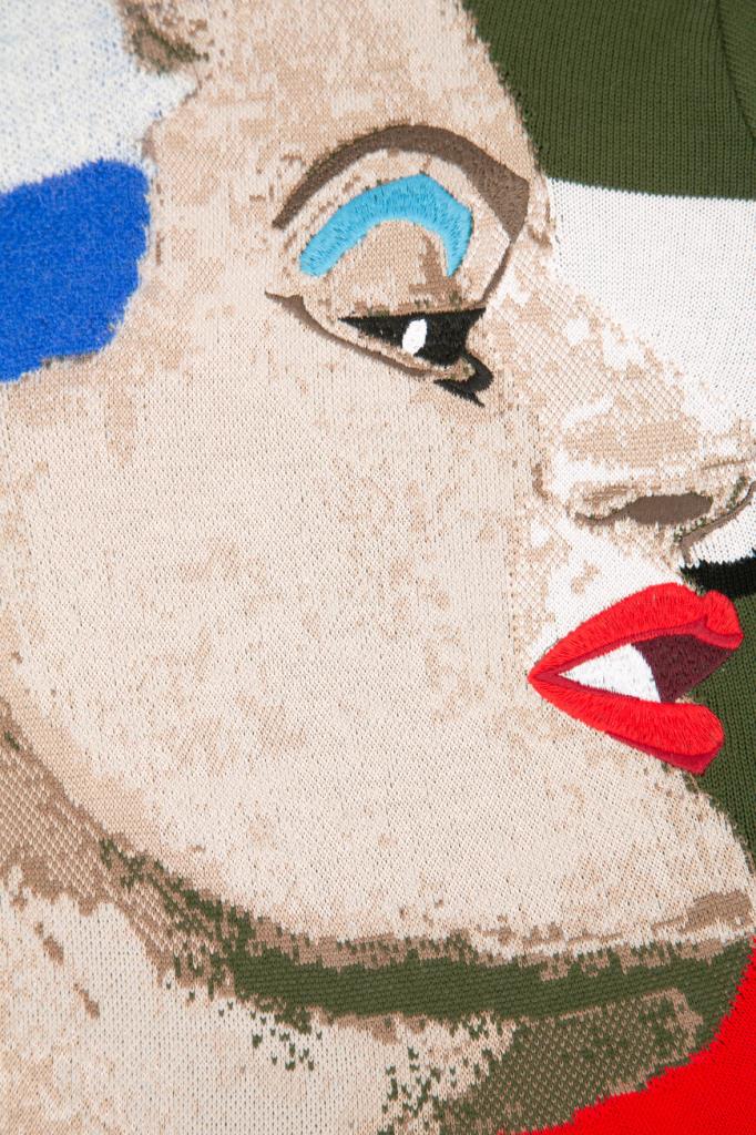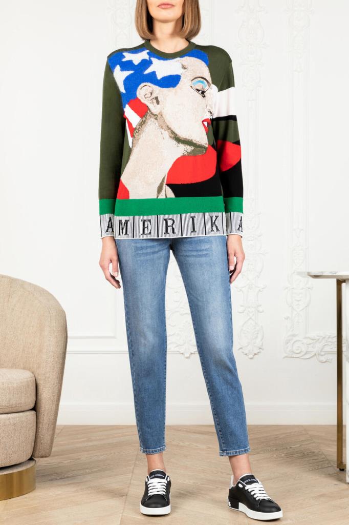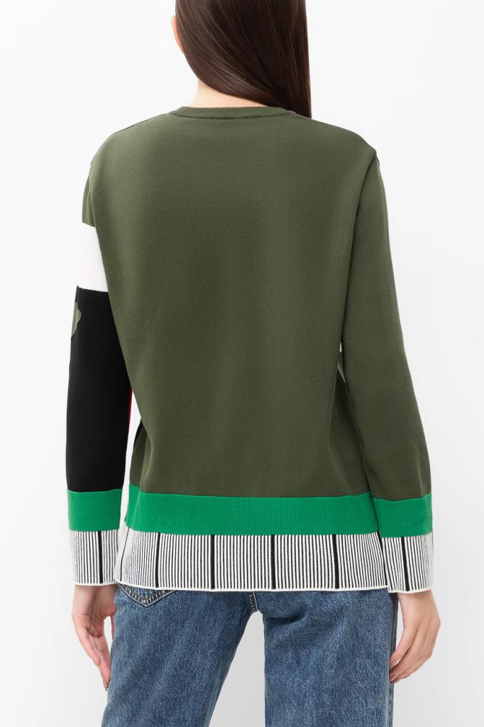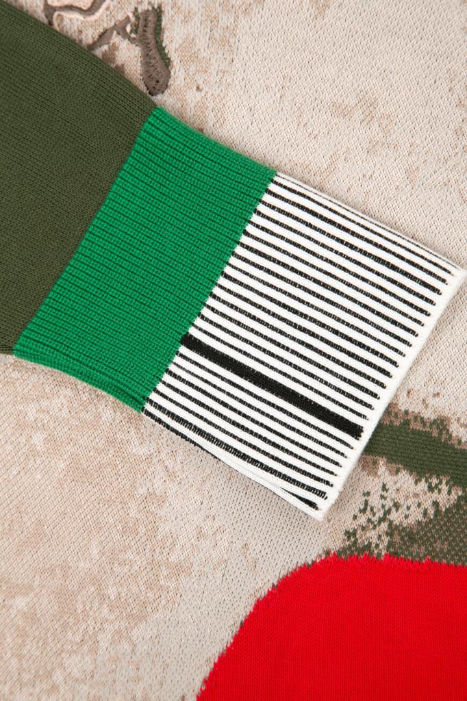 Комбинированный свитер прямого силуэта от бренда ICEBERG. Основа изделия выполнена из мягкого хлопкового трикотажа в оттенке хаки. Отличительными особенностями модели стали чулочная вязка и разноцветные вставки с американской символикой, изготовленные из других материалов: натуральной шерсти, прочного нейлона и мохера. Спереди расположен крупный принт с изображением человеческой головы и элементами вышивки, а низ украшают зелёная полоса и геометрический мотив в чёрно-белую полоску с надписью «AMERIKA».