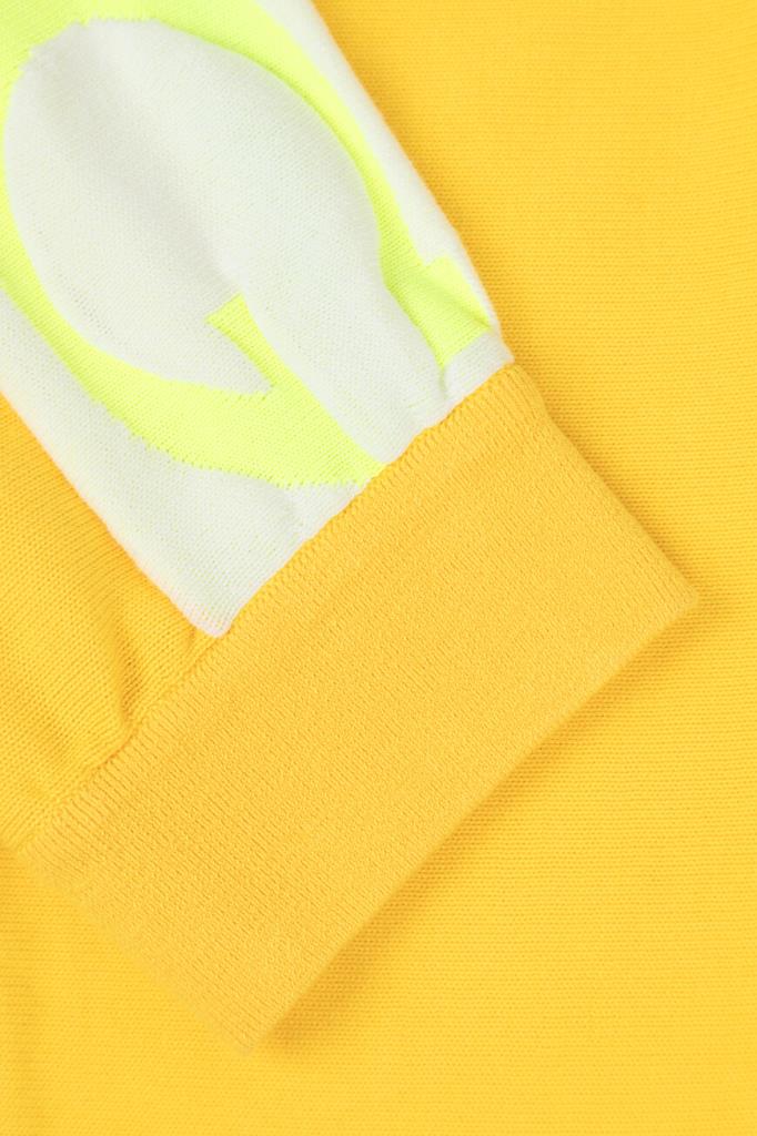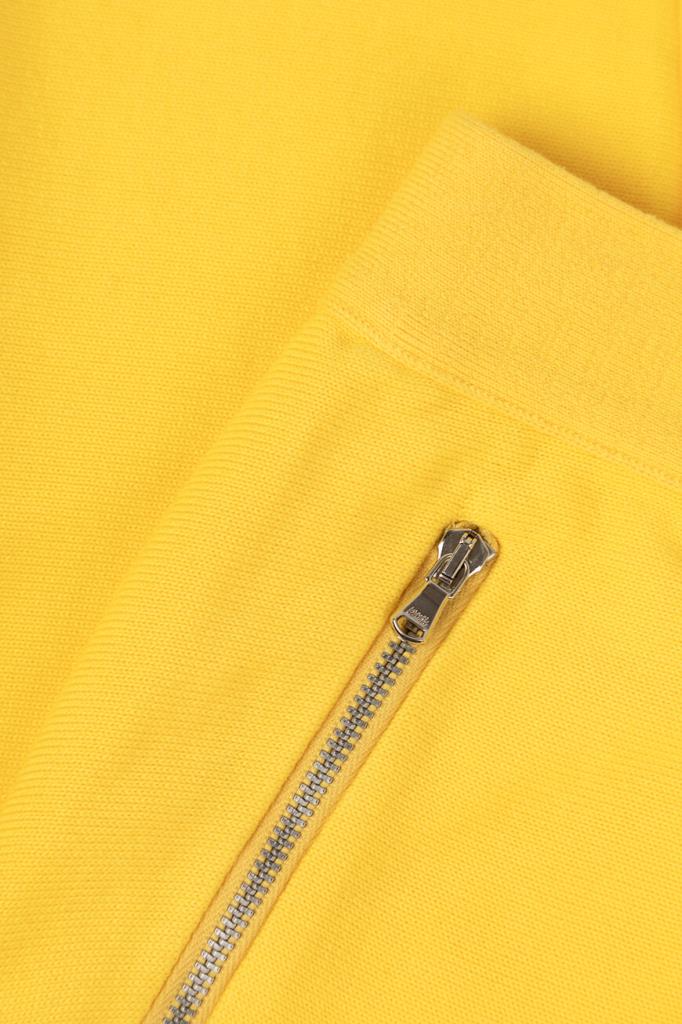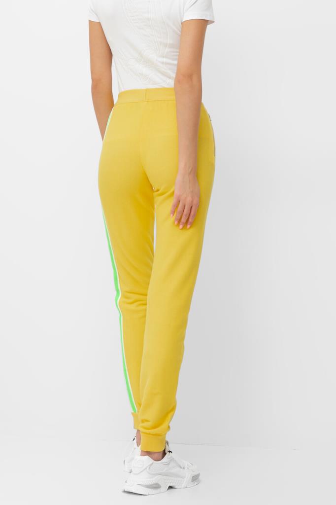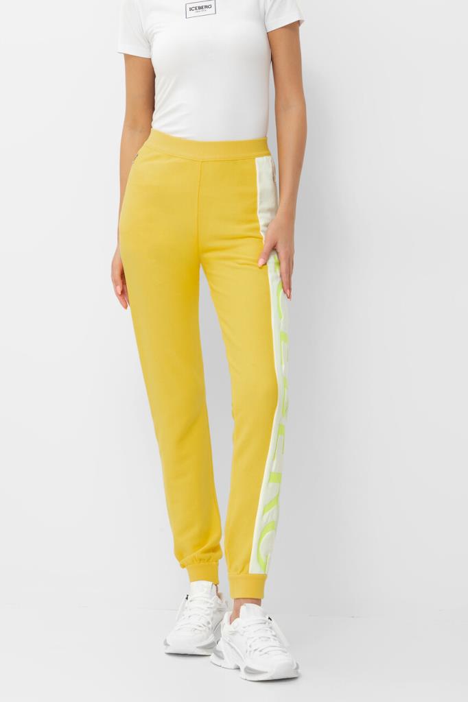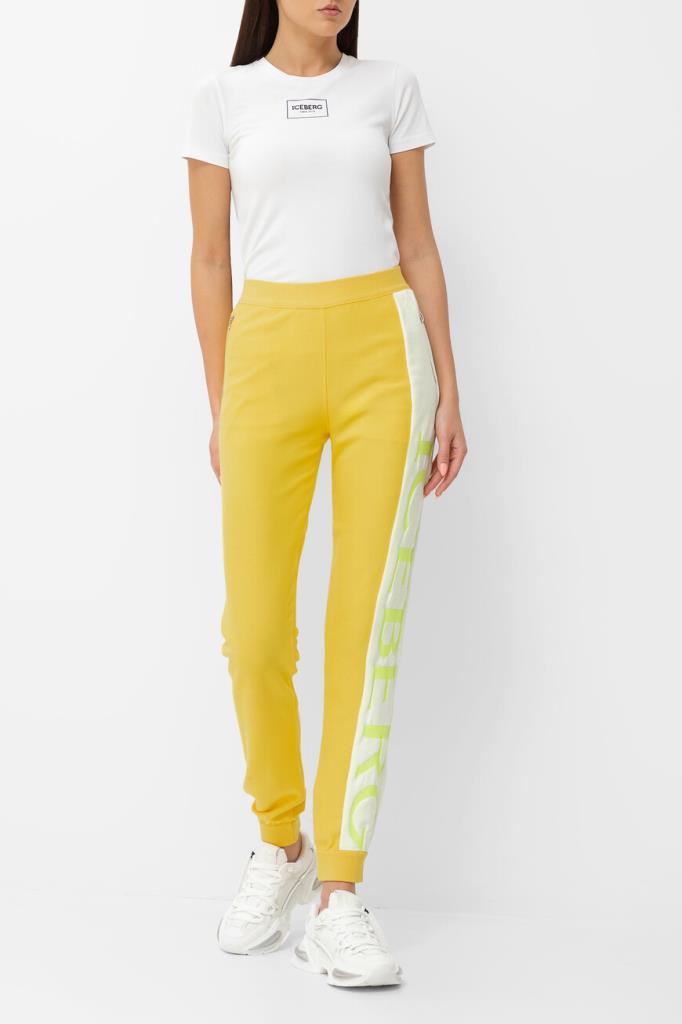 Оригинальные женские спортивные брюки ICEBERG из мягкого хлопкового трикотажа яркого жёлтого оттенка. Модель комфортного, чуть зауженного книзу кроя, с эластичным поясом, двумя прорезными карманами на молнии по бокам и манжетами снизу на резинке. Левую брючину украшает контрастная белая вставка с фирменным лого и стильная бело-зелёная полоска.