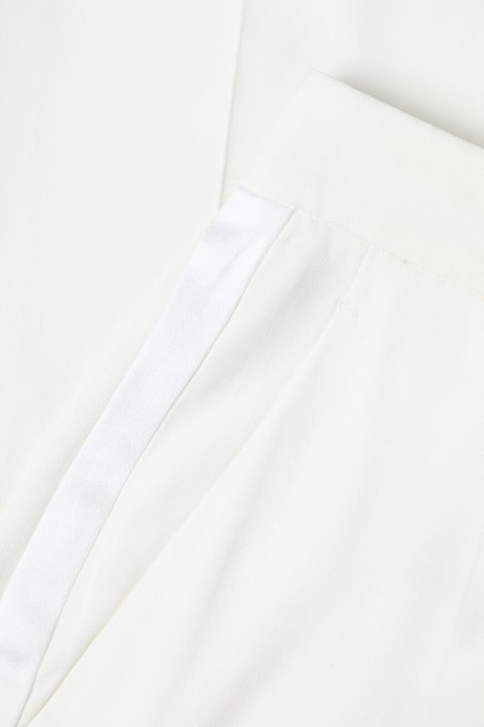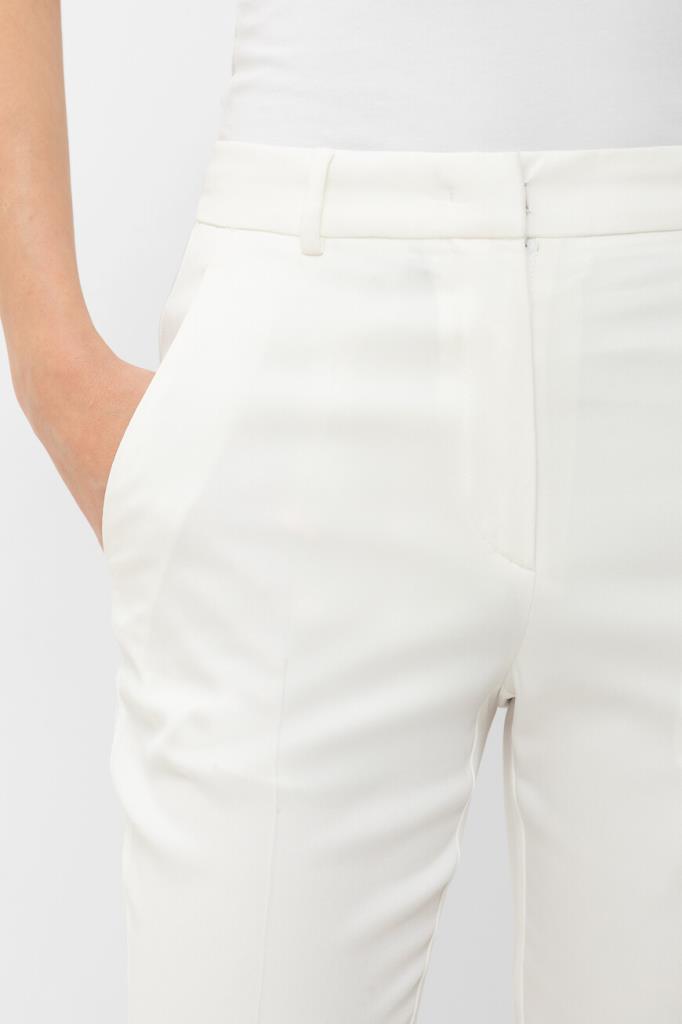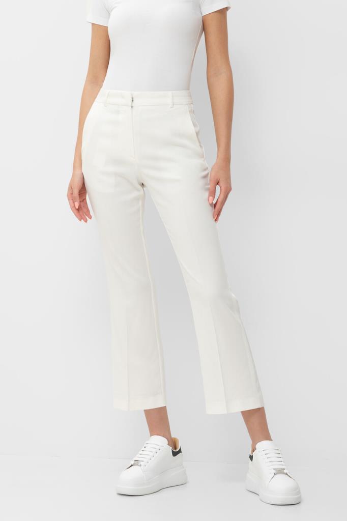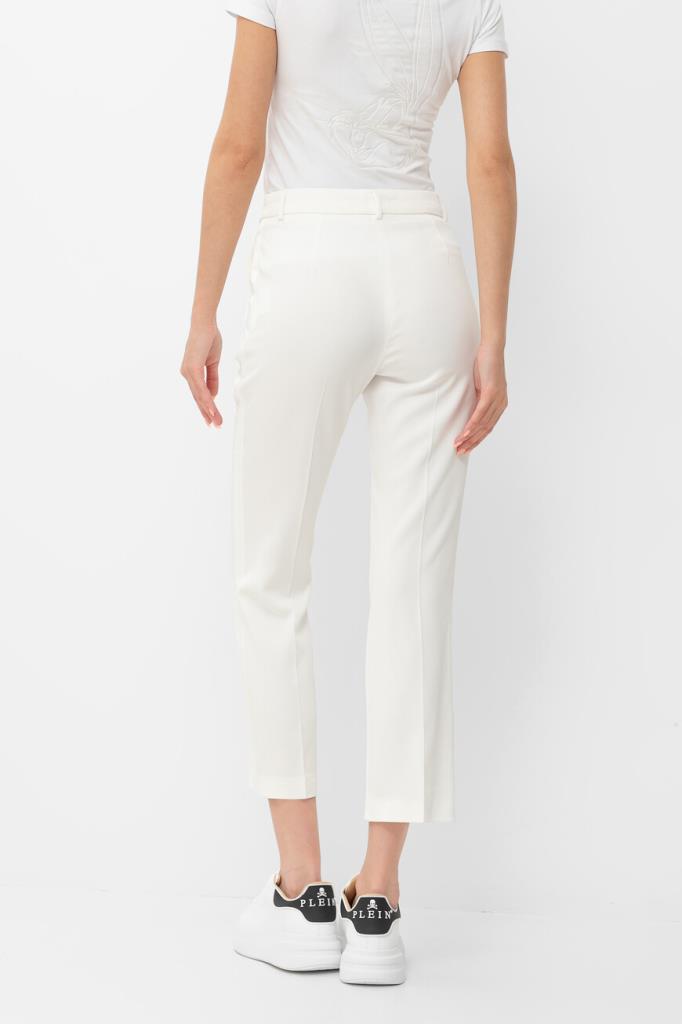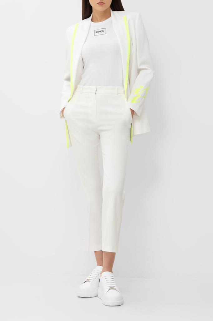 Женские брюки ICEBERG из мягкого эластичного вискозного джерси универсального белого цвета. Стильная укороченная модель комфортного прямого, слегка расклешенного книзу кроя, с плотным поясом со шлевками под ремень, классическими стрелками, двумя прорезными карманами по бокам и удобной застёжкой на молнию и крючок с планкой. Фишка изделия: эффектные блестящие атласные глянцевые полосы-ленты на лампасах.