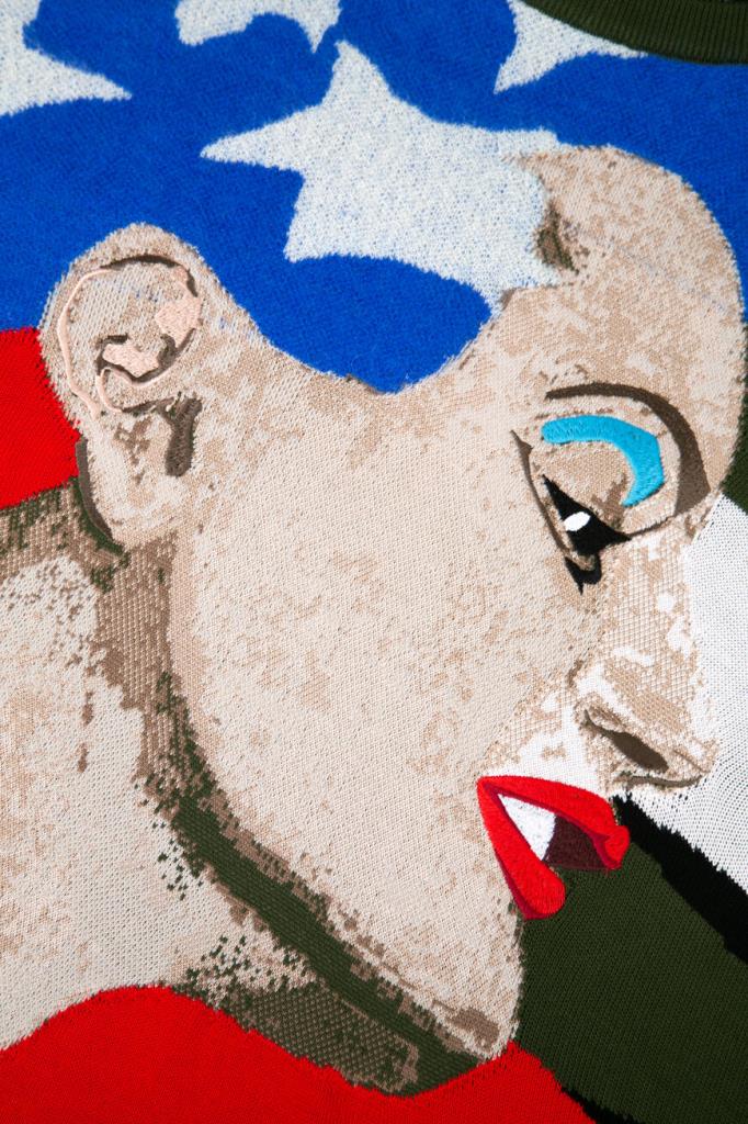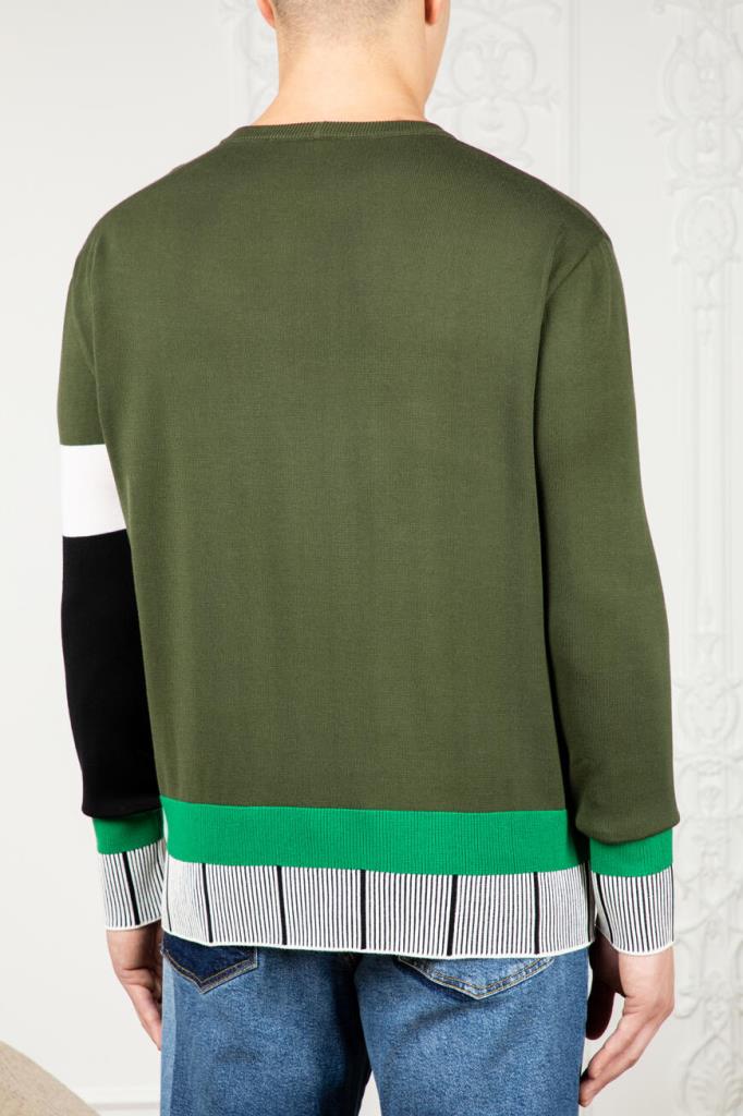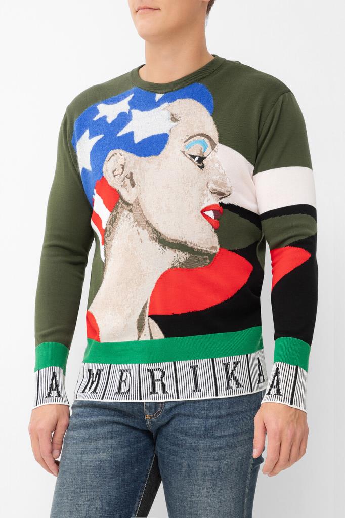 Комбинированный свитер прямого силуэта от бренда ICEBERG. Основа изделия выполнена из мягкого хлопкового трикотажа в оттенке хаки. Отличительными особенностями модели стали чулочная вязка и разноцветные вставки с американской символикой, изготовленные из других материалов: натуральной шерсти, прочного нейлона и мохера. Спереди расположен крупный принт с изображением человеческой головы и элементами вышивки, а низ украшают зелёная полоса и геометрический мотив в чёрно-белую полоску с надписью «AMERIKA».