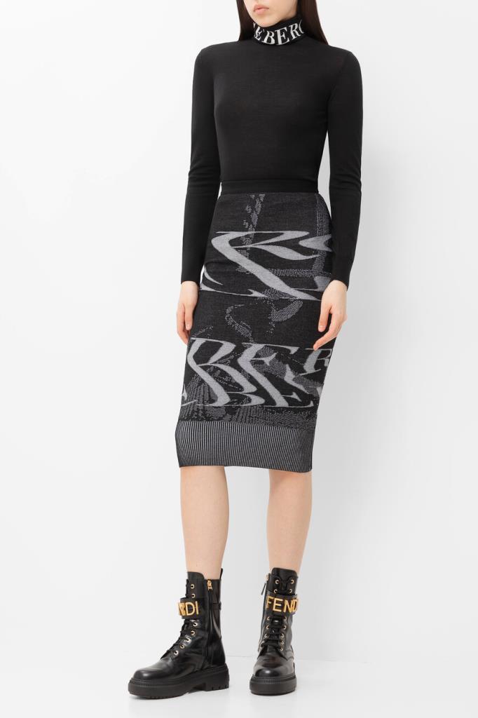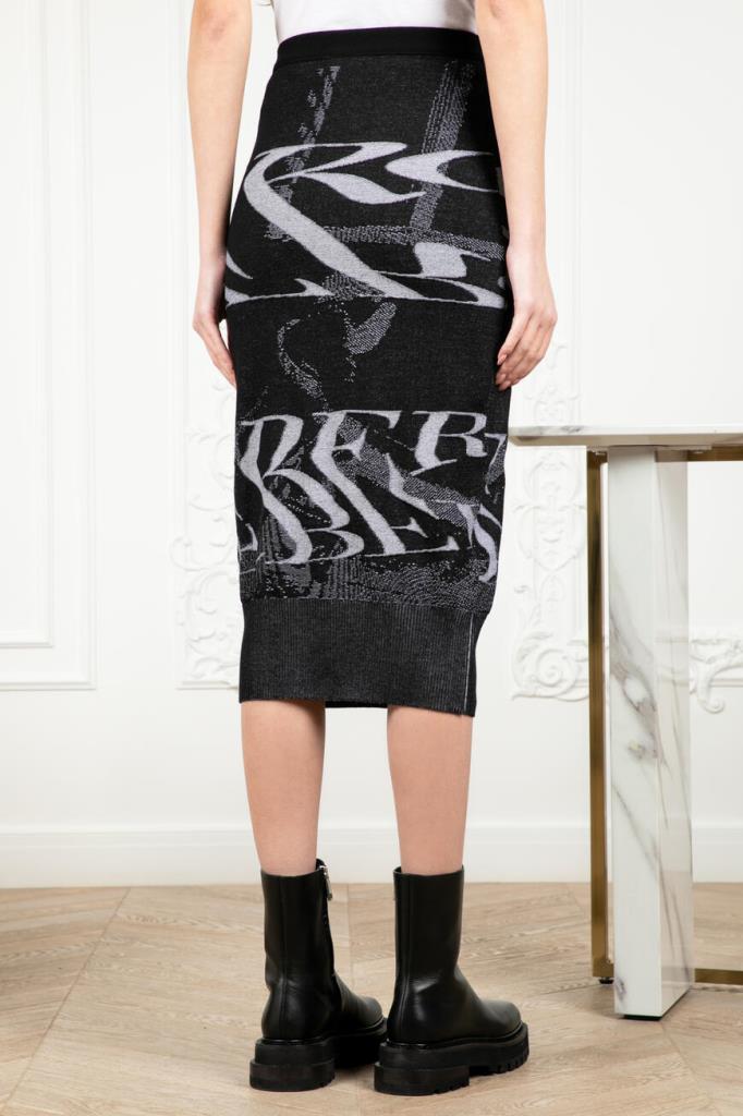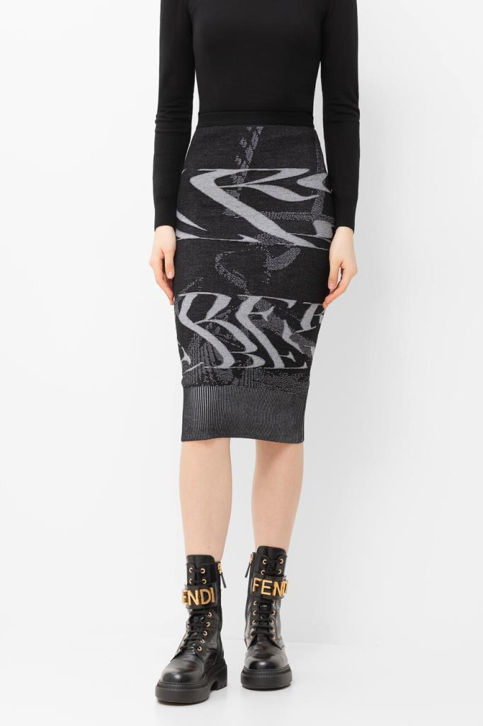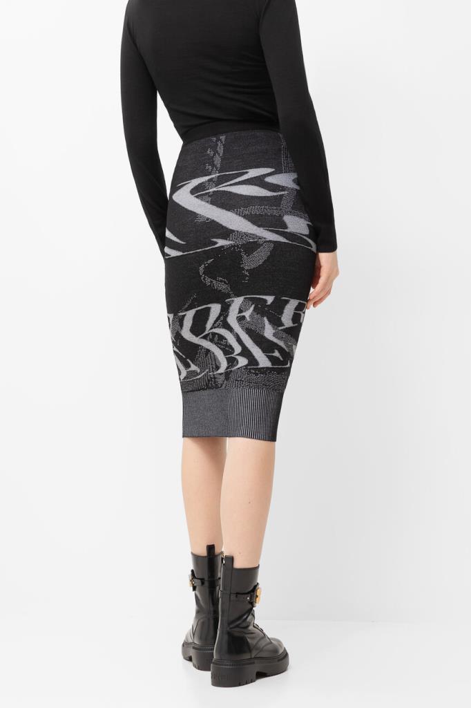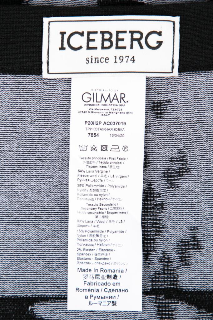 Облегающая юбка фасона карандаш от бренда ICEBERG. Модель-миди из мягкого трикотажа на основе деликатной вирджинской шерсти и прочного нейлона окрашена в графитовый оттенок и украшена абстрактным дизайнерским принтом со знаковой символикой Дома, выполненным в серой гамме. Изделие можно сочетать с чёрной водолазкой или брендированным свитером из той же коллекции.