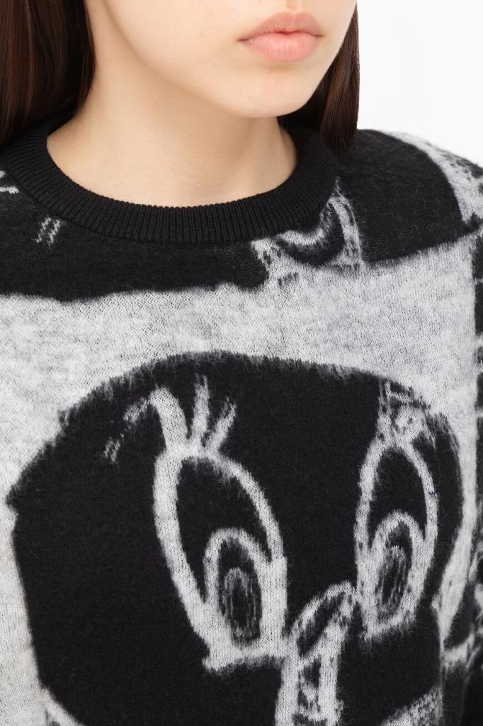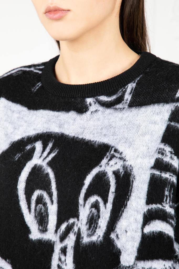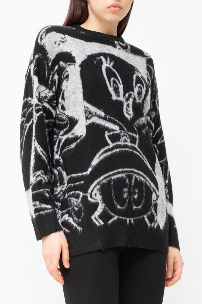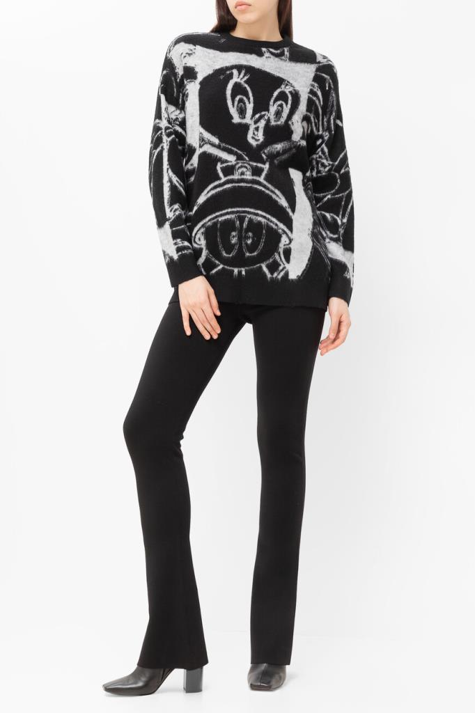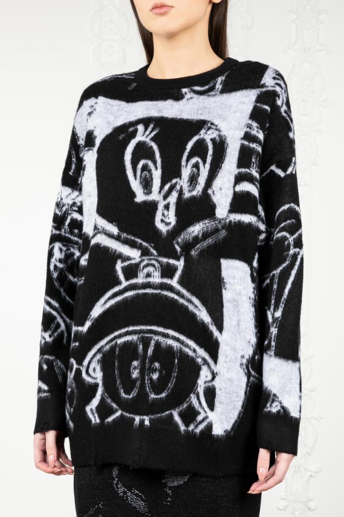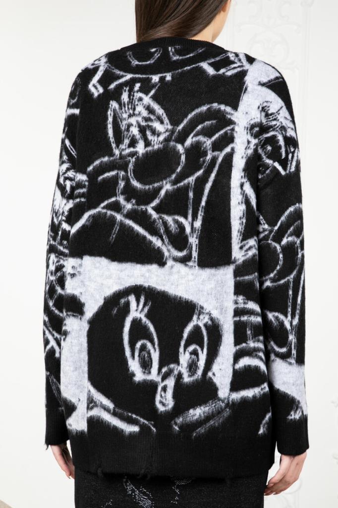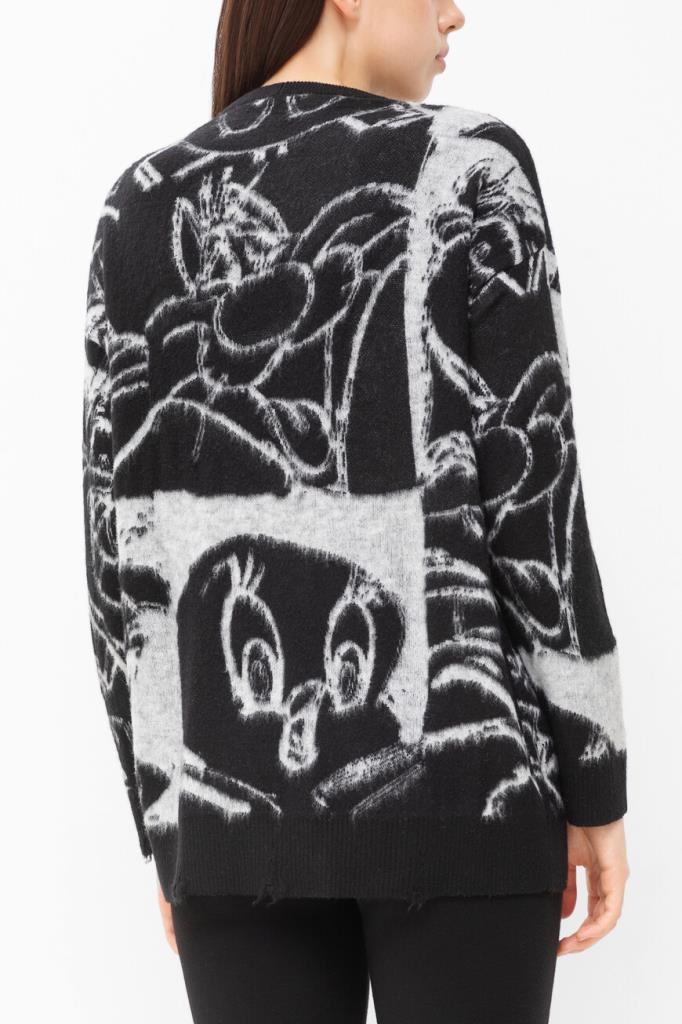 Вязаный свитер ICEBERG с ворсистой поверхностью. Удлинённая модель изготовлена из деликатной вирджинской шерсти и акрила чёрного цвета с контрастным дизайнерским принтом с персонажами мультсериала “LOONEY TUNES”. Изделие прямого силуэта составит идеальный комплект с парным кардиганом из той же коллекции.