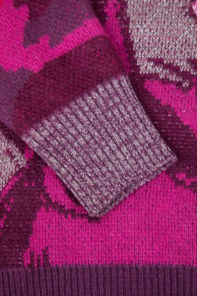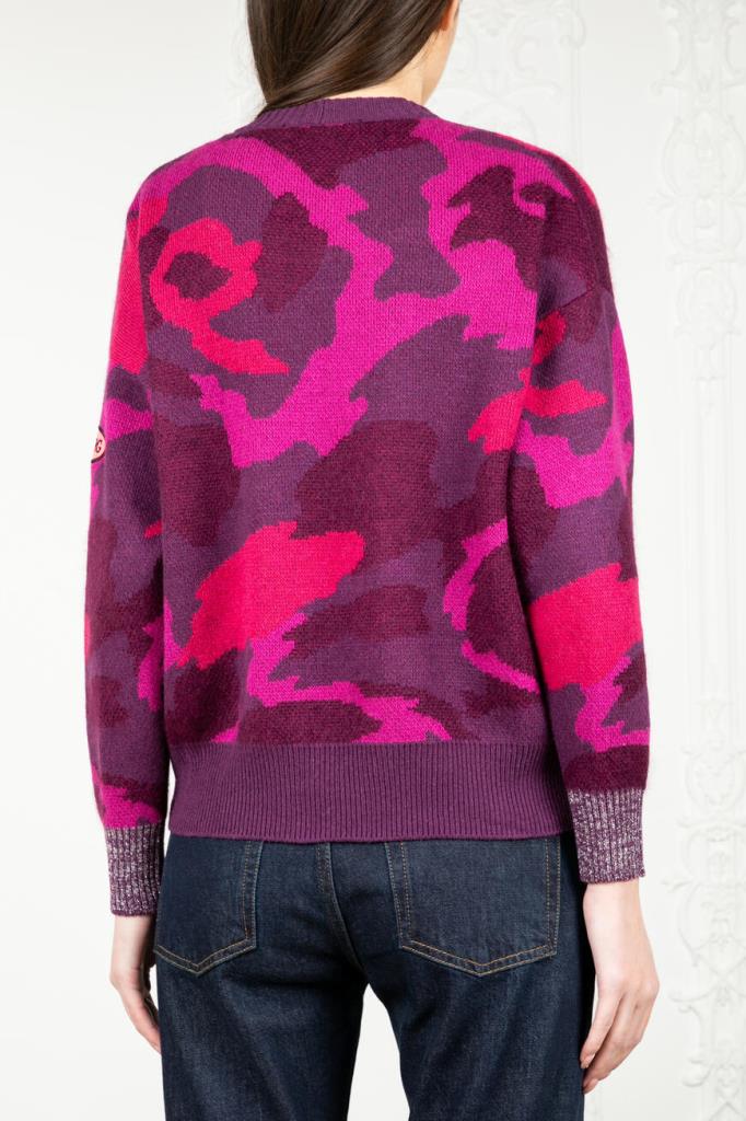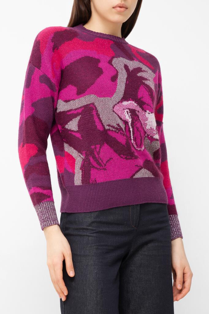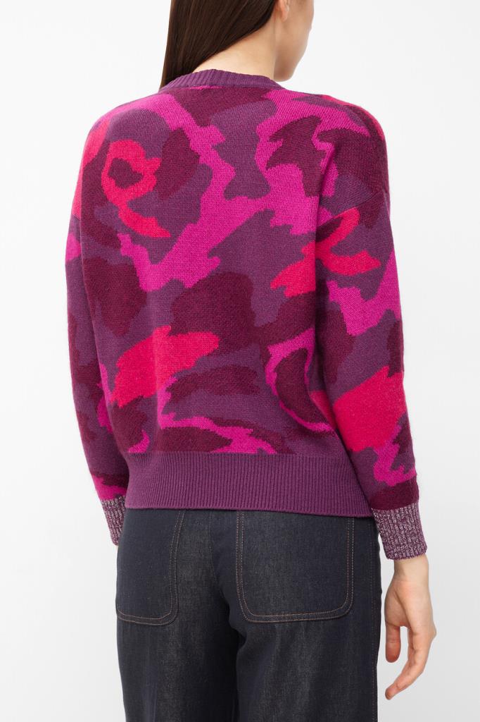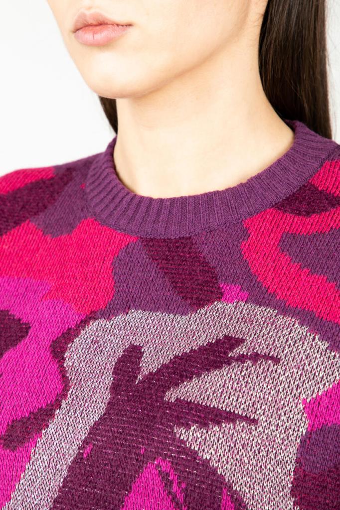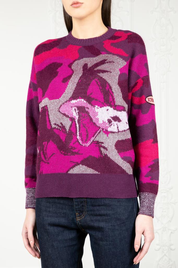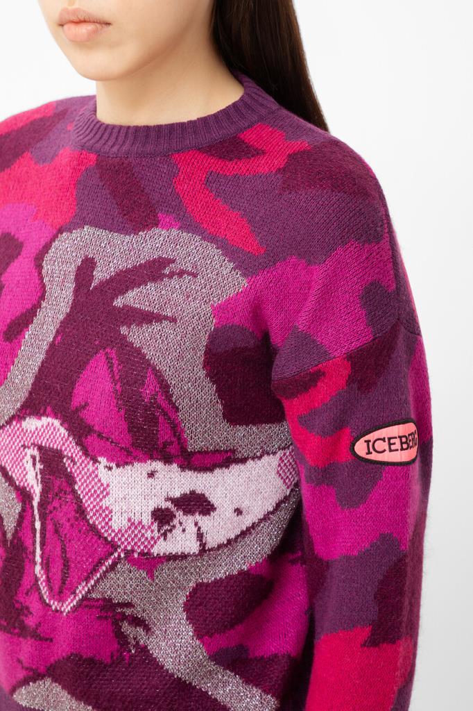 Эффектный женский джемпер ICEBERG из мягкого трикотажа на основе прочного синтетического износостойкого материала, фирменного нейлона, натуральной шерсти, фирменного кашемира, вискозного волокна и пряжи из шерсти ангорской козы (мохера) с оригинальным камуфляжным узором в розовых оттенках по всей поверхности изделия. Стильная модель комфортного прямого кроя, с круглым вырезом горловины с фактурой в рубчик, длинными рукавами с серыми манжетами на резинке с заметным меланжем и широкой манжетой снизу также с фактурой в рубчик. Фишка изделия: контрастная светло-розовая нашивка-патч с вышитой чёрной фирменной надписью бренда на левом рукаве. Превосходное дизайнерское решение, отличающее кардиган от остальных моделей - крупный яркий дизайнерский принт с Даффи Даком - персонажем мультсериала “LOONEY TUNES” спереди.