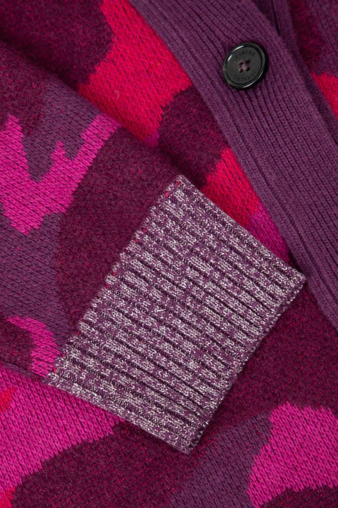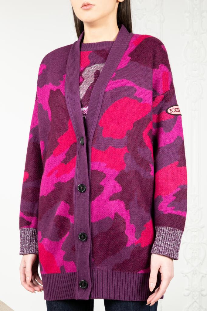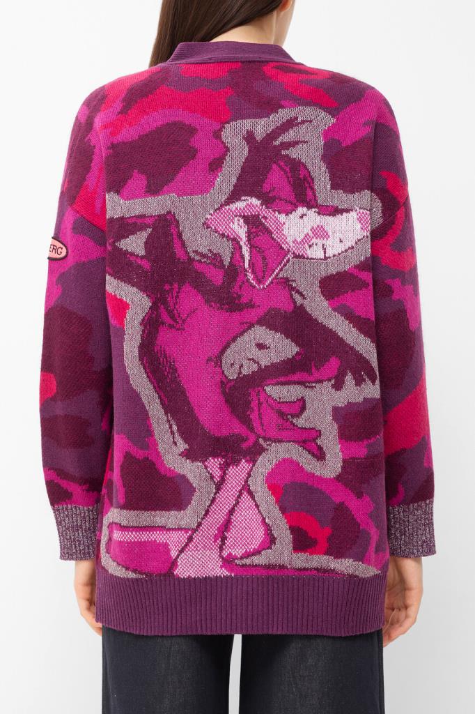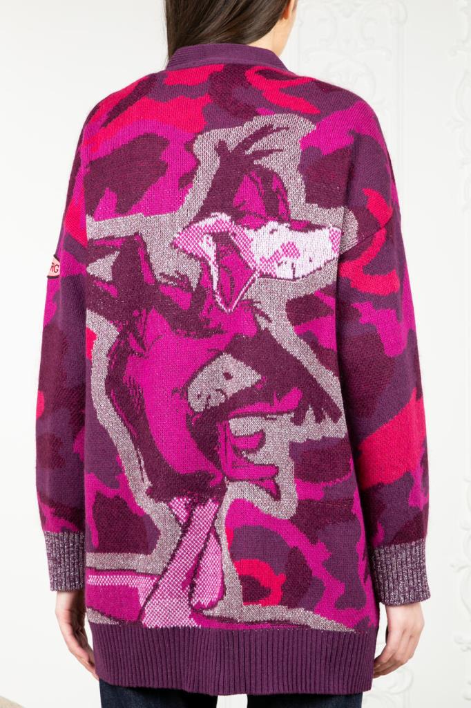Эффектный женский кардиган ICEBERG из мягкого трикотажа на основе прочного синтетического износостойкого материала, фирменного нейлона, натуральной шерсти, фирменного кашемира, вискозного волокна и пряжи из шерсти ангорской козы (мохера) с оригинальным камуфляжным узором в розовых оттенках по всей поверхности изделия. Стильная удлиненная модель комфортного прямого кроя, с изящным V-образным вырезом горловины с фактурой в рубчик, длинными рукавами со спущенным плечом и серыми манжетами на резинке с заметным меланжем, удобной застёжкой на крупные контрастные роговые пуговицы и широкой манжетой снизу также с фактурой в рубчик. Фишка изделия: контрастная светло-розовая нашивка-патч с вышитой чёрной фирменной надписью бренда на левом рукаве. Превосходное дизайнерское решение, отличающее кардиган от остальных моделей - крупный яркий дизайнерский принт с Даффи Даком - персонажем мультсериала “LOONEY TUNES” на спинке сзади.