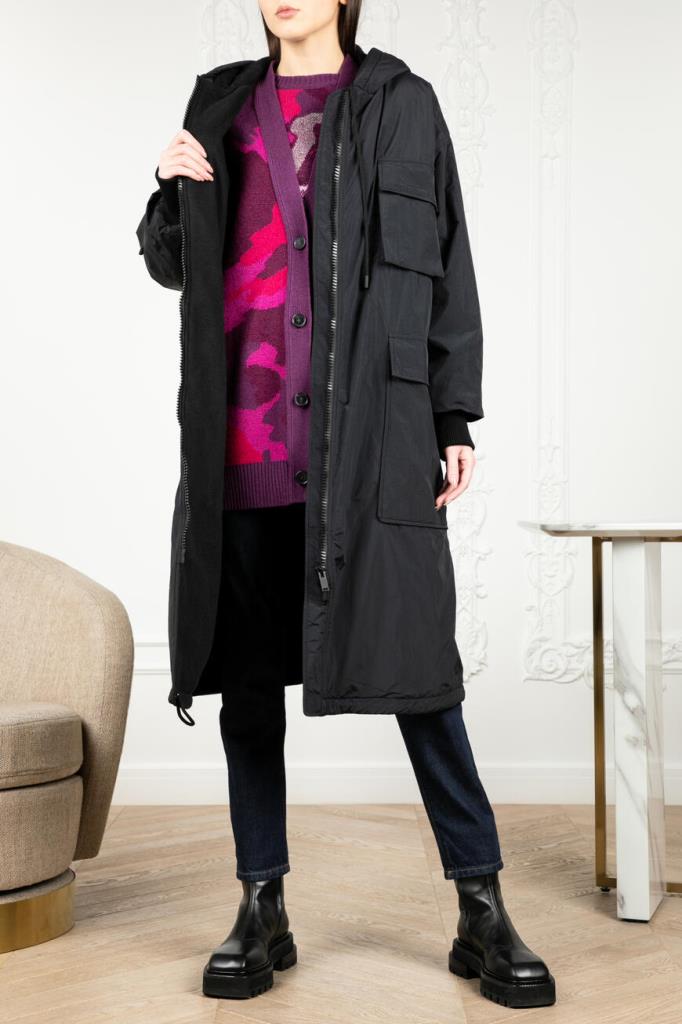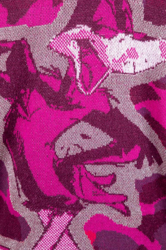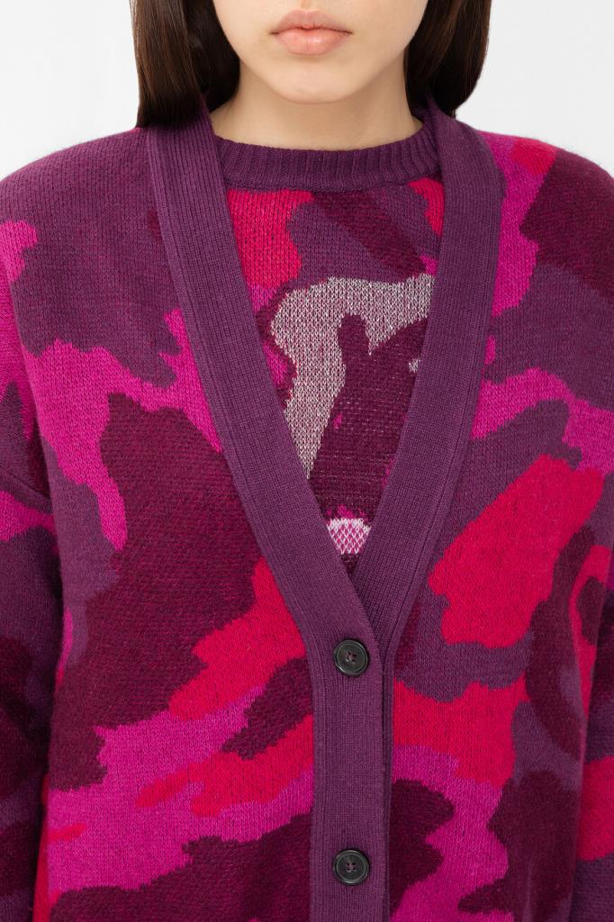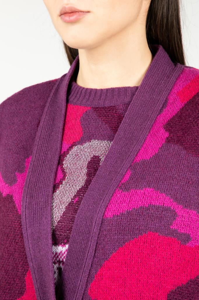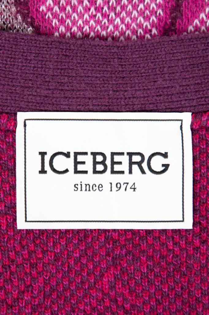 Эффектный женский кардиган ICEBERG из мягкого трикотажа на основе прочного синтетического износостойкого материала, фирменного нейлона, натуральной шерсти, фирменного кашемира, вискозного волокна и пряжи из шерсти ангорской козы (мохера) с оригинальным камуфляжным узором в розовых оттенках по всей поверхности изделия. Стильная удлиненная модель комфортного прямого кроя, с изящным V-образным вырезом горловины с фактурой в рубчик, длинными рукавами со спущенным плечом и серыми манжетами на резинке с заметным меланжем, удобной застёжкой на крупные контрастные роговые пуговицы и широкой манжетой снизу также с фактурой в рубчик. Фишка изделия: контрастная светло-розовая нашивка-патч с вышитой чёрной фирменной надписью бренда на левом рукаве. Превосходное дизайнерское решение, отличающее кардиган от остальных моделей - крупный яркий дизайнерский принт с Даффи Даком - персонажем мультсериала “LOONEY TUNES” на спинке сзади.