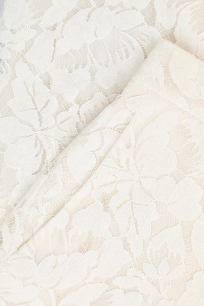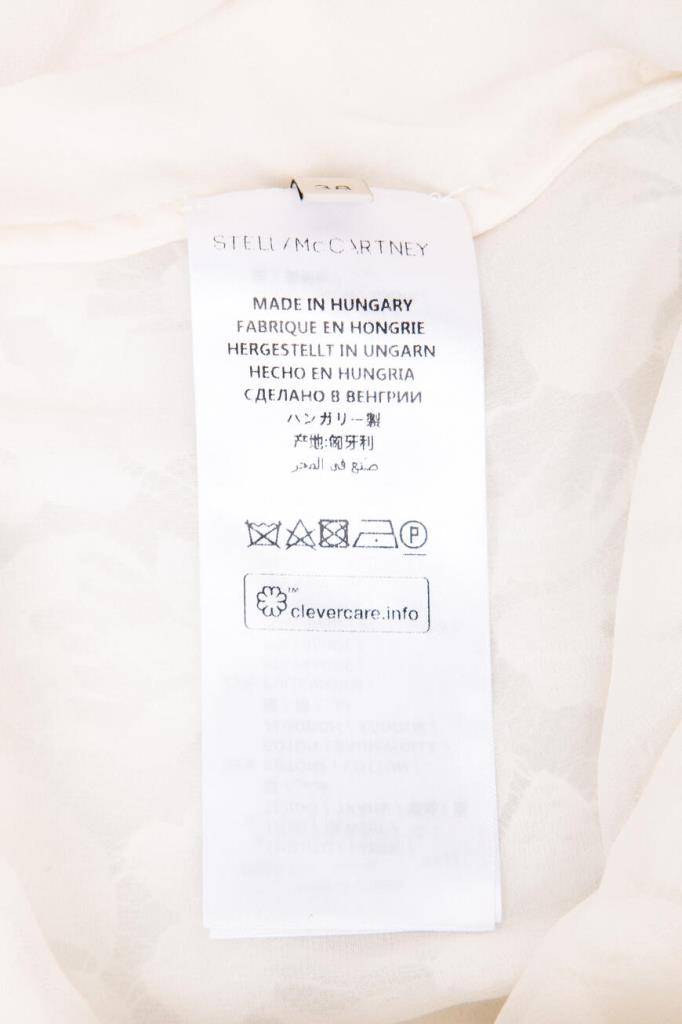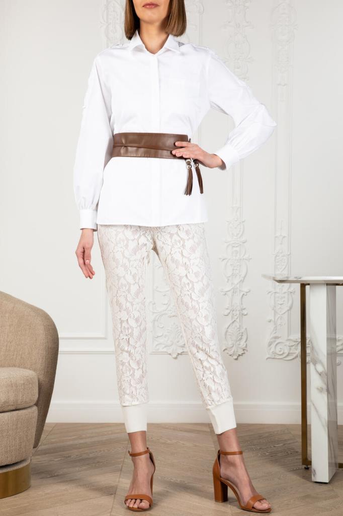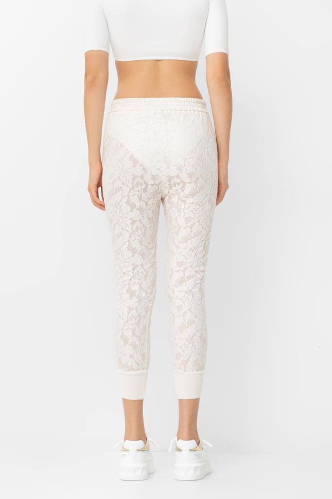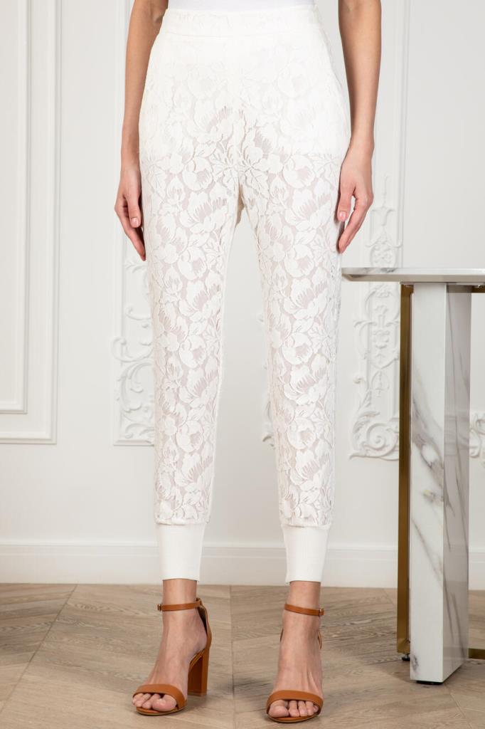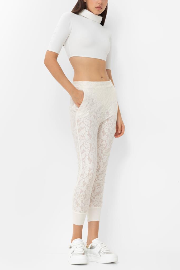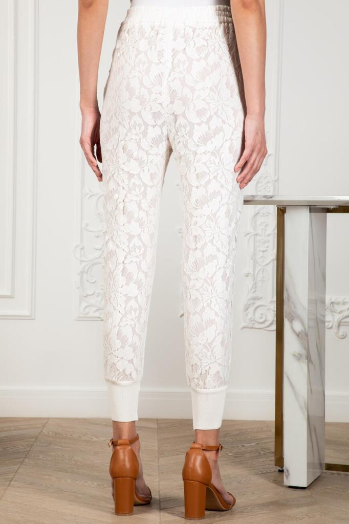 Лёгкие женские брюки от британской марки Stella McCartney. Модель классического белого цвета изготовлена из полупрозрачного кружева с растительным рисунком. Хлопковая ткань, укрепленная синтетическими волокнами тонкая и воздушная, при этом – прочная. Она «дышит» и хорошо впитывает влагу тела, благодаря чему комфортна в тёплую погоду и в помещении. Крой брюк свободный, зауженный книзу. Пояс собран сзади на резинку, а штанины оформлены снизу широкими трикотажными манжетами.