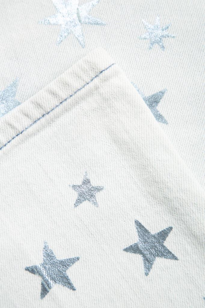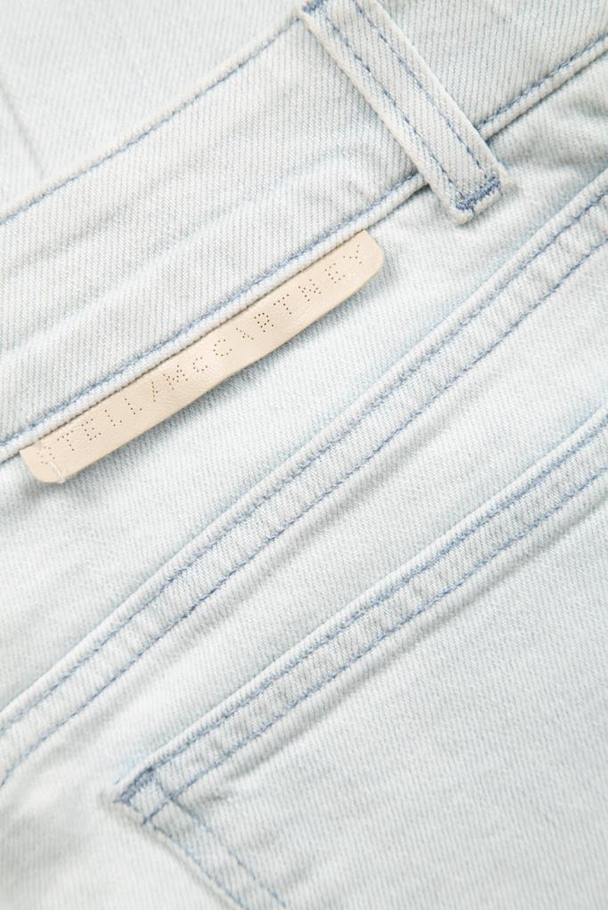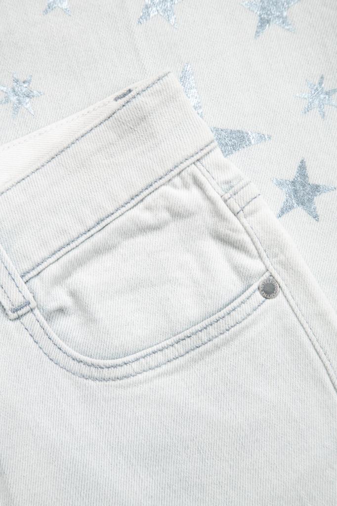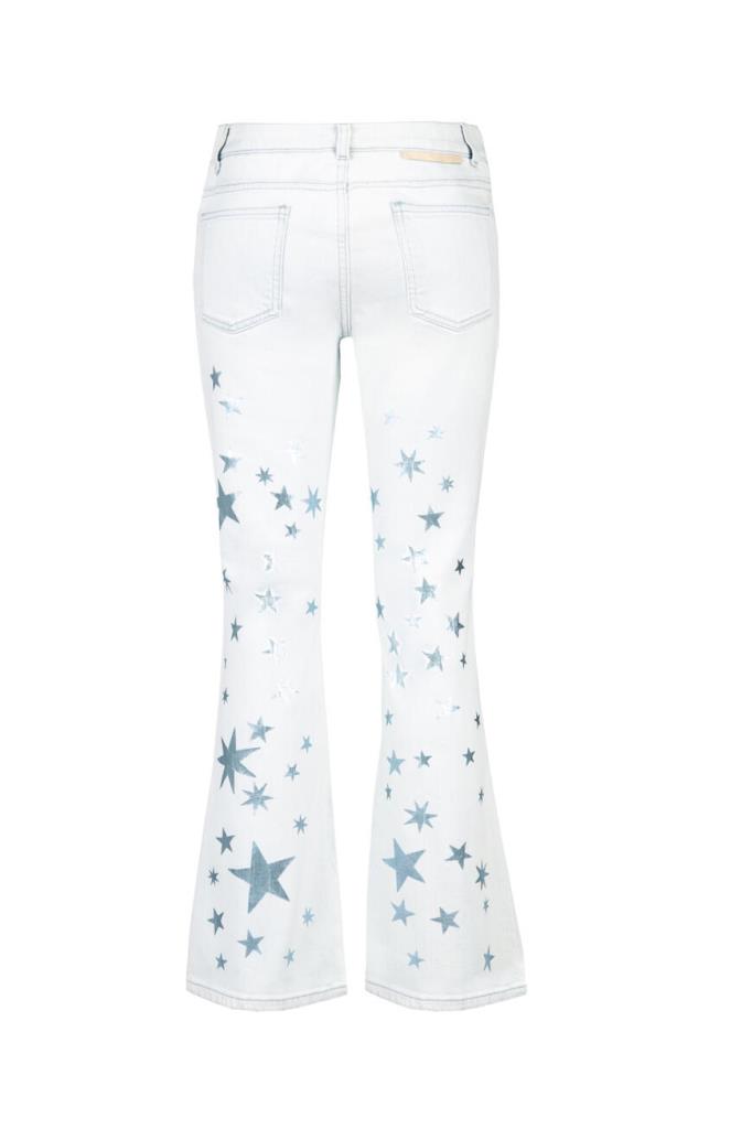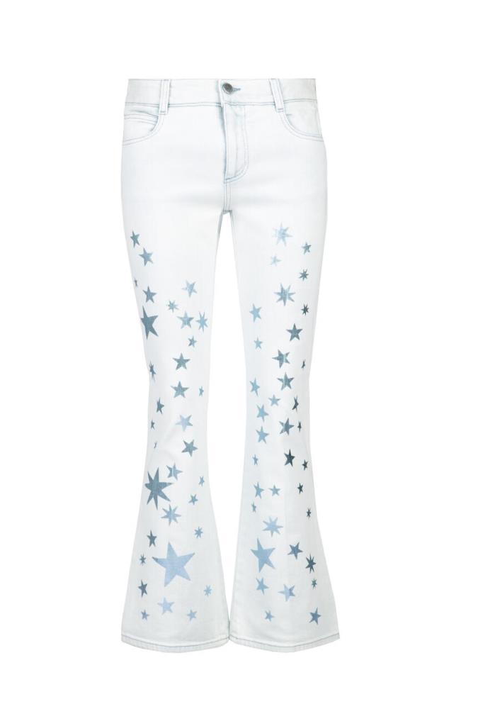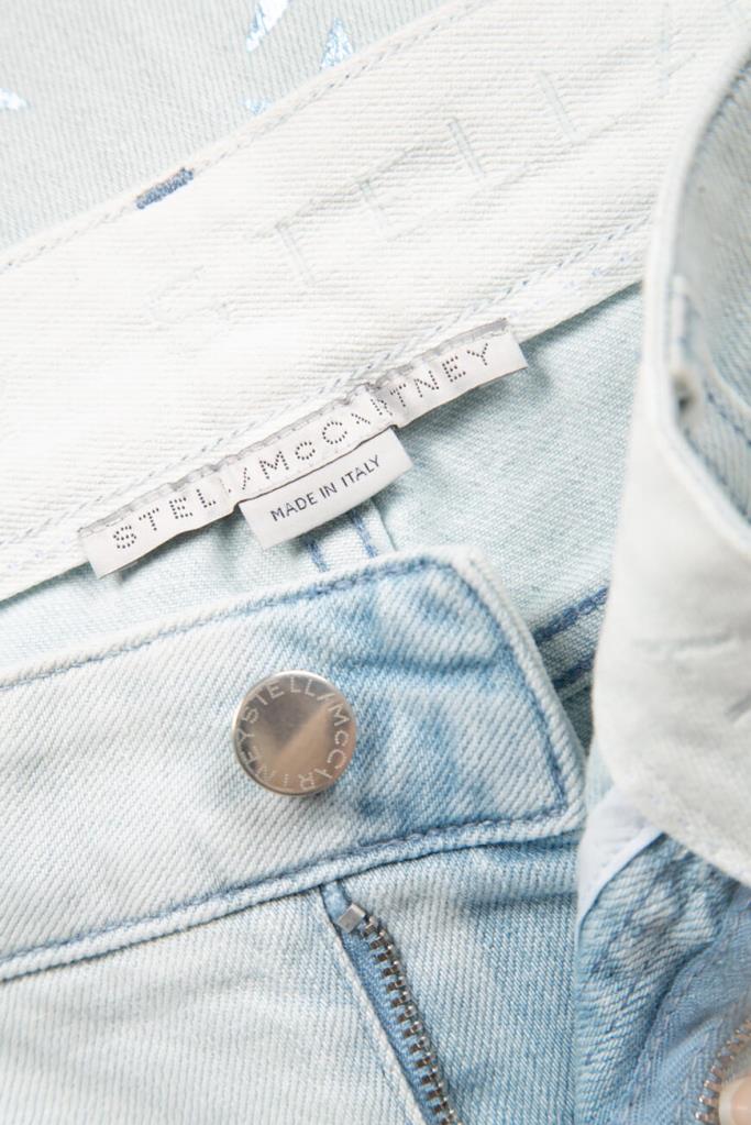 Ультрамодные женские джинсы Stella McCartney из мягкого эластичного хлопкового денима изысканного голубого оттенка с эффектными дизайнерскими потёртостями и оригинальным контрастным блестящим узором в виде крупных звёзд с эффектом металлик по всей поверхности изделия. Стильная модель среднего облегания, комфортного прямого, слегка расклешенного книзу кроя, с плотным поясом со шлевками под ремень, классическими стрелками, удобной застёжкой на молнию и пуговицу и 5 традиционными джинсовыми карманами. Фишка изделия: контрастная бежевая вставка-нашивка с фирменной перфорированной надписью бренда.