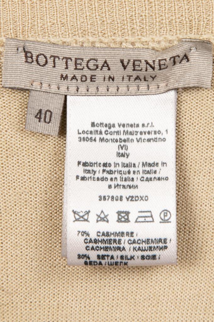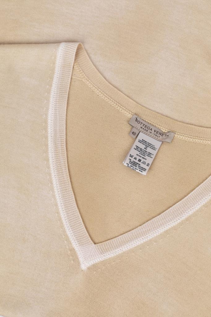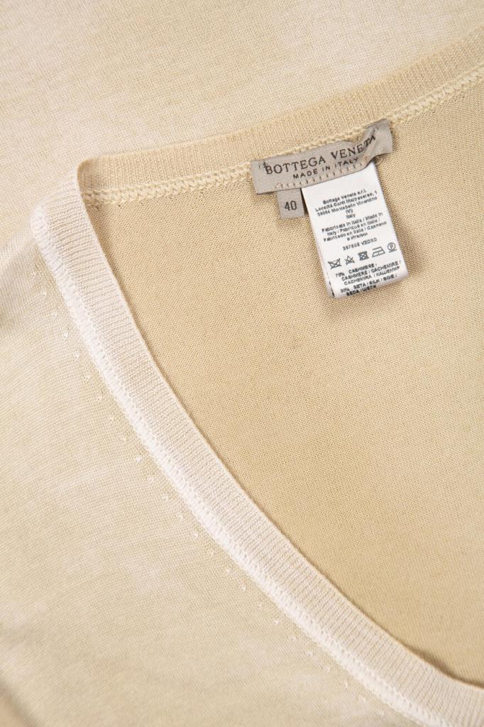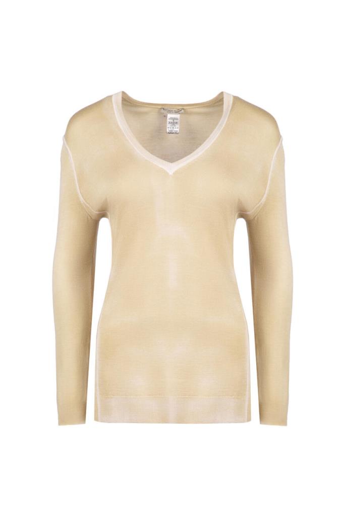 Лаконичный женский пуловер BOTTEGA VENETA из мягкого высококачественного тонкого трикотажа на основе фирменного кашемира и гладкого шёлка изысканного светло-жёлтого оттенка с эффектными дизайнерскими потёртостями. Стильная модель комфортного прямого кроя, с изящным V-образным вырезом горловины контрастного бежевого оттенка, длинными рукавами с манжетами на резинке и широкой манжетой снизу с фактурой в рубчик. Фишка изделия: контрастные бежевые полосы по всей поверхности изделия.