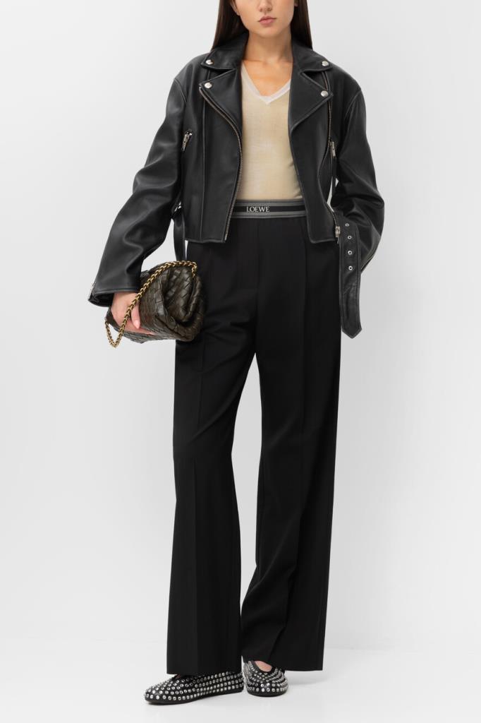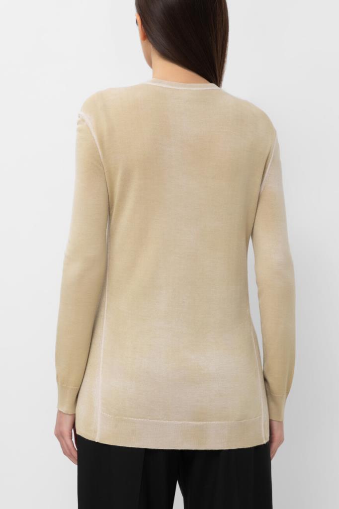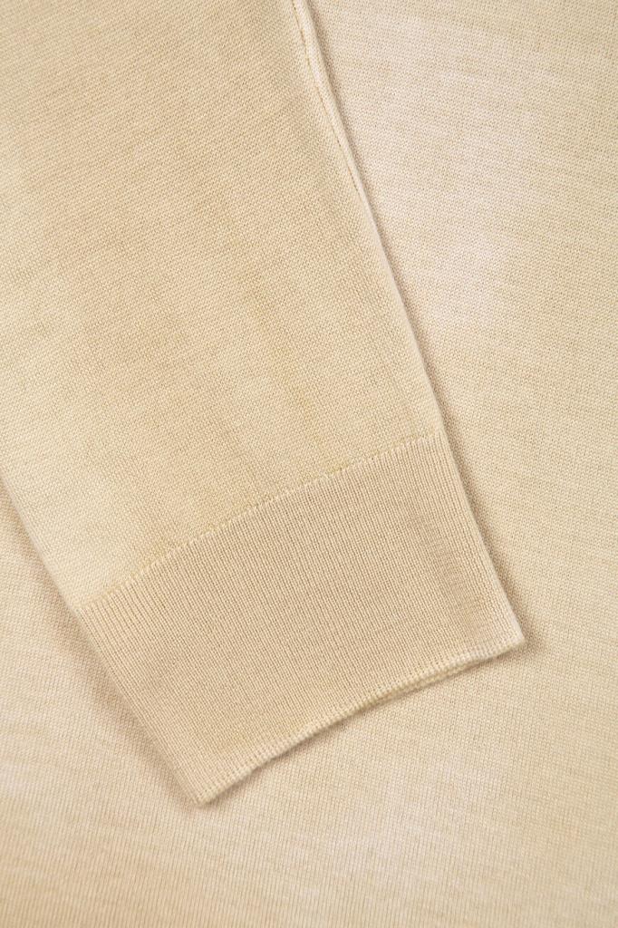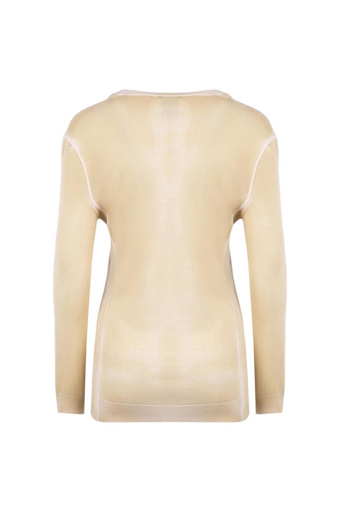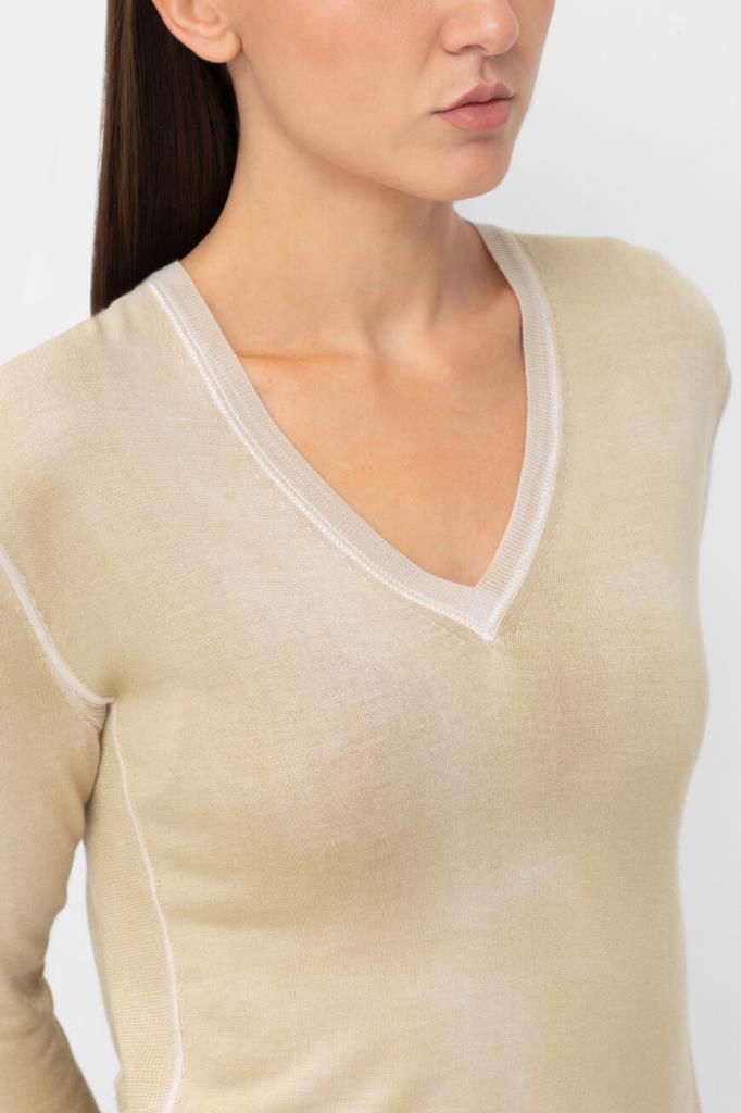 Лаконичный женский пуловер BOTTEGA VENETA из мягкого высококачественного тонкого трикотажа на основе фирменного кашемира и гладкого шёлка изысканного светло-жёлтого оттенка с эффектными дизайнерскими потёртостями. Стильная модель комфортного прямого кроя, с изящным V-образным вырезом горловины контрастного бежевого оттенка, длинными рукавами с манжетами на резинке и широкой манжетой снизу с фактурой в рубчик. Фишка изделия: контрастные бежевые полосы по всей поверхности изделия.