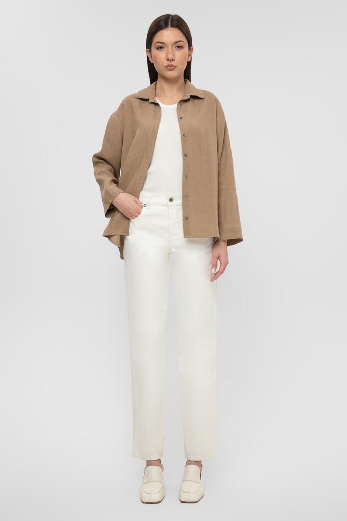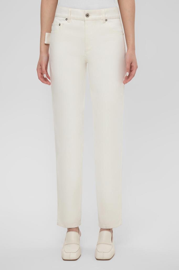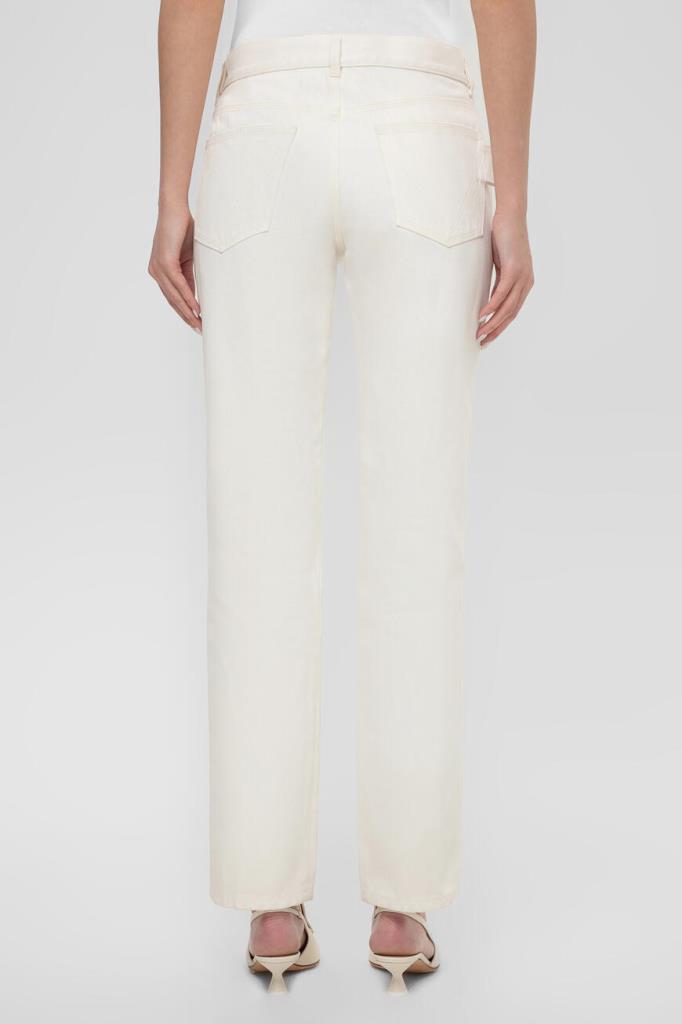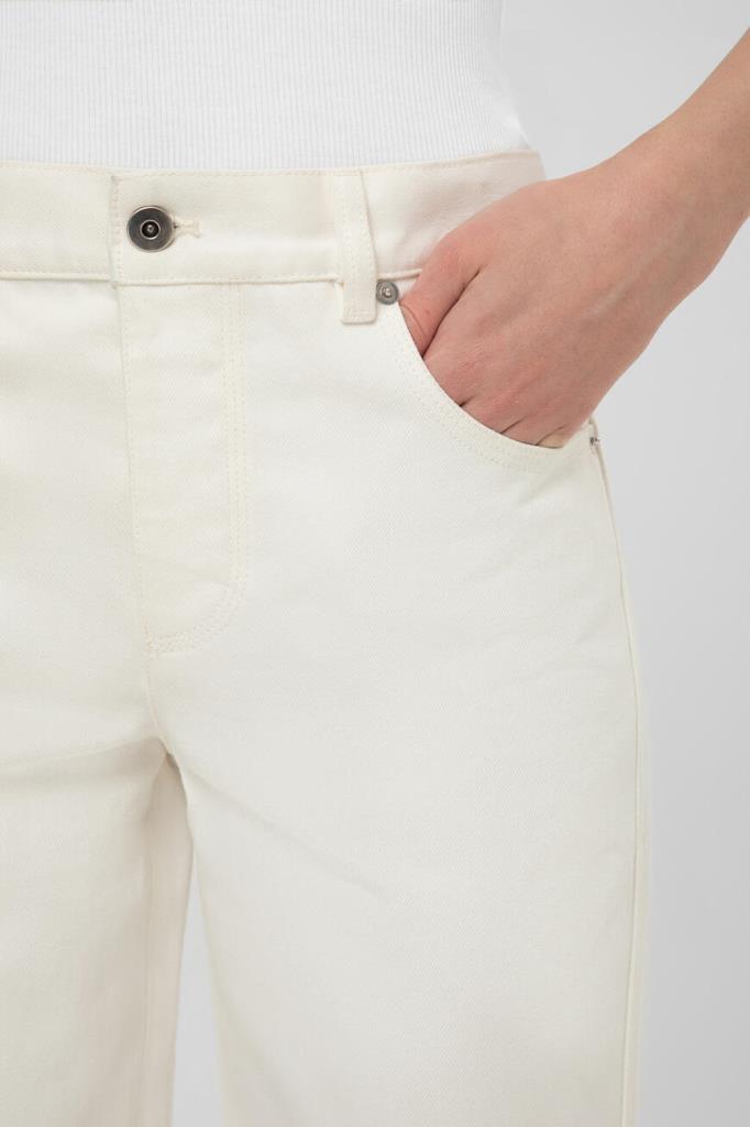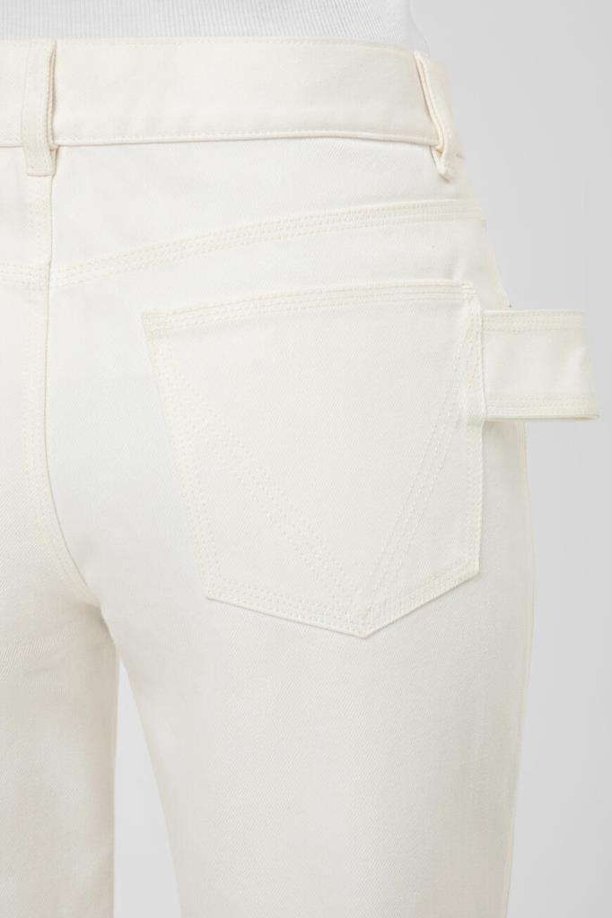 Женские джинсы прямого кроя от BOTTEGA VENETA. Для изготовления повседневной модели используется белый хлопковый деним. Изделие застёгивается на металлическую пуговицу с планкой. Отличительной деталью стала декоративная петля сбоку сзади.