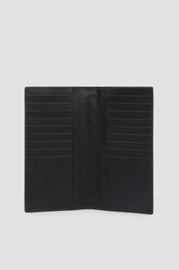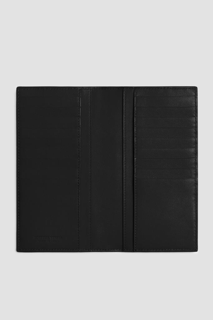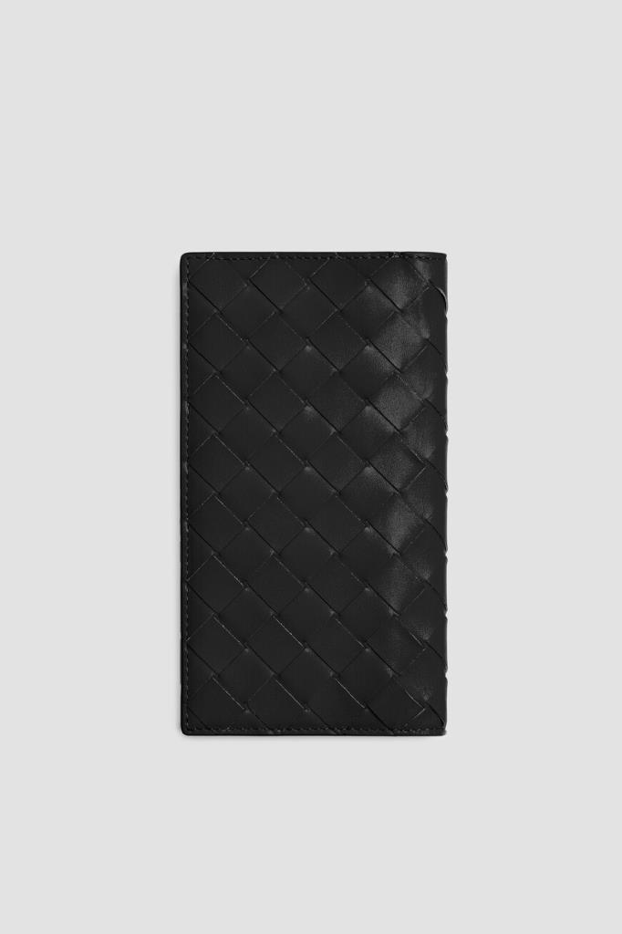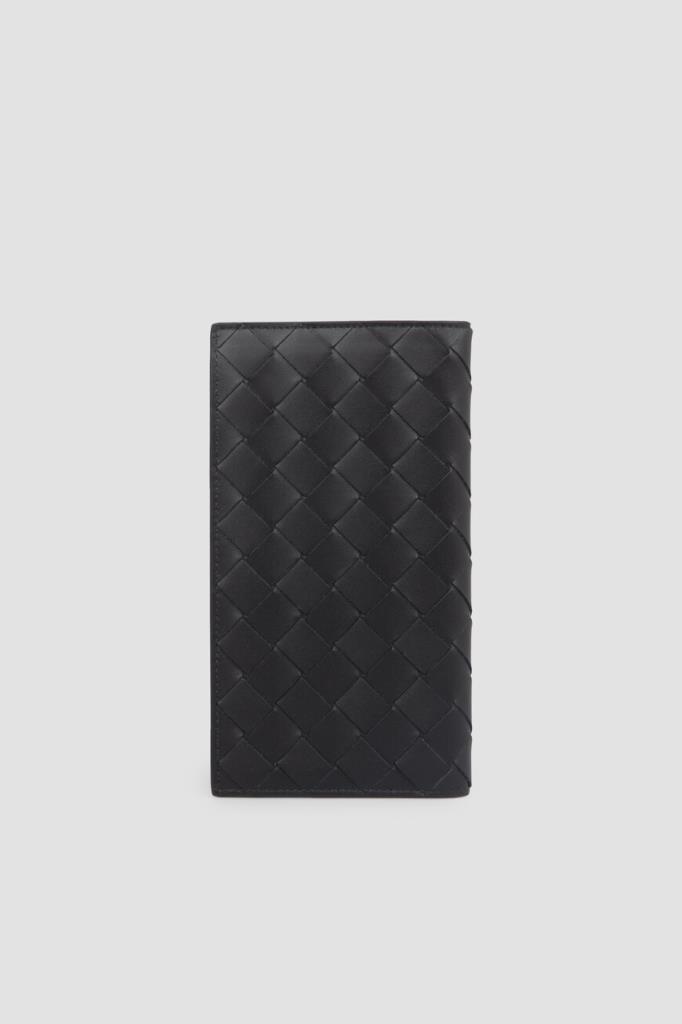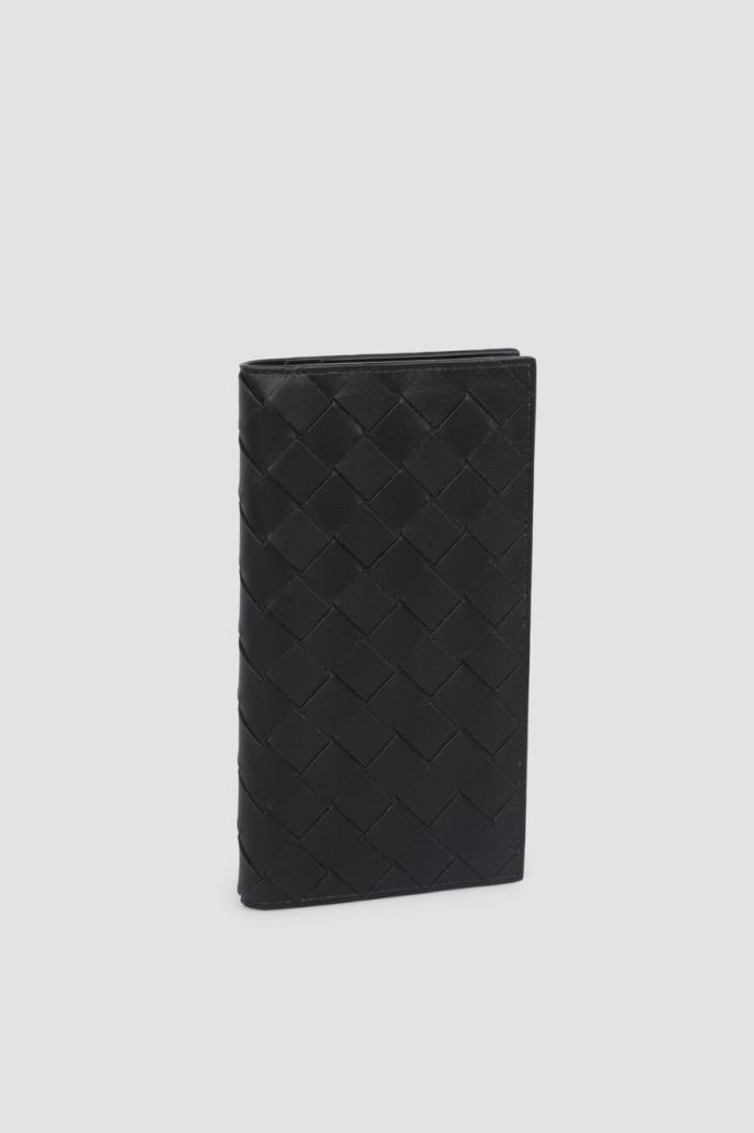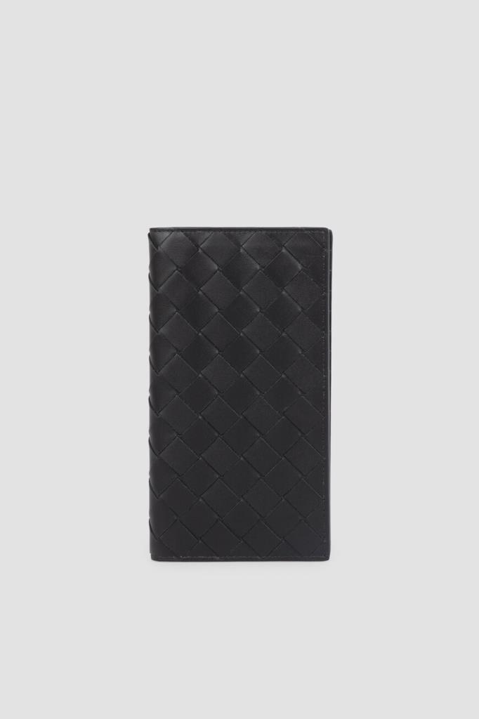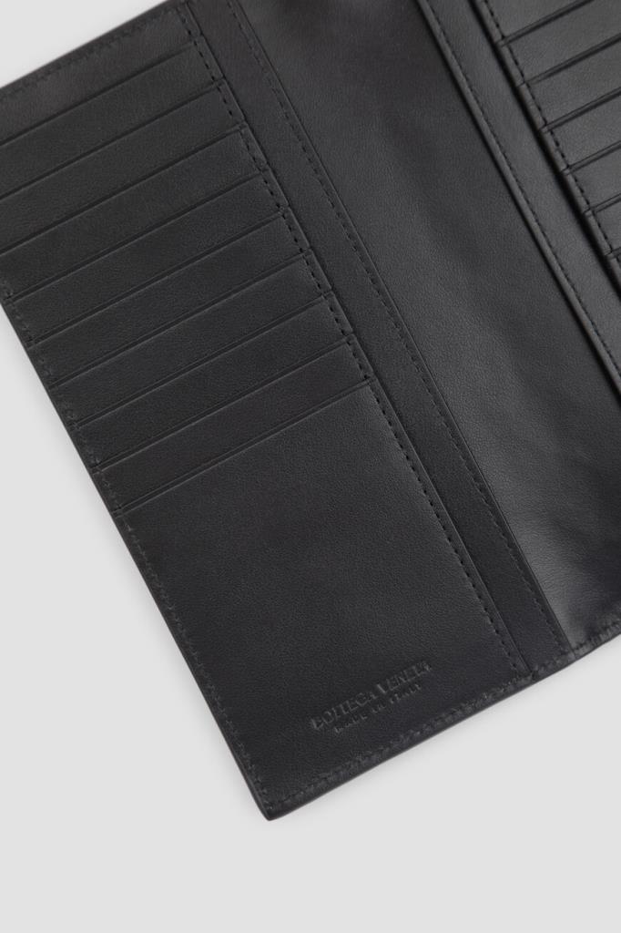 Прямоугольный кошелёк без застёжки от BOTTEGA VENETA. Изделие чёрного цвета выполнено в старинной технике «Intrecciato»: полоски тщательно выделанной телячьей кожи, отполированной до деликатного блеска, продели в прорези на полотне из такого же материала, сформировав графичный фактурный узор. Для оптимальной организации пространства предусмотрены 18 слотов для кредитных карт и четыре плоских боковых кармана для хранения чеков и купюр во внутренней части аксессуара.