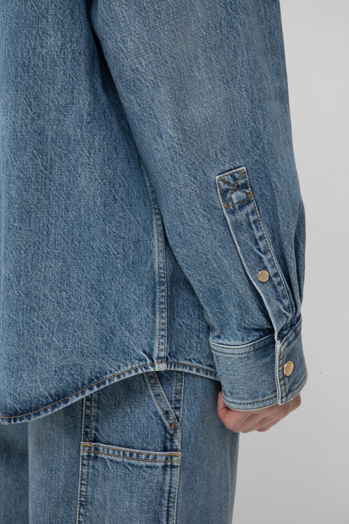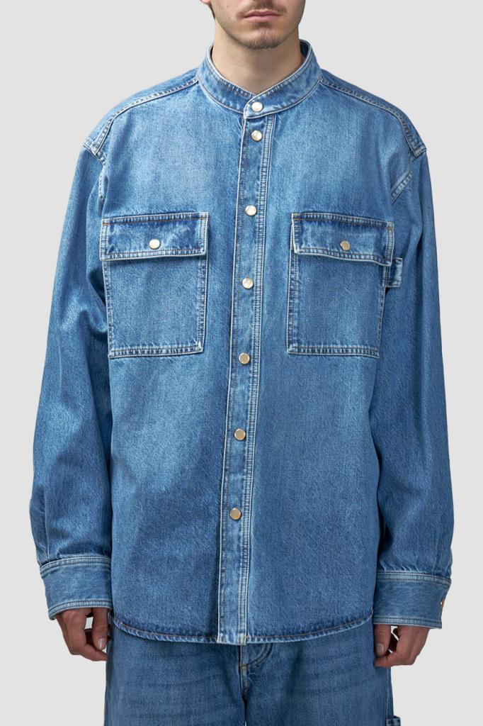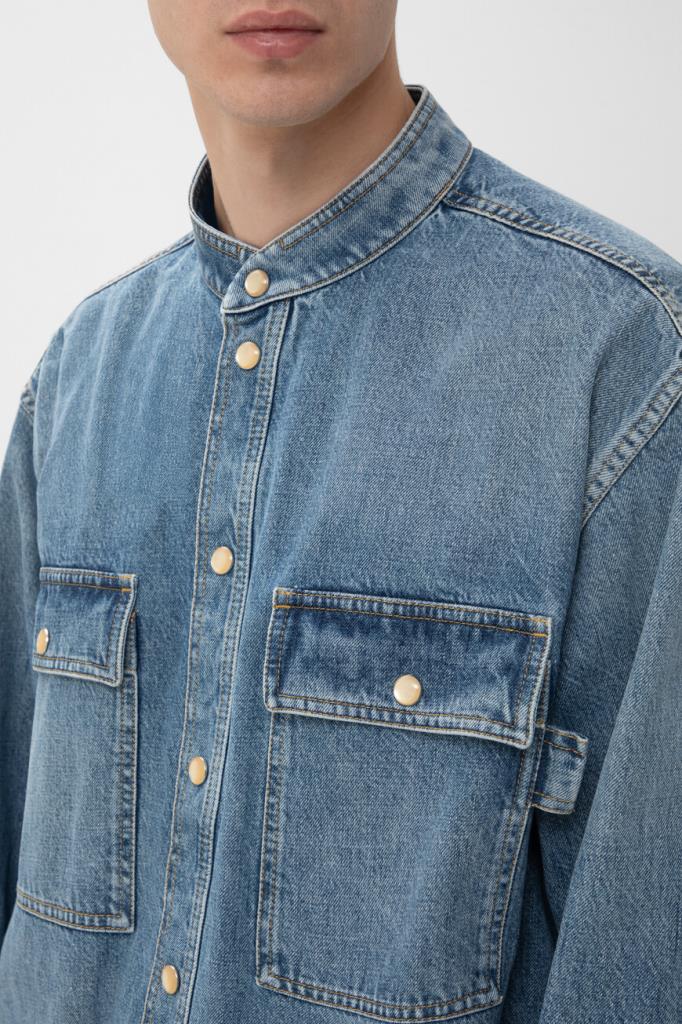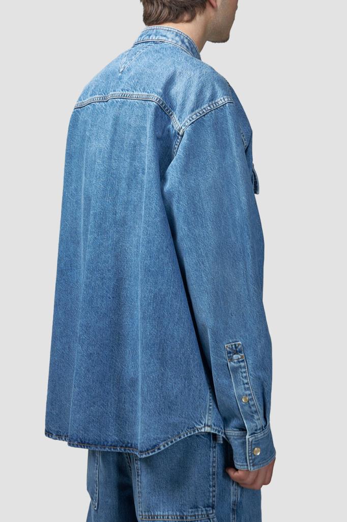 Синяя рубашка BOTTEGA VENETA с длинным рукавом. Для создания модели прямого силуэта используется мягкий хлопковый деним с эффектом делаве. Фасон изделия предполагает два крупных нагрудных кармана с клапанами на клёпке по бокам и закруглённый низ. Отличительными деталями стали декоративная петля на левом накладном кармане и строчка-узор в виде перевёрнутого треугольника на спинке. Образ можно дополнить винтажными джинсами карго из того же материала в тон из новой коллекции Дома.
