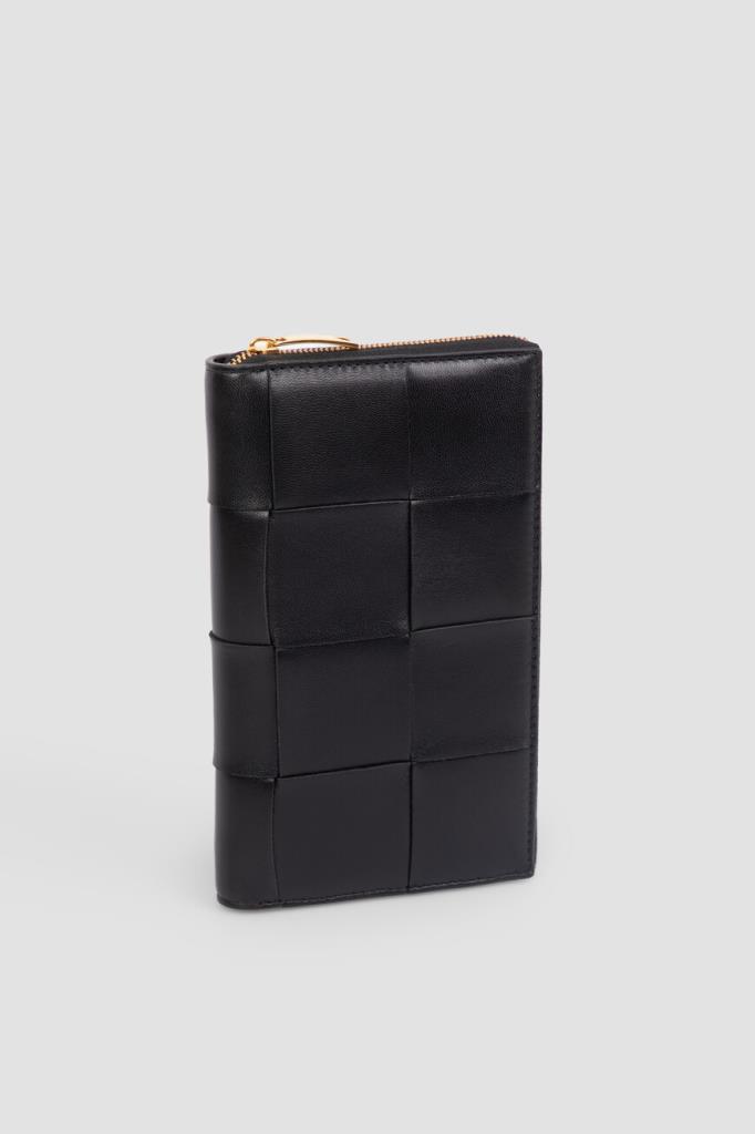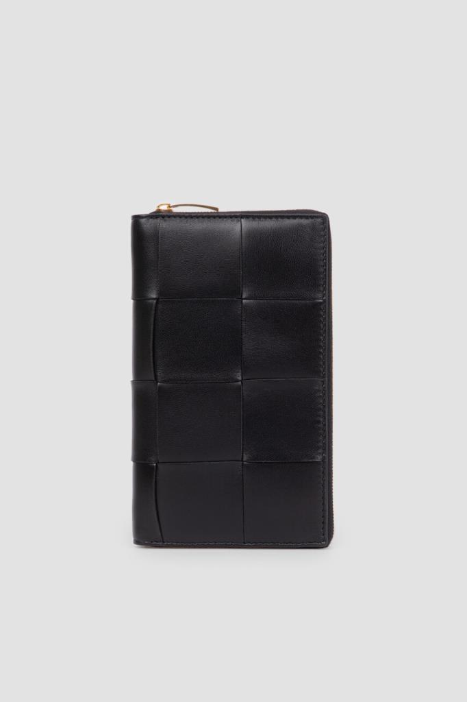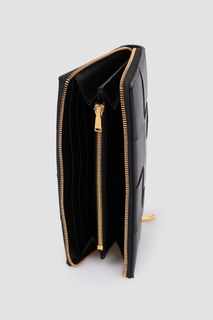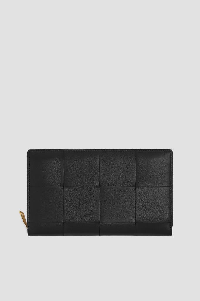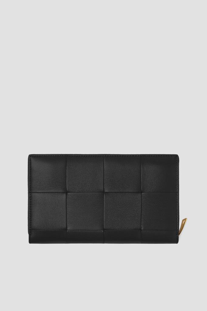 Чёрный кошелёк BOTTEGA VENETA на золотистой круговой молнии. Вместительная модель из линейки Cassette изготовлена вручную в фирменной технике «Intrecciato» из широких полос особенно мягкой кожи ягнёнка. Внутренняя части изделия представляет собой два больших отделения «гармошкой» для купюр, разделённых между собой карманом-перегородкой на молнии, подходящим для хранения монет. Функционал аксессуара расширен 12 слотами для банковских карт и двумя плоскими боковыми карманами для чеков.