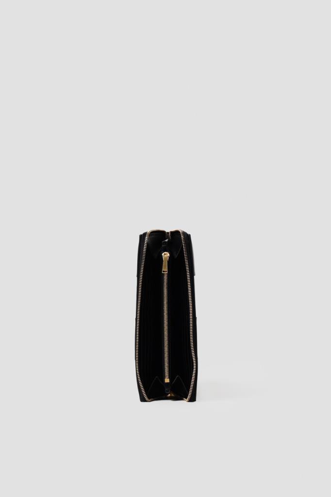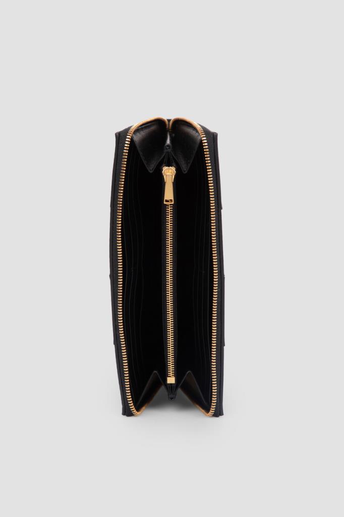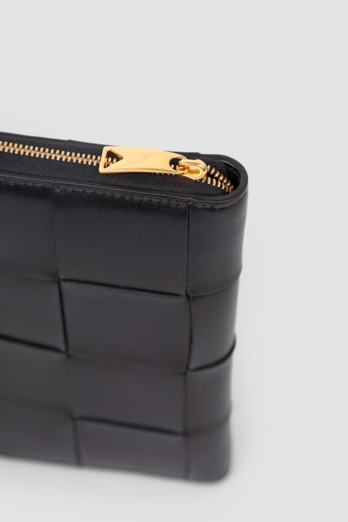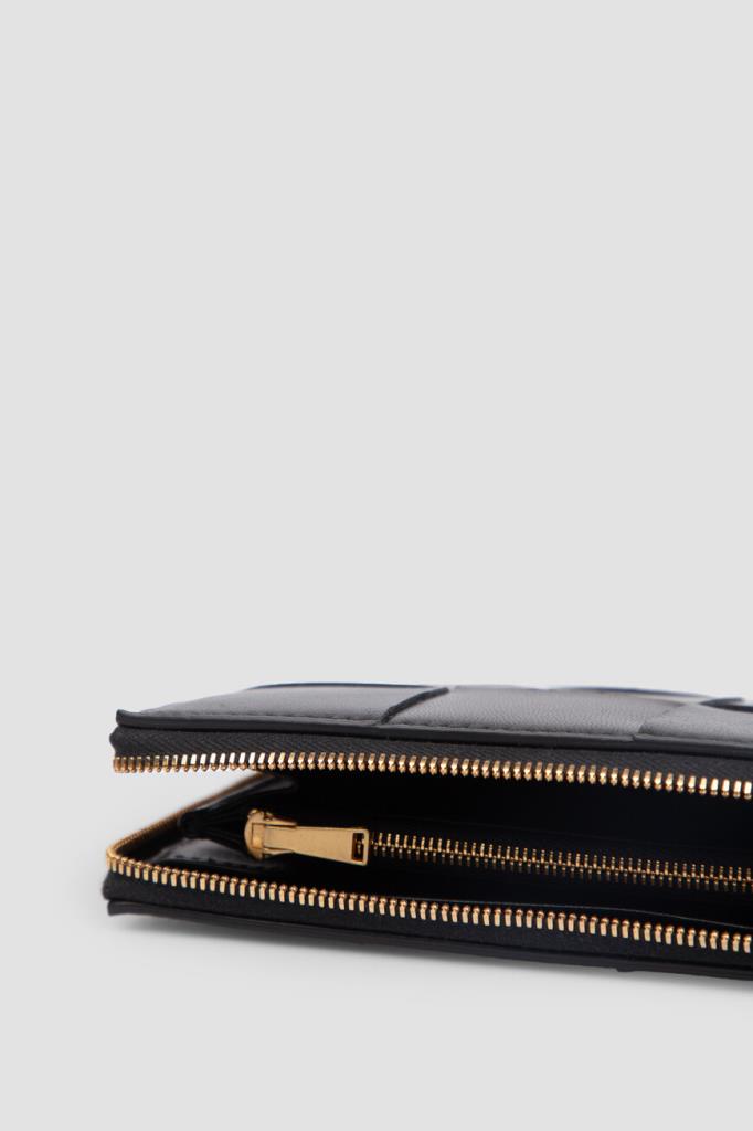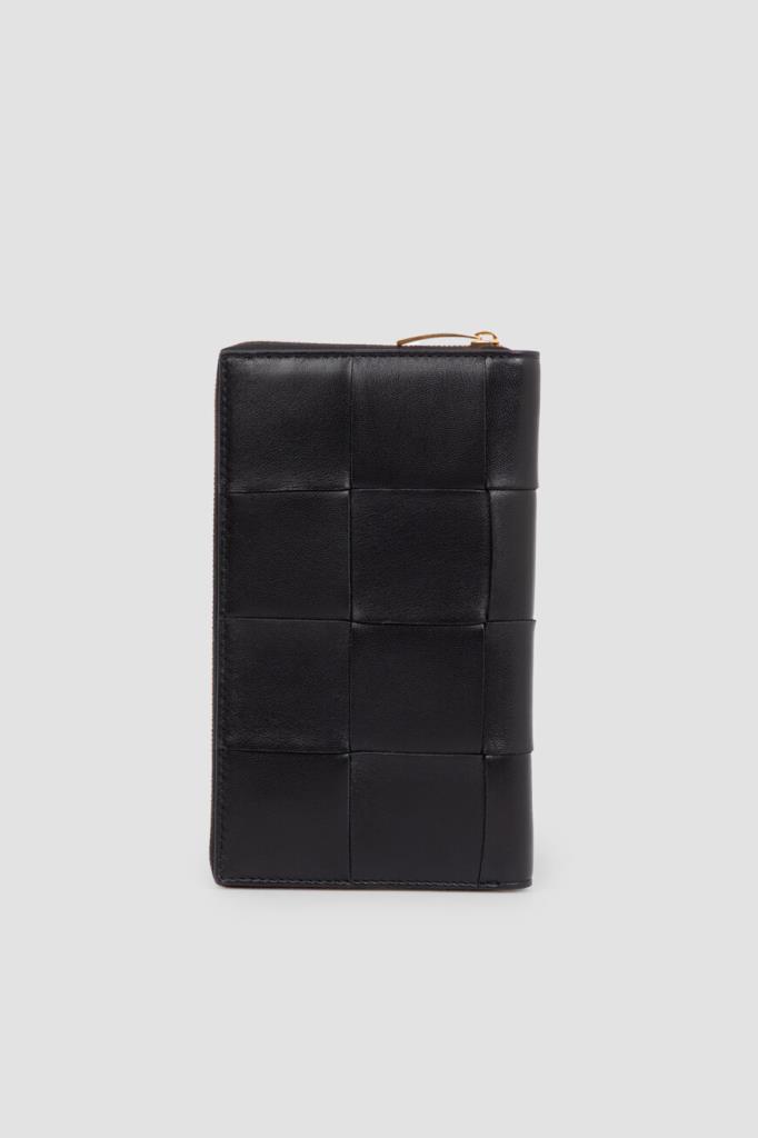Чёрный кошелёк BOTTEGA VENETA на золотистой круговой молнии. Вместительная модель из линейки Cassette изготовлена вручную в фирменной технике «Intrecciato» из широких полос особенно мягкой кожи ягнёнка. Внутренняя части изделия представляет собой два больших отделения «гармошкой» для купюр, разделённых между собой карманом-перегородкой на молнии, подходящим для хранения монет. Функционал аксессуара расширен 12 слотами для банковских карт и двумя плоскими боковыми карманами для чеков.