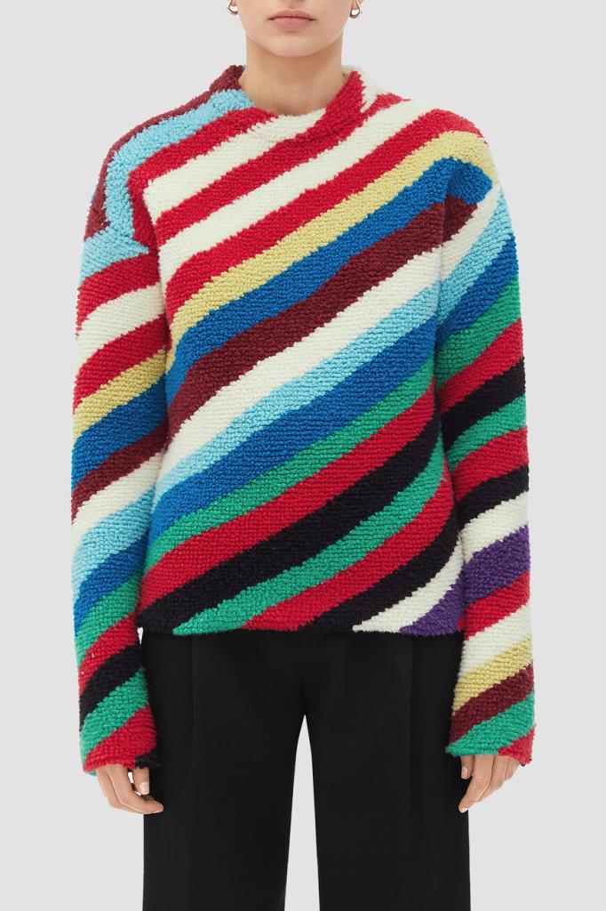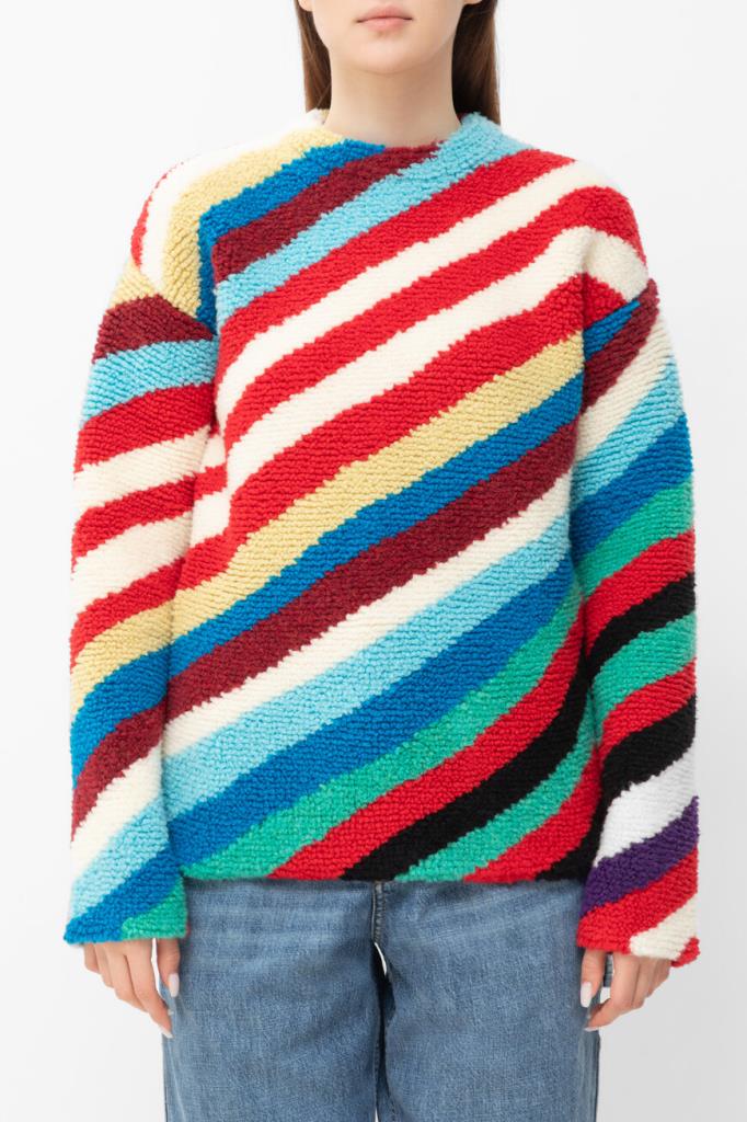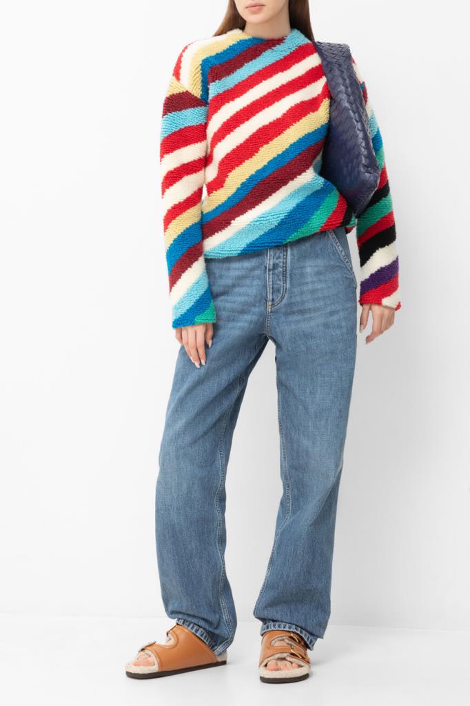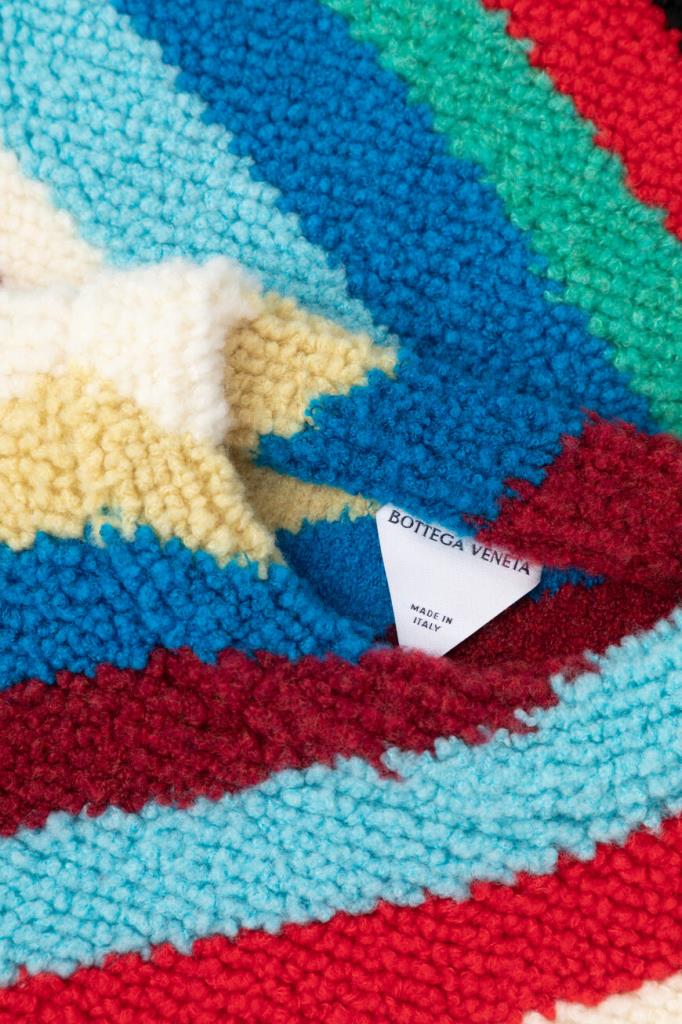 Cвитер расслабленного силуэта от BOTTEGA VENETA. Изделие выполнено из эластичного трикотажа на основе мягкой шерсти и прочного нейлона с ворсистой поверхностью. Отличительной особенностью модели стал разноцветный диагональный мотив в виде широких полос. Создайте повседневный комплект с тёмно-синими брюками с классическими стрелками из той же коллекции.