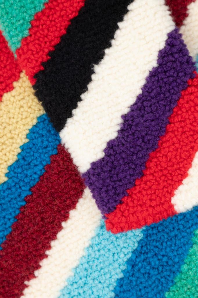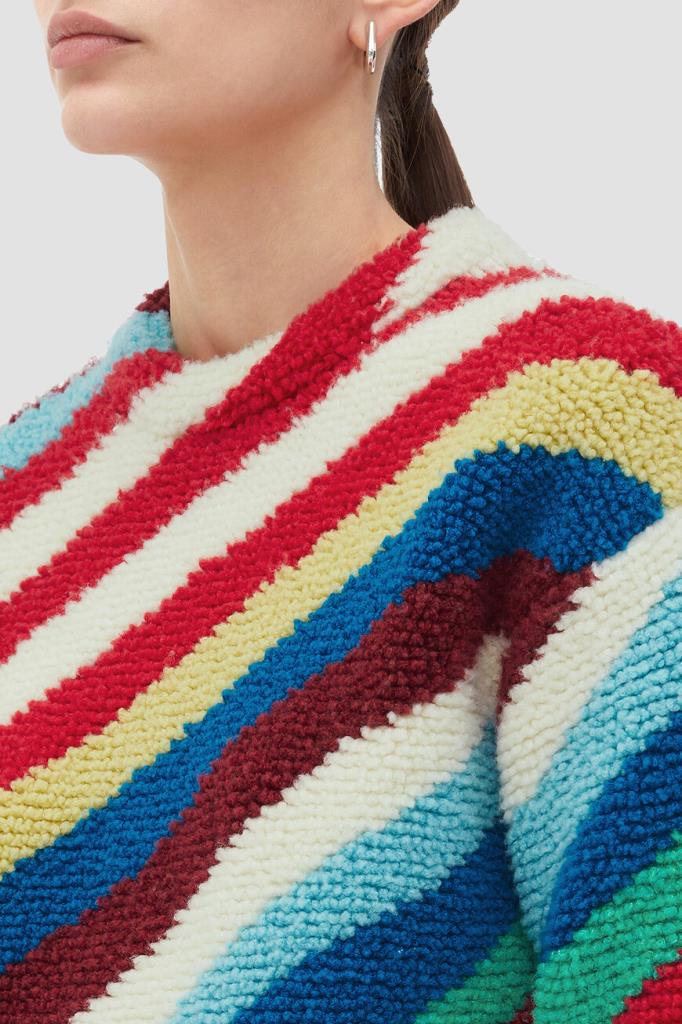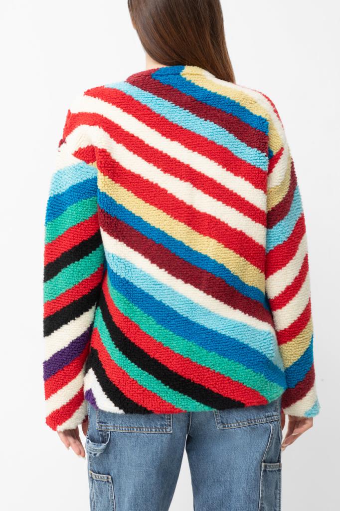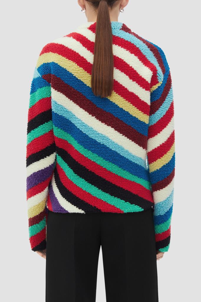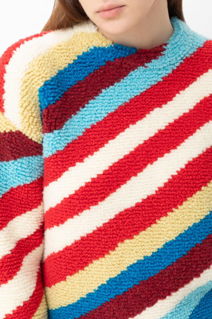 Cвитер расслабленного силуэта от BOTTEGA VENETA. Изделие выполнено из эластичного трикотажа на основе мягкой шерсти и прочного нейлона с ворсистой поверхностью. Отличительной особенностью модели стал разноцветный диагональный мотив в виде широких полос. Создайте повседневный комплект с тёмно-синими брюками с классическими стрелками из той же коллекции.