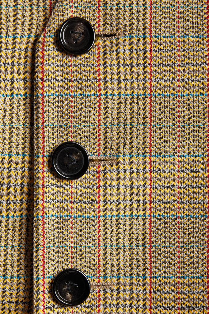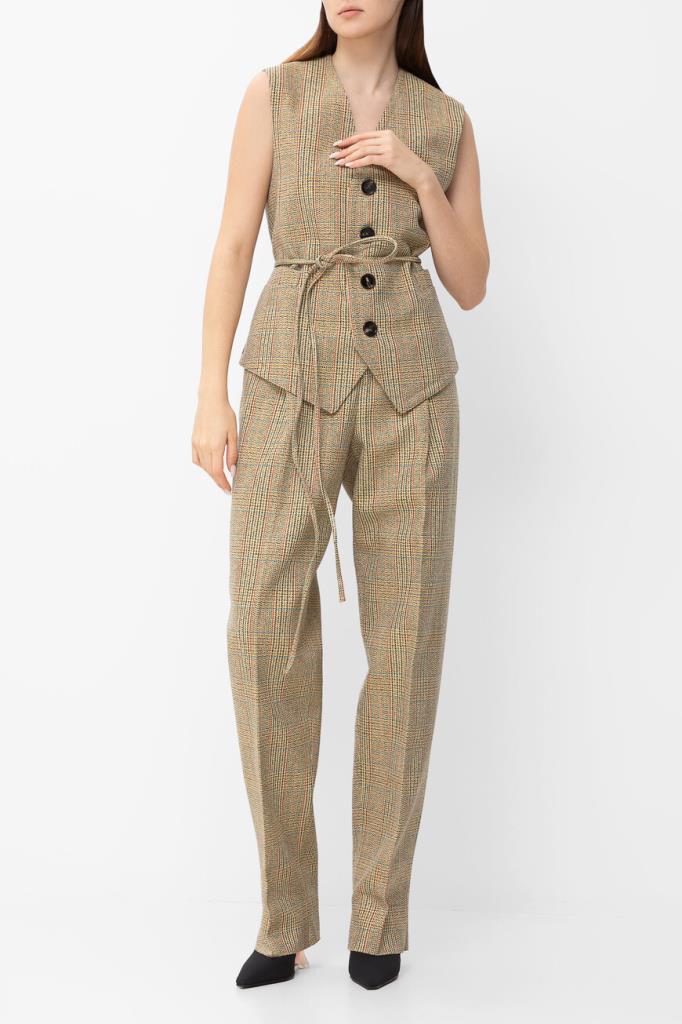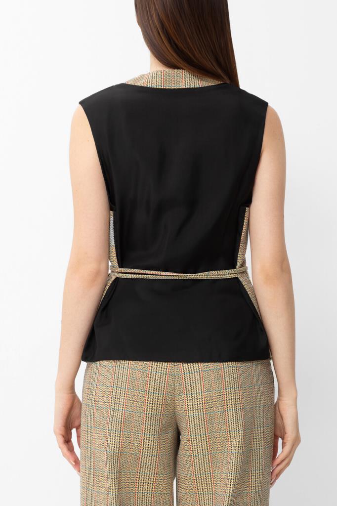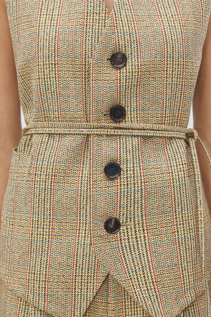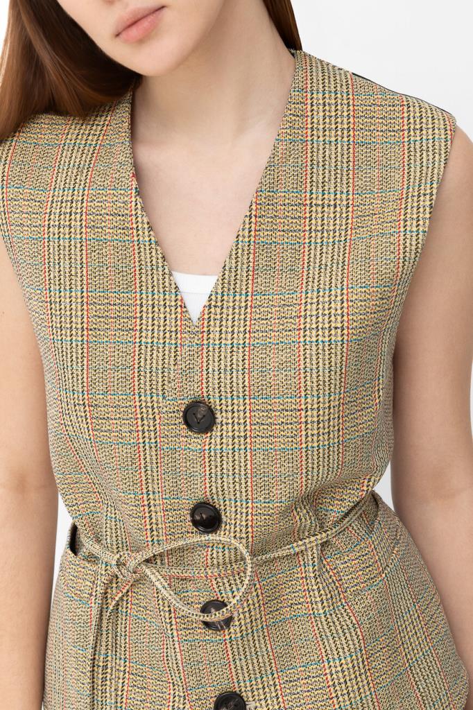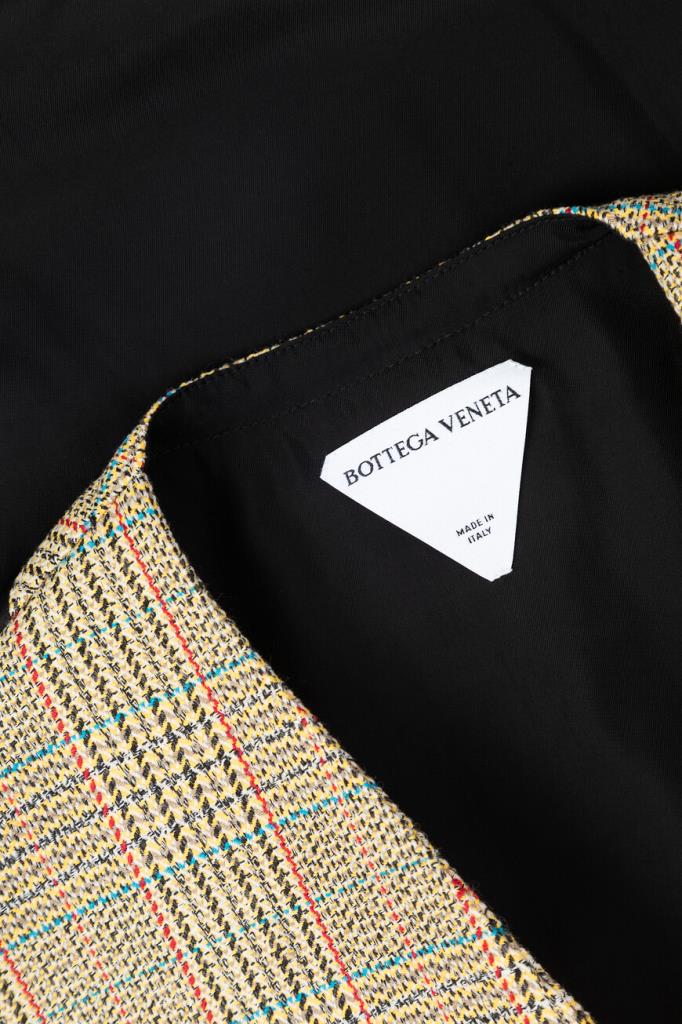 Двусторонний жилет BOTTEGA VENETA выполнен на подкладке. Для создания модели прямого силуэта выбран мягкий трикотаж на основе натуральной шерсти, хлопка и прочного полиэфира. Передняя сторона изделия декорирована разноцветным геометрическим мотивом в крупную клетку «Принц Уэльский», создающим естественное переплетение волокон, а задняя сторона окрашена в однотонный чёрный оттенок. Линию талии подчёркивает тонкий длинный пояс на завязках-узле, который можно обернуть вокруг несколько раз. Жилет составит идеальный комплект с клетчатыми брюками прямого силуэта из той же коллекции.