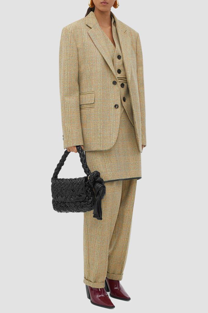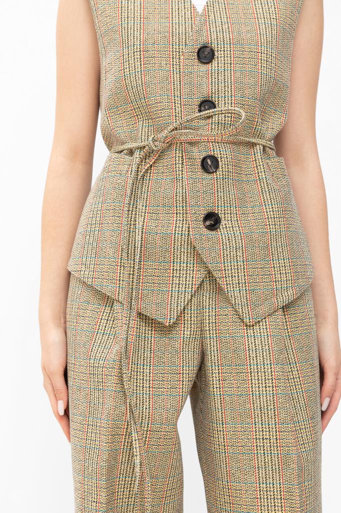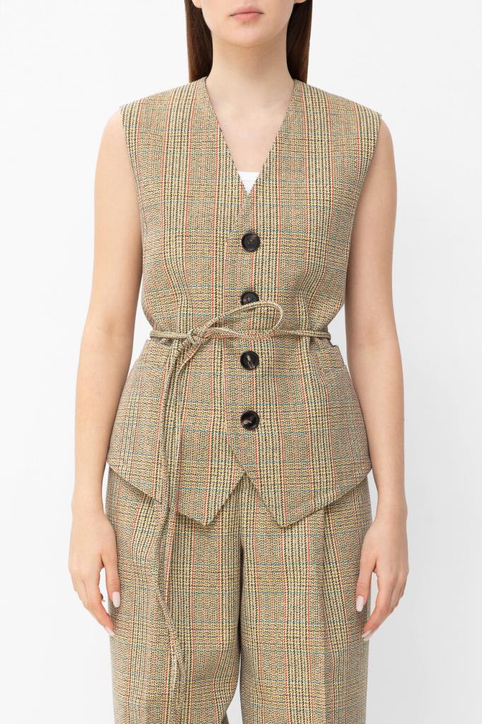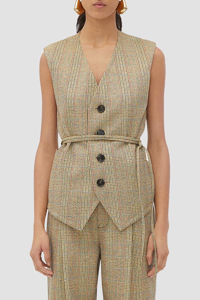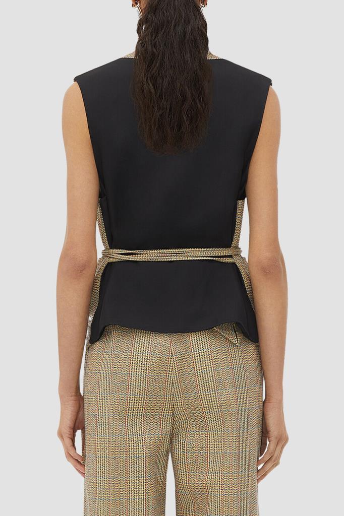 Двусторонний жилет BOTTEGA VENETA выполнен на подкладке. Для создания модели прямого силуэта выбран мягкий трикотаж на основе натуральной шерсти, хлопка и прочного полиэфира. Передняя сторона изделия декорирована разноцветным геометрическим мотивом в крупную клетку «Принц Уэльский», создающим естественное переплетение волокон, а задняя сторона окрашена в однотонный чёрный оттенок. Линию талии подчёркивает тонкий длинный пояс на завязках-узле, который можно обернуть вокруг несколько раз. Жилет составит идеальный комплект с клетчатыми брюками прямого силуэта из той же коллекции.