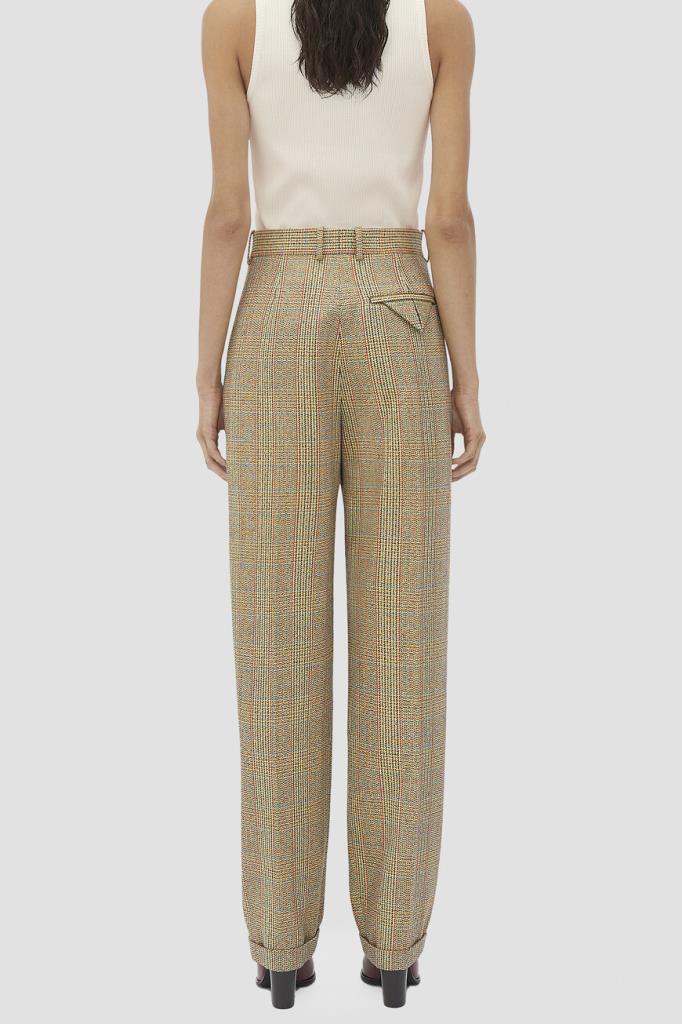 Прямые брюки BOTTEGA VENETA с классическими стрелками и защипами спереди. Модель изготовлена из мягкого трикотажа на основе шерсти, хлопка и прочного полиэстера. Поверхность изделия покрыта разноцветным геометрическим узором в крупную клетку «Принц Уэльский», создающим естественное переплетение волокон. Образ можно дополнить парным жилетом на брендированных роговых пуговицах из той же коллекции.