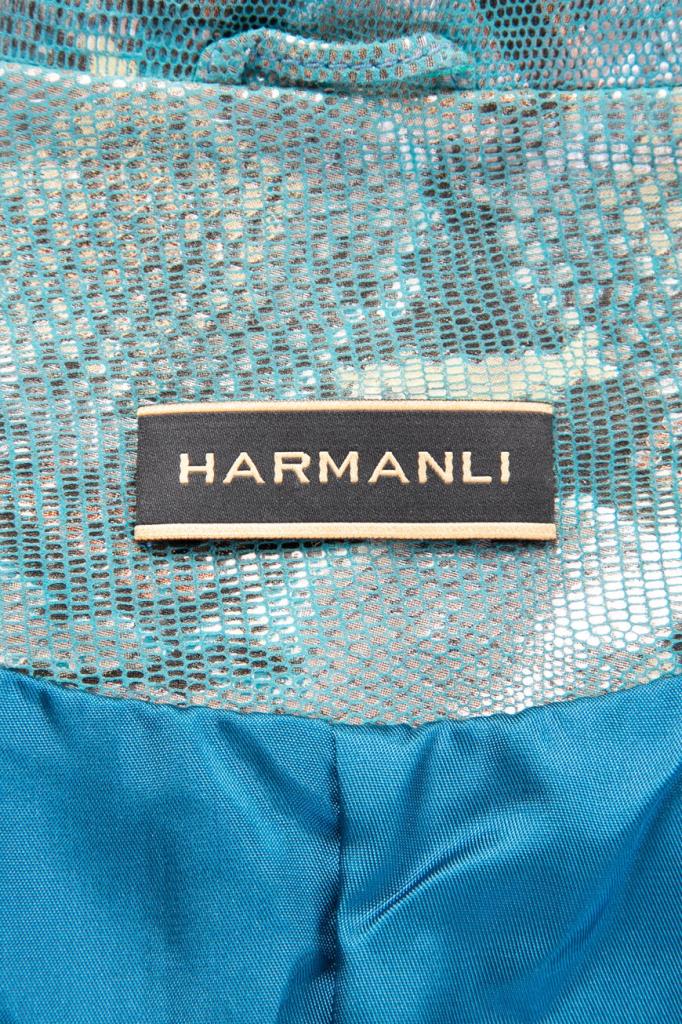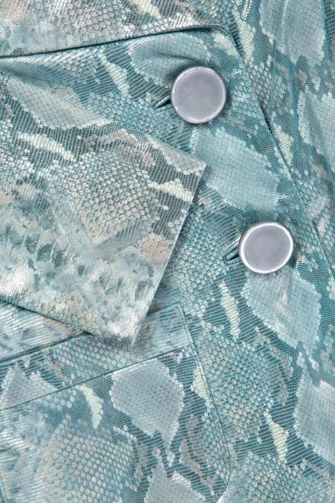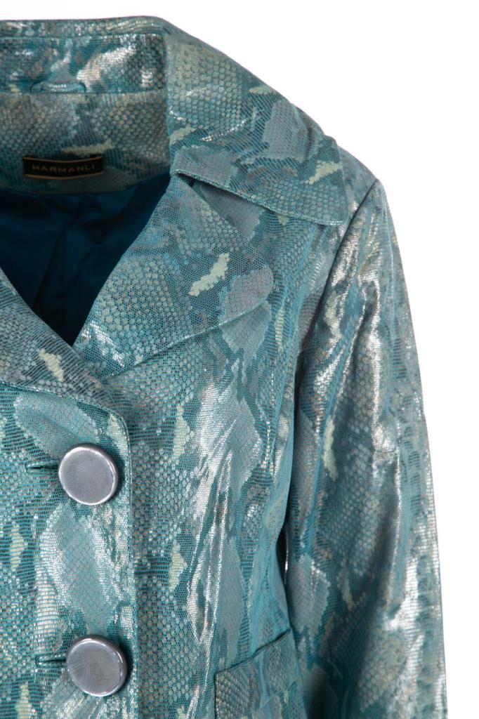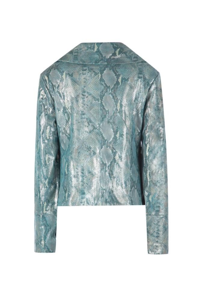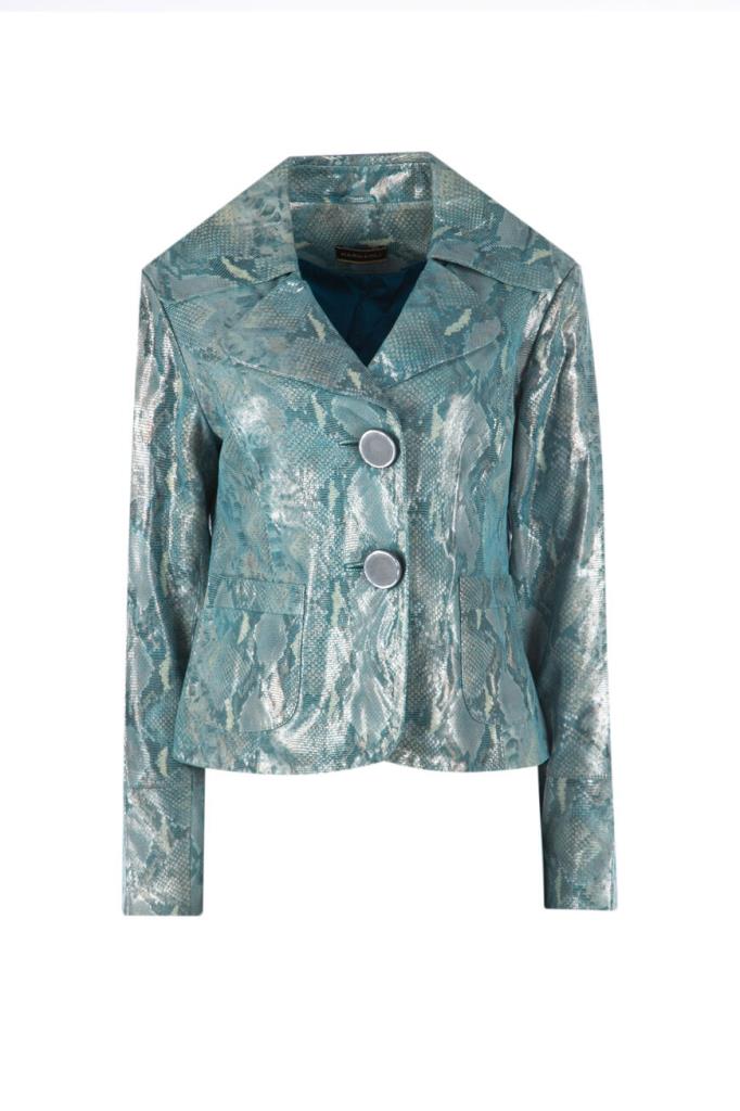 Роскошная женская куртка Harmanli из мягкой натуральной кожи изысканного голубого оттенка с оригинальным контрастным разноцветным узором, имитирующим кожу питона, по всей поверхности изделия.