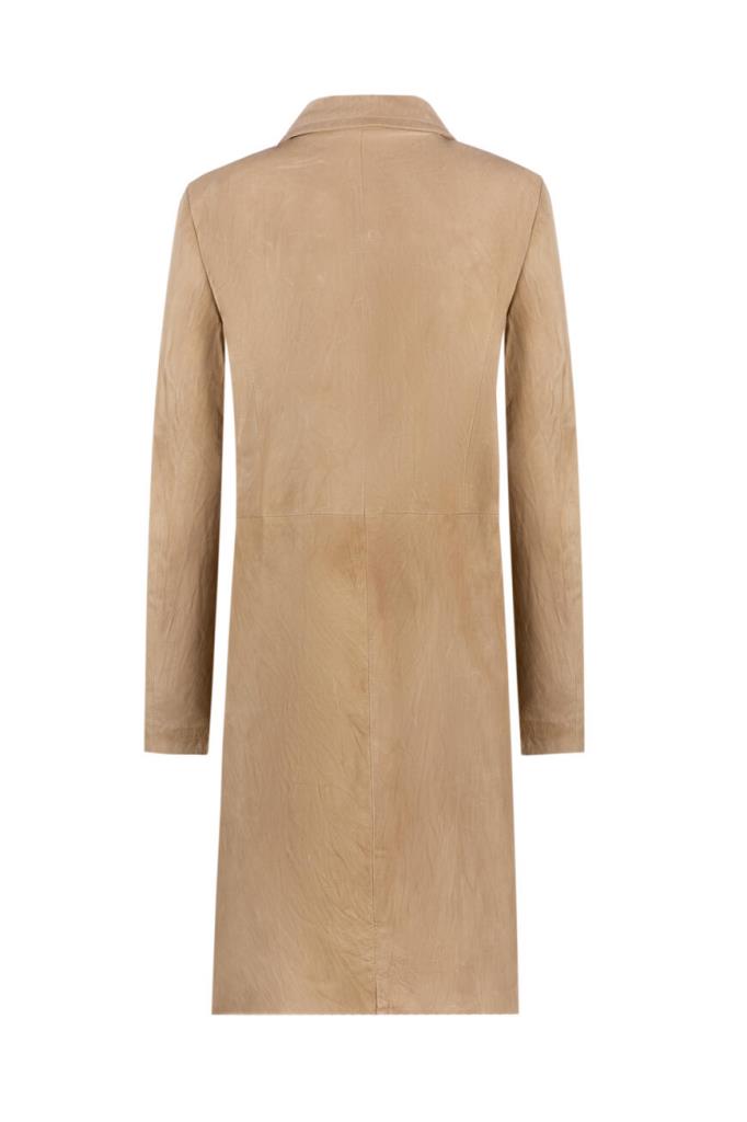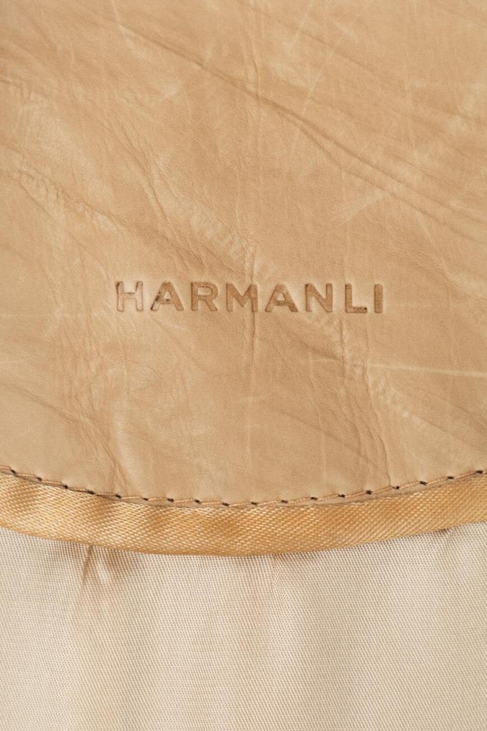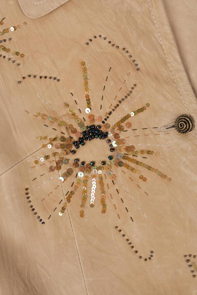 Шикарный женский плащ Harmanli выполнен из мягкой натуральной телячьей кожи бежевого оттенка и дополнен оригинальным контрастным разноцветным узором в виде цветка, составленным из блестящих переливающихся стразов, спереди справа.