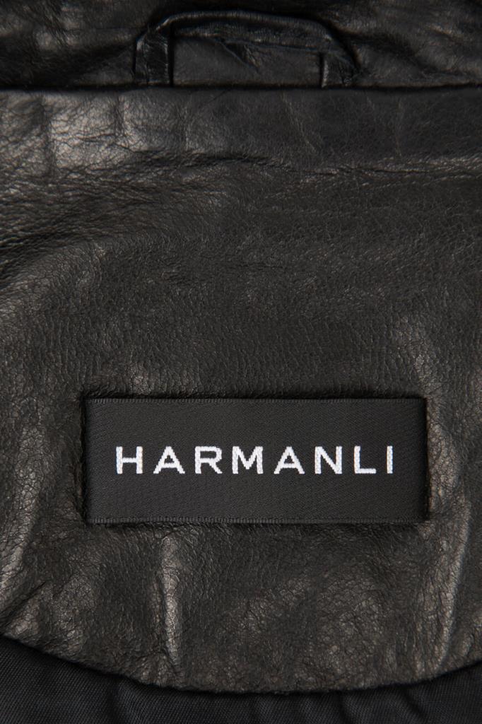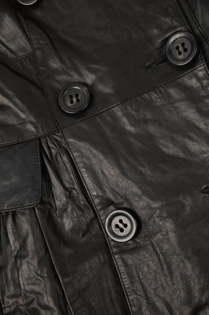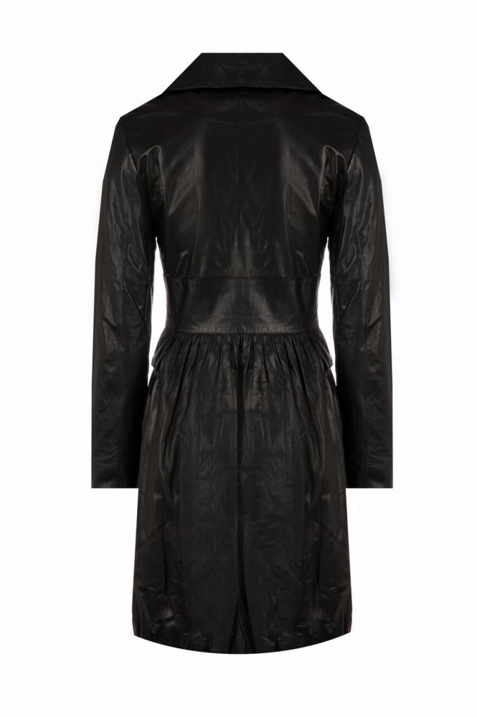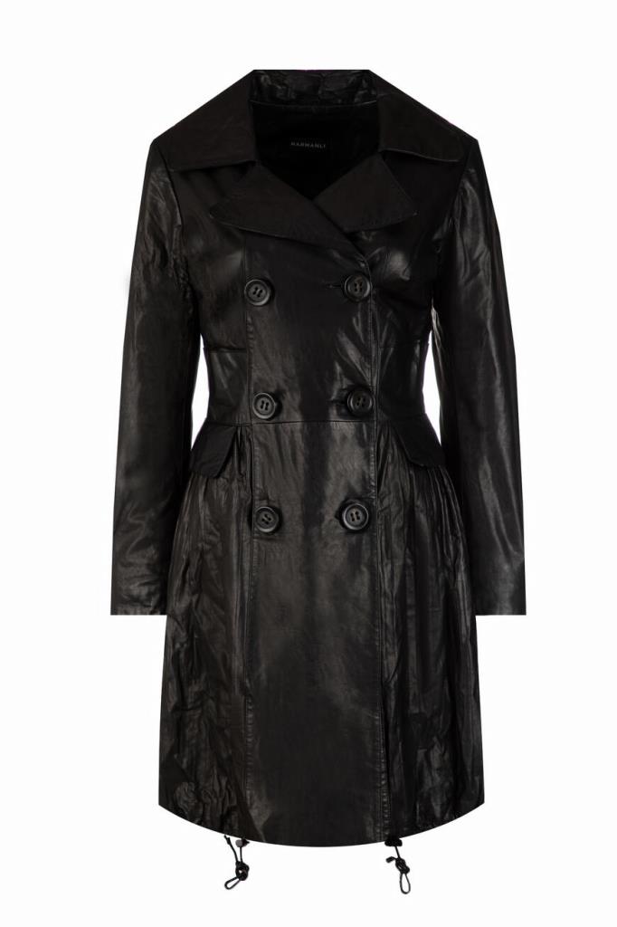 Стильный женский плащ Harmanli из мягкой натуральной кожи ягнёнка универсального чёрного цвета с лёгким матовым глянцевым отливом.