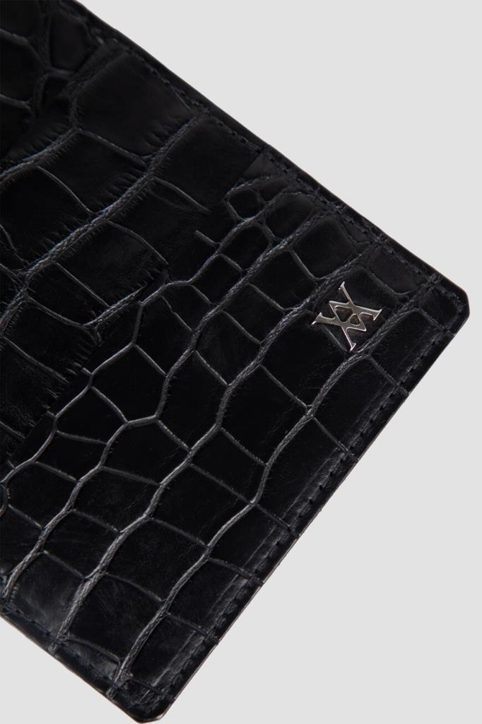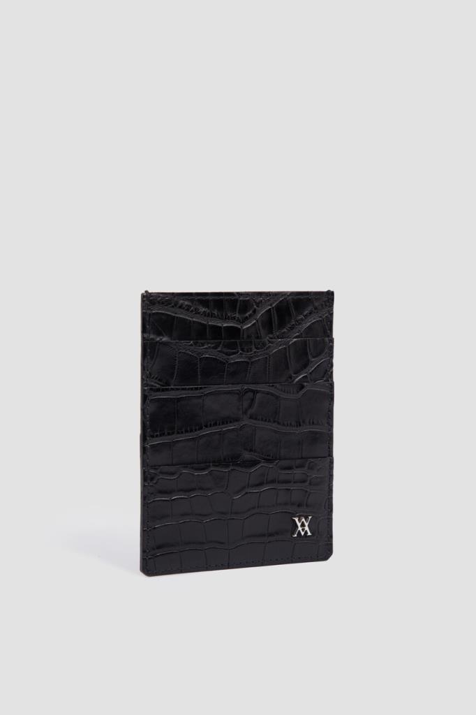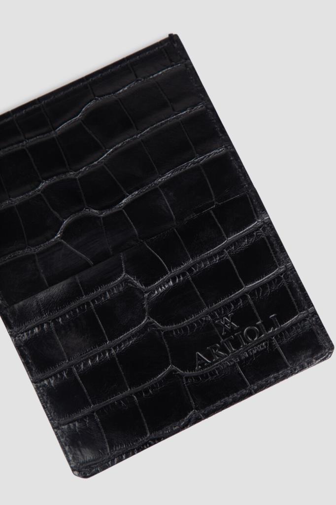 Чёрная кредитница Artioli с тремя слотами для пластиковых карт. Модель изготовлена из натуральной фактурной кожи крокодила. Атрибутами бренда стали серебристый металлический лого-монограмма на лицевой стенке и тиснёные логотип и монограмма сзади.