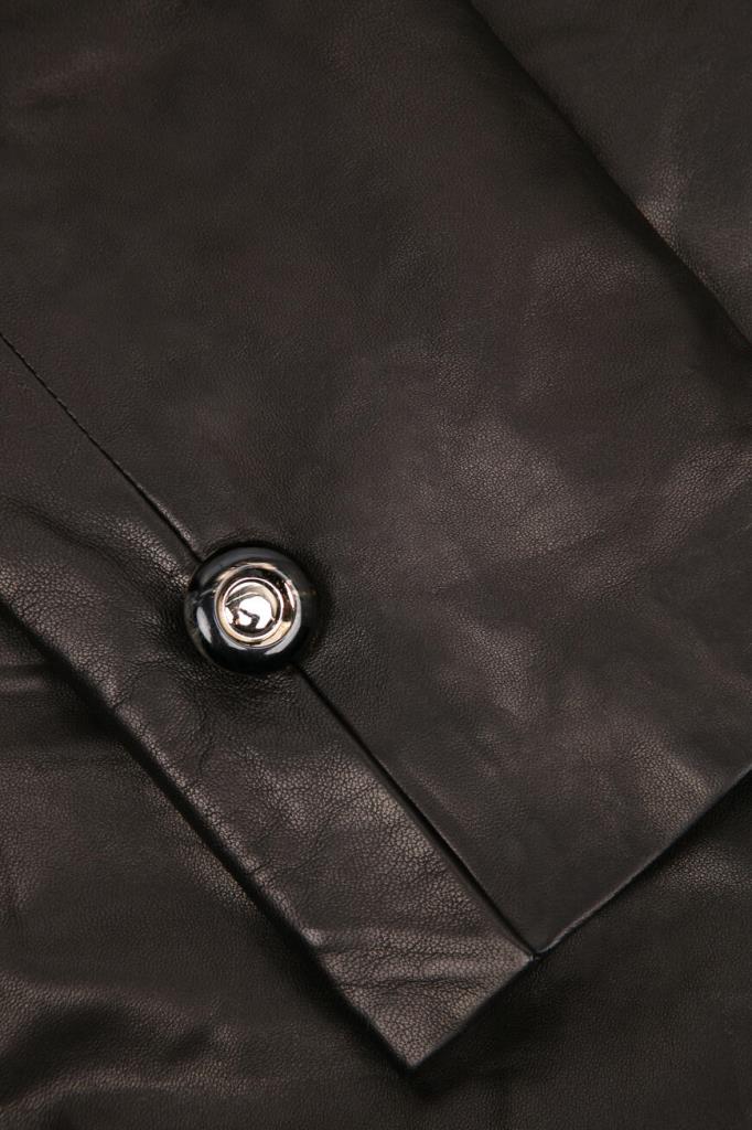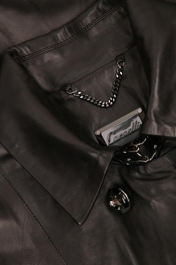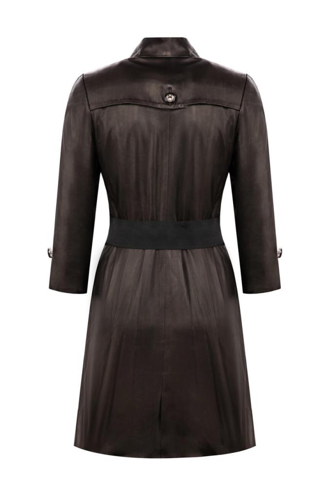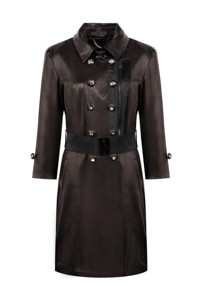 Роскошный женский плащ CARNELLI выполнен из мягкой натуральной гладкой телячьей кожи универсального тёмно-коричневого цвета и дополнен оригинальной контрастной чёрной вставкой-полосой на молнии спереди слева и широким эластичным чёрным поясом для фиксации.