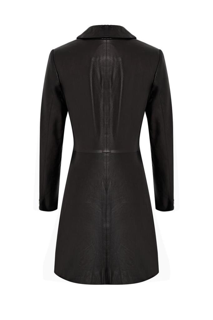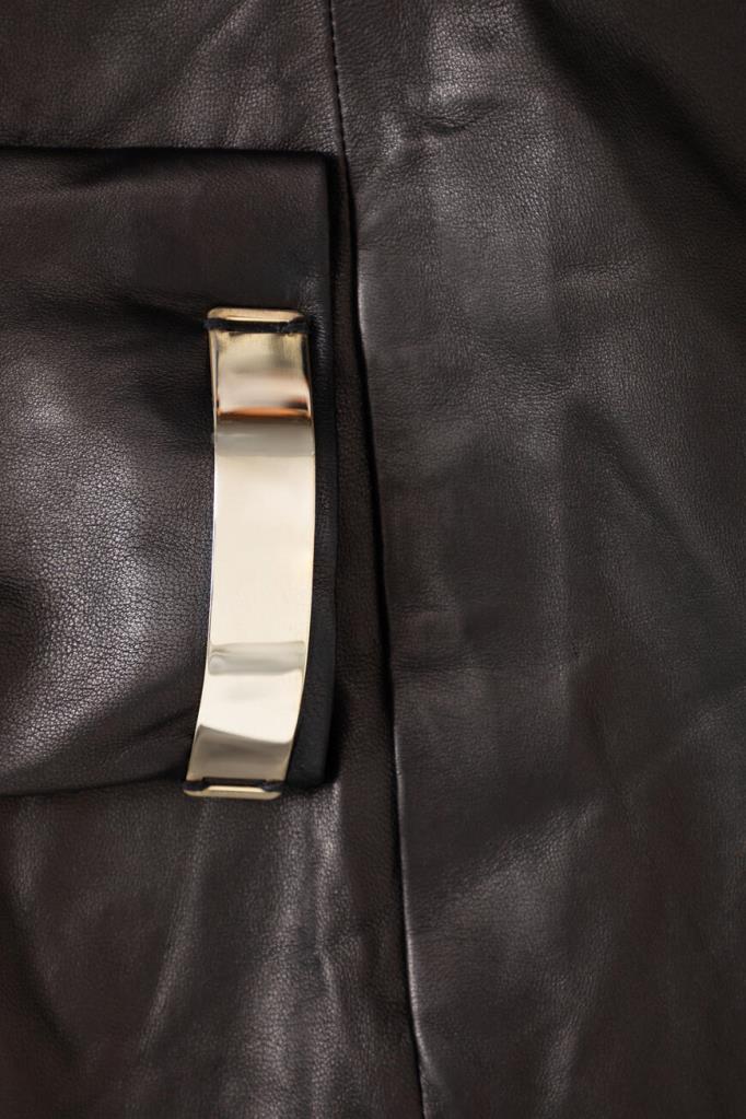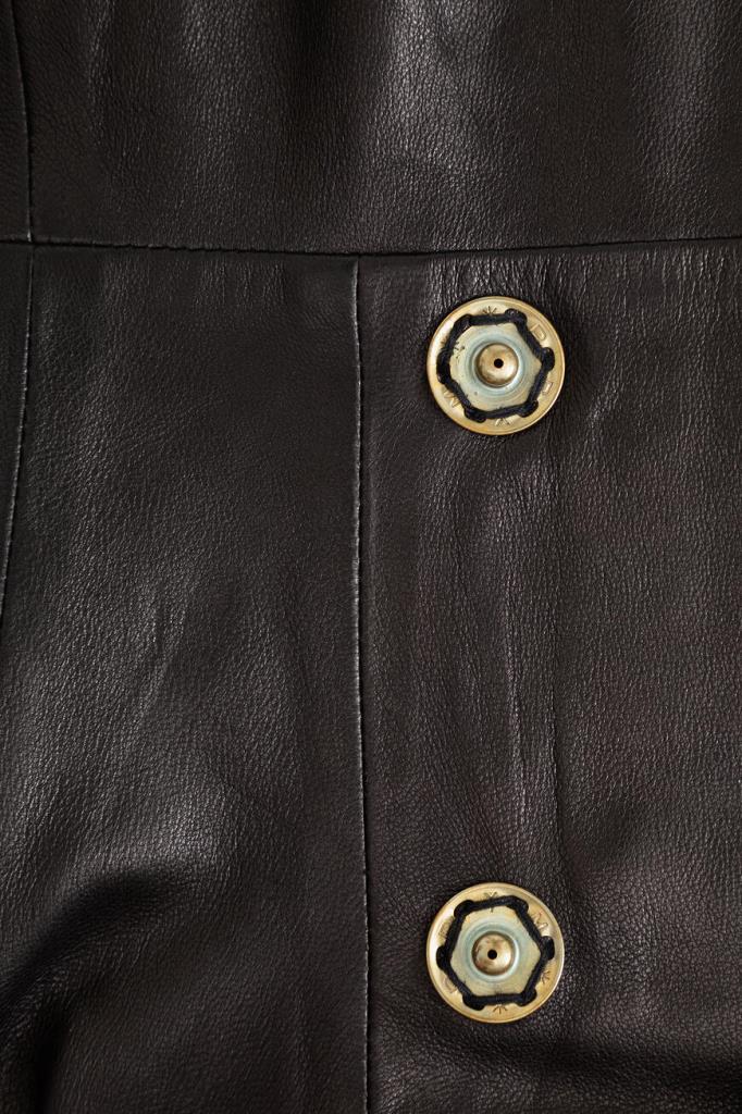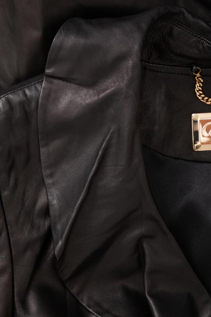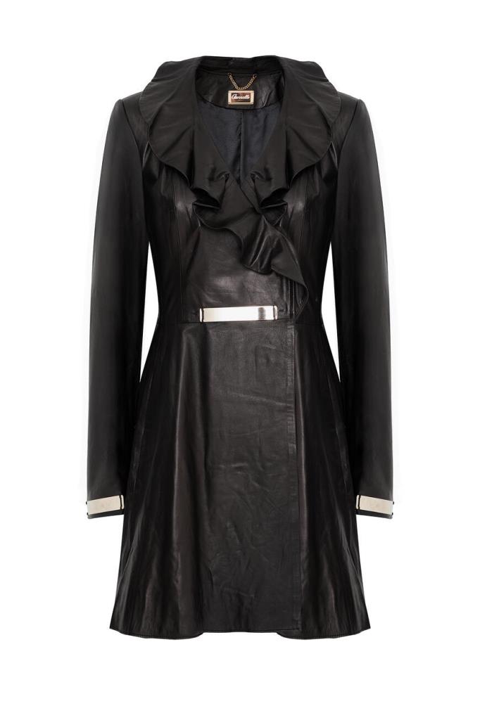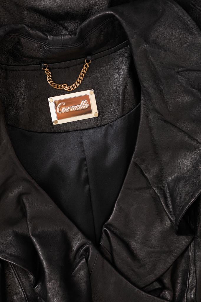 Кожаный плащ CARNELLI с золотистыми металлическими деталями. Модель с широким ажурным воротником окрашена в чёрный оттенок.
