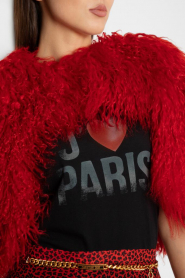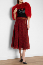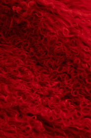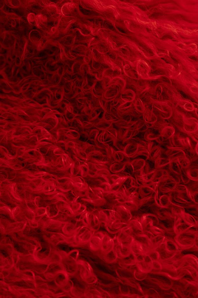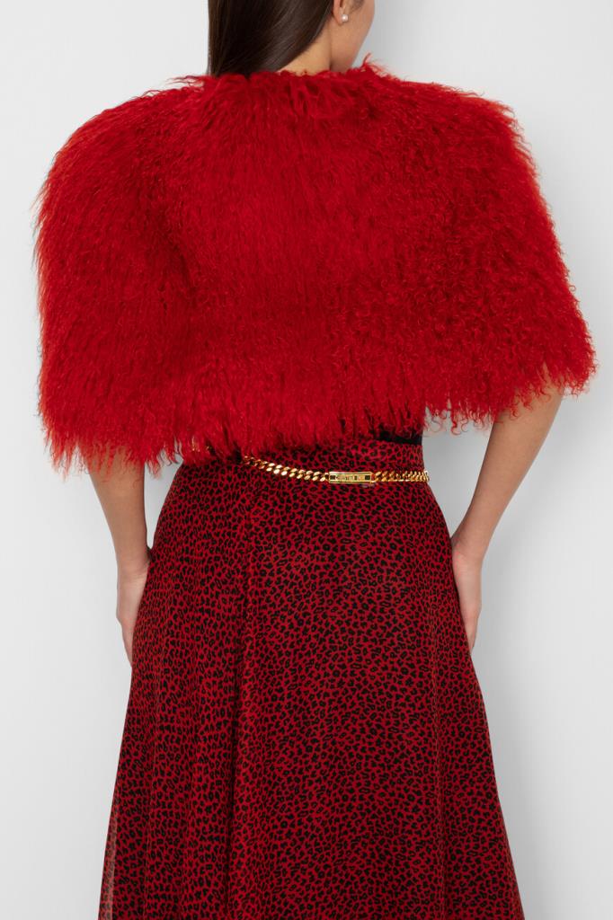 Ярко-красная накидка Dior выполнена из овчины с ворсистой поверхностью. Широкая модель выглядит почти невесомой за счёт натурального меха с длинным волнистым ворсом. Изделие застёгивается на шубные крючки и может стать ключевым акцентом образа с юбкой и футболкой того же бренда.