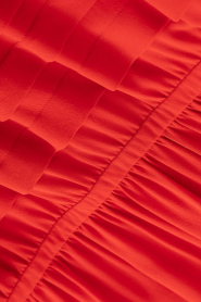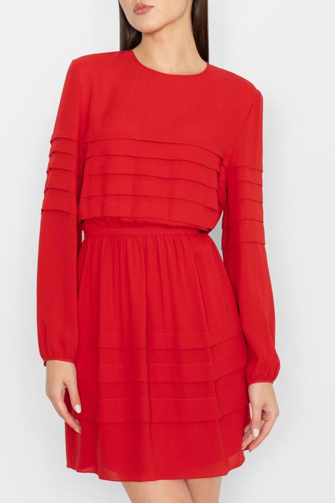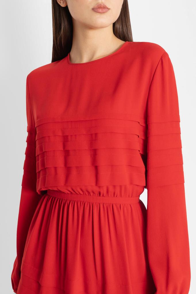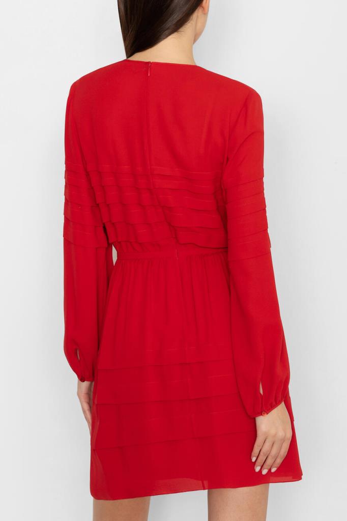 Короткое платье насыщенного ярко-красного оттенка от Dior. Фасон изделия из мягкого гладкого шёлка предполагает приталенный крой и длинные рукава. Отличительной деталью являются декоративные рельефные полосы на уровне груди и на подоле.