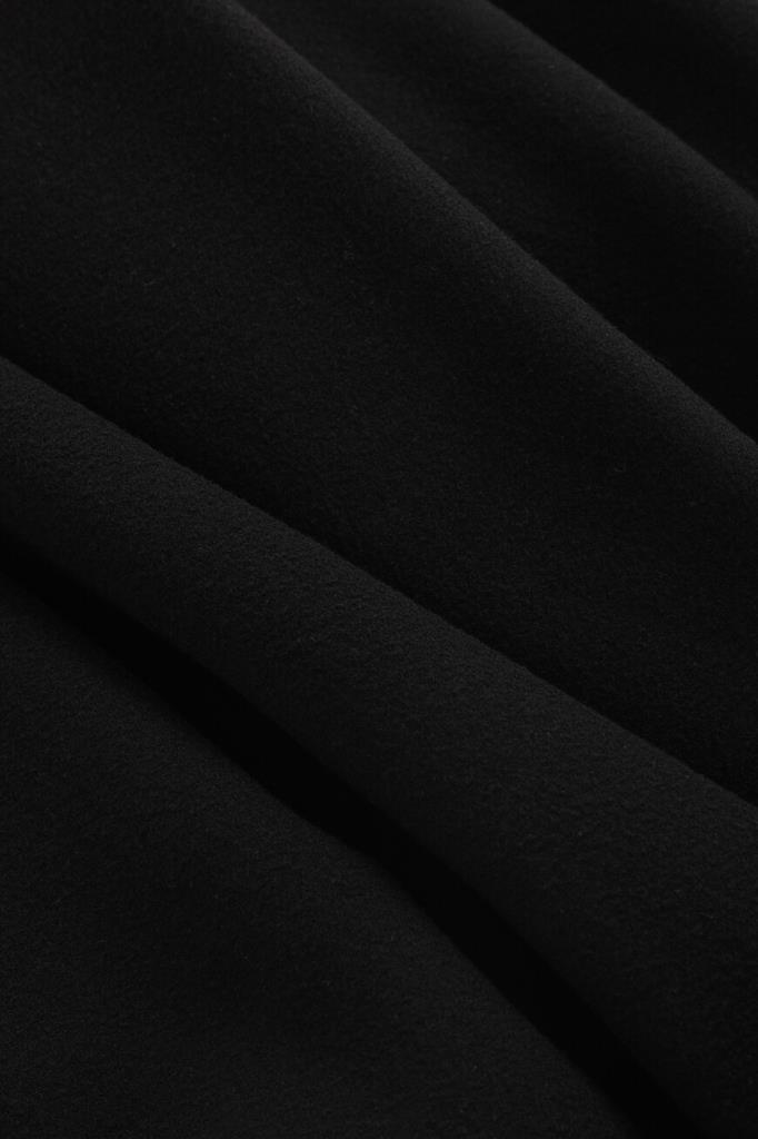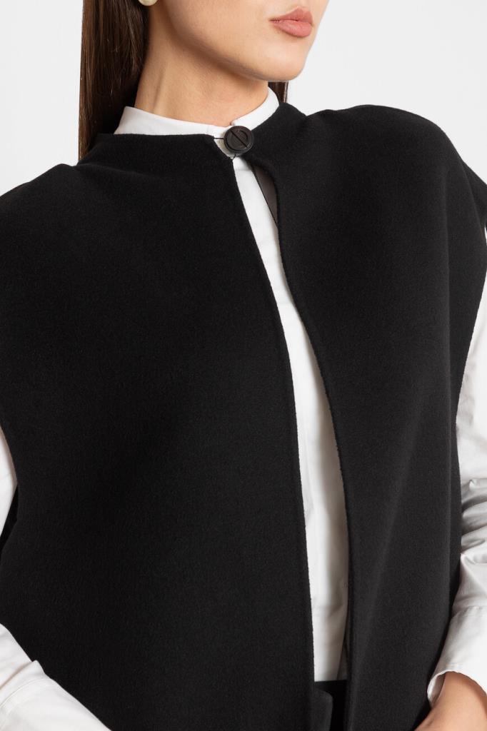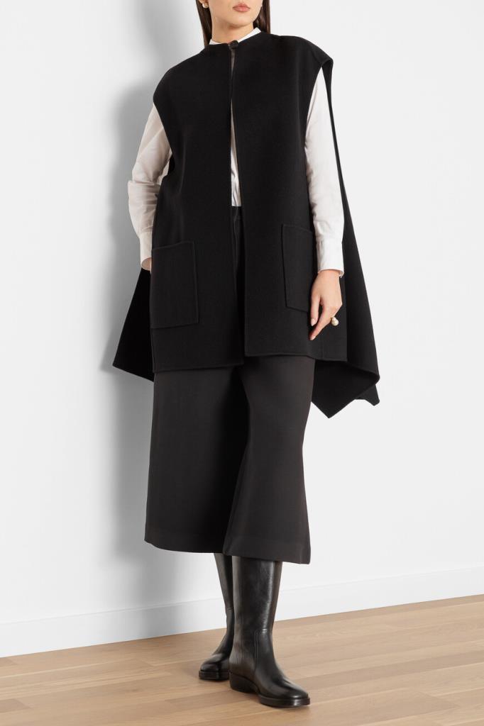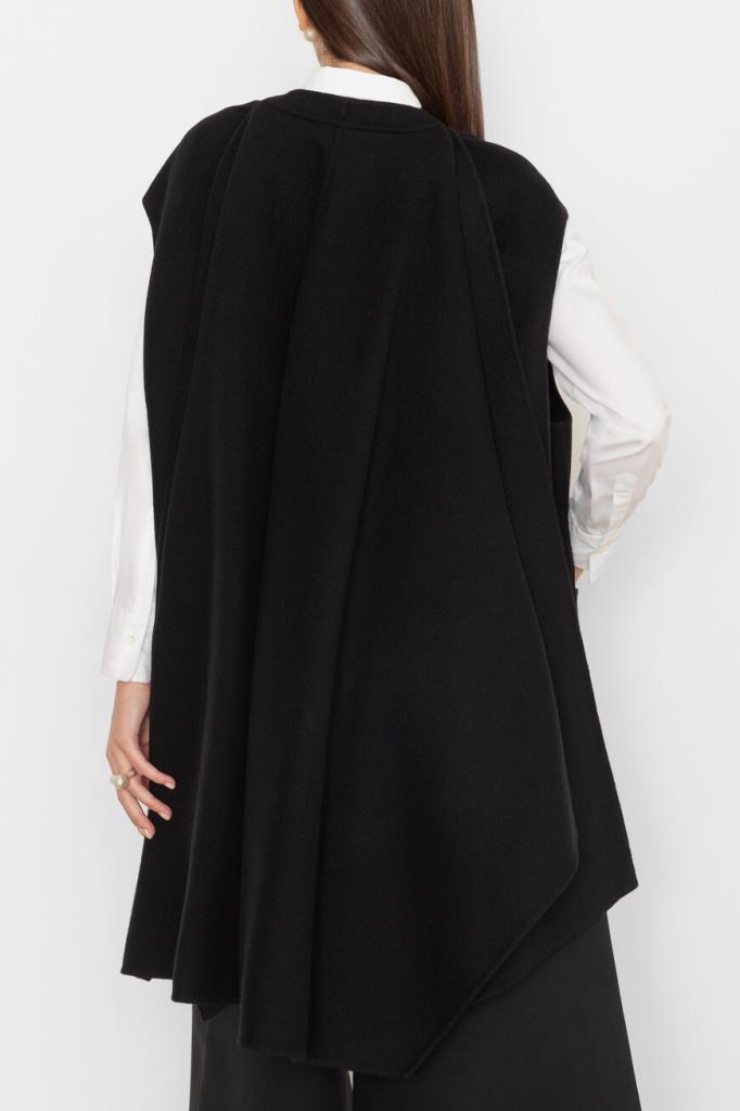 Чёрное пончо Dior с ассиметричным подолом. Изделие выполнено из мягкого кашемира с застёжкой на крупную пуговицу. Модель отличает дизайнерский крой: пончо представляет собой жилет с плиссированной накидкой, пришитой сзади. Изделие дополнит повседневный образ с белой рубашкой Brunello Cucinelli и укороченными брюками того же бренда.