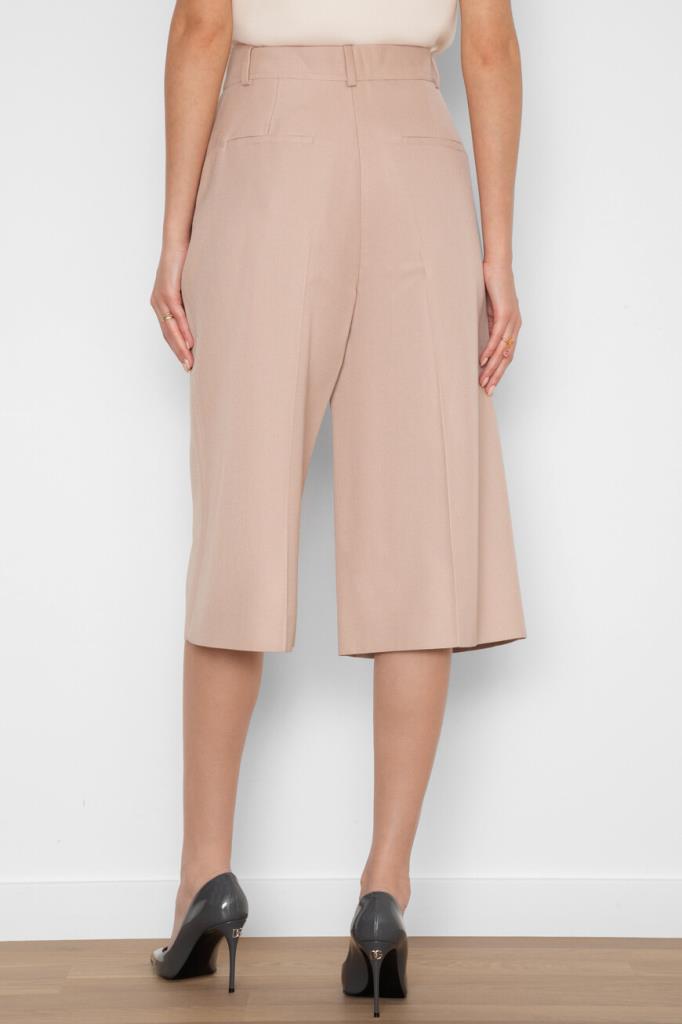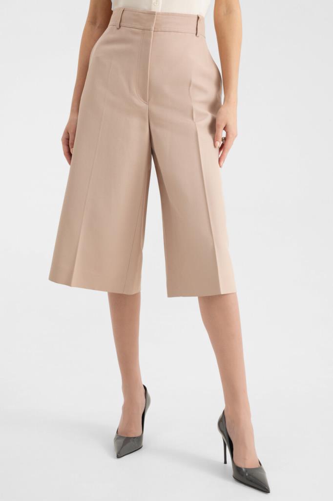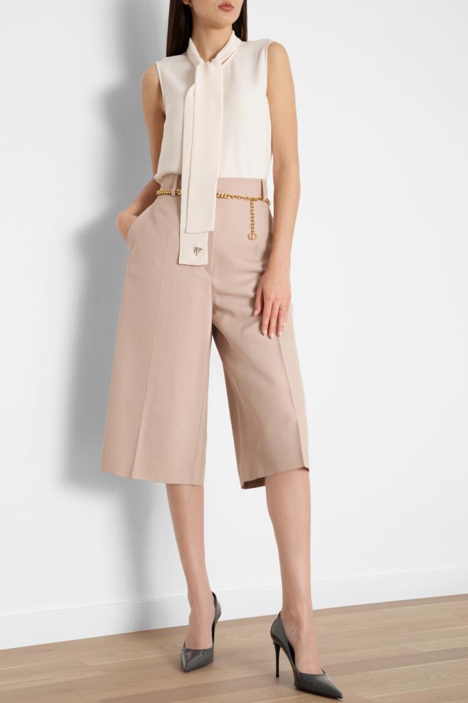 Бежевые шелковые кюлоты Dior внесут разнообразие в повседневный гардероб. Модель пудрового оттенка создает элегантный силуэт благодаря завышенной талии и широкому поясу. Брюки со стрелками станут основой делового образа вместе с белой рубашкой Brunello Cucinelli.