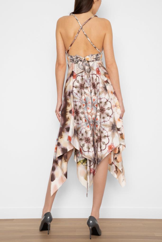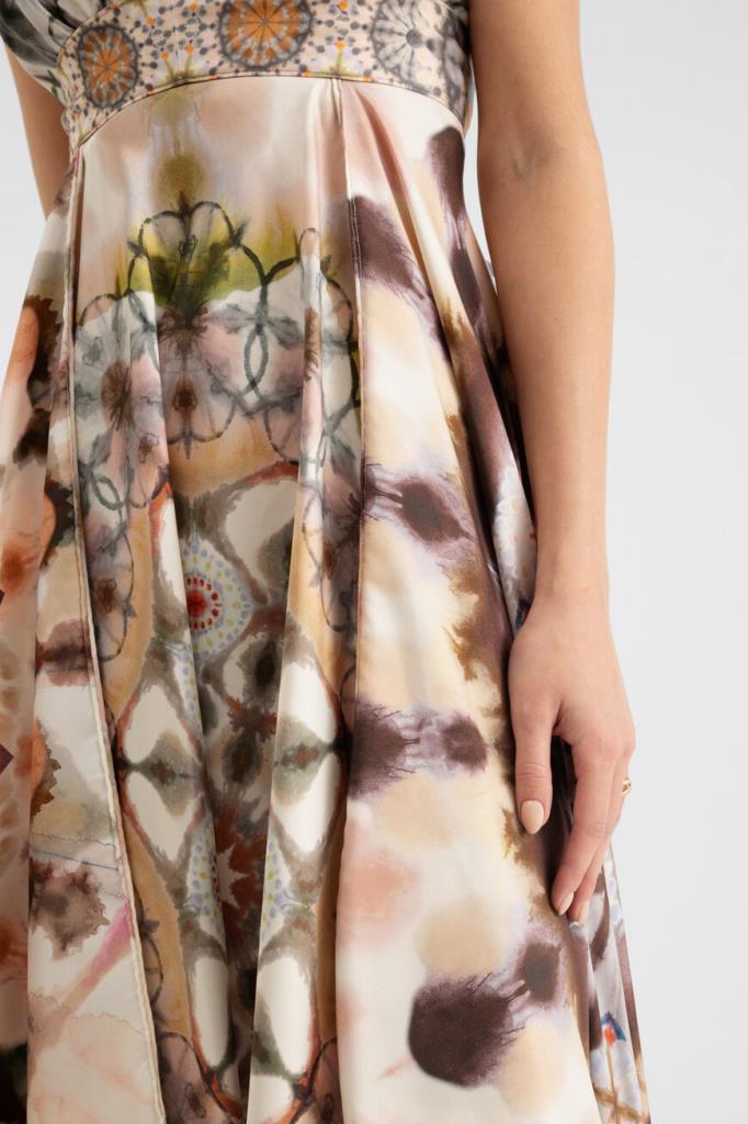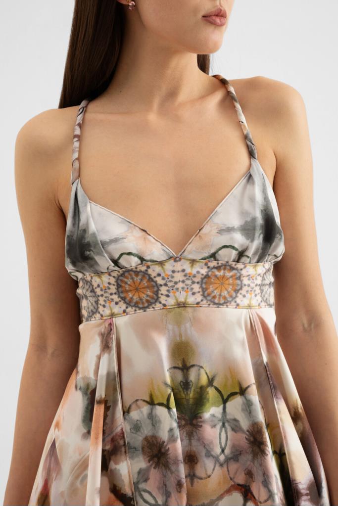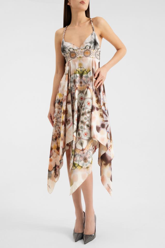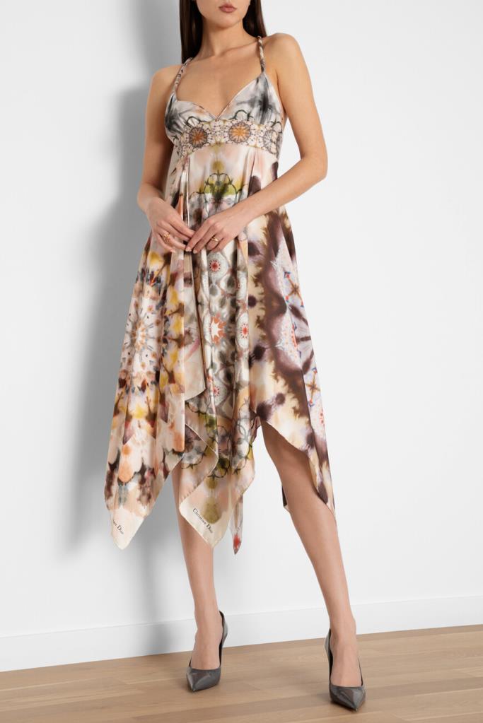 Платье с принтом KaléiDiorscope — безупречный выбор для коктейльного образа. Модель с изящным акварельным рисунком выполнена из шелкового твила. Плечи и зона декольте подчеркиваются тонкими бретелями из скрученных лент, переплетенных на спине. Завышенная талия с широким поясом и асимметричный расклешенный подол формируют элегантный силуэт. Дополните образ серыми лодочками Dolce & Gabbana.