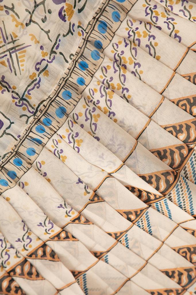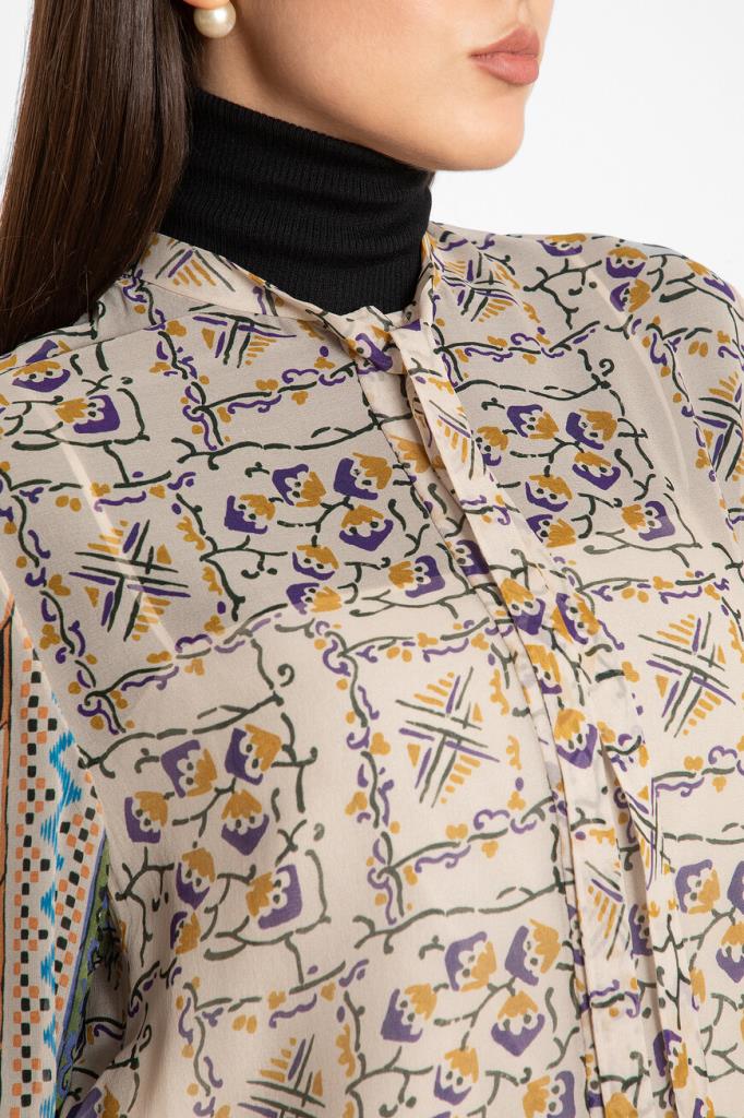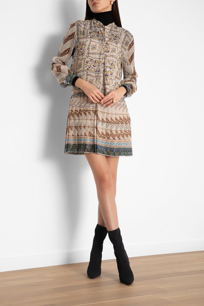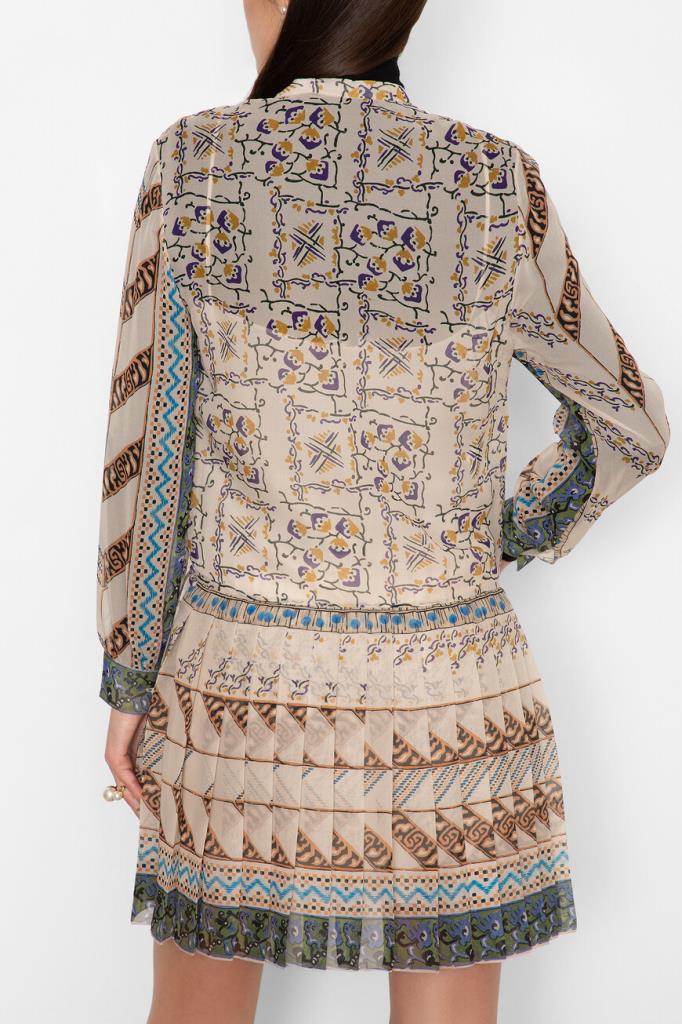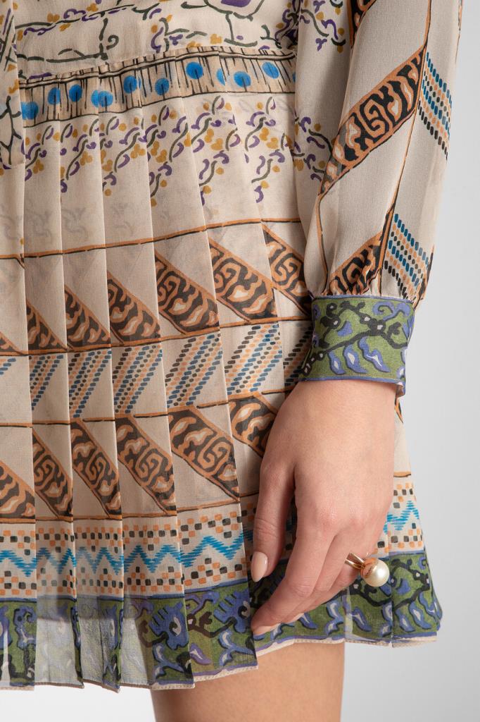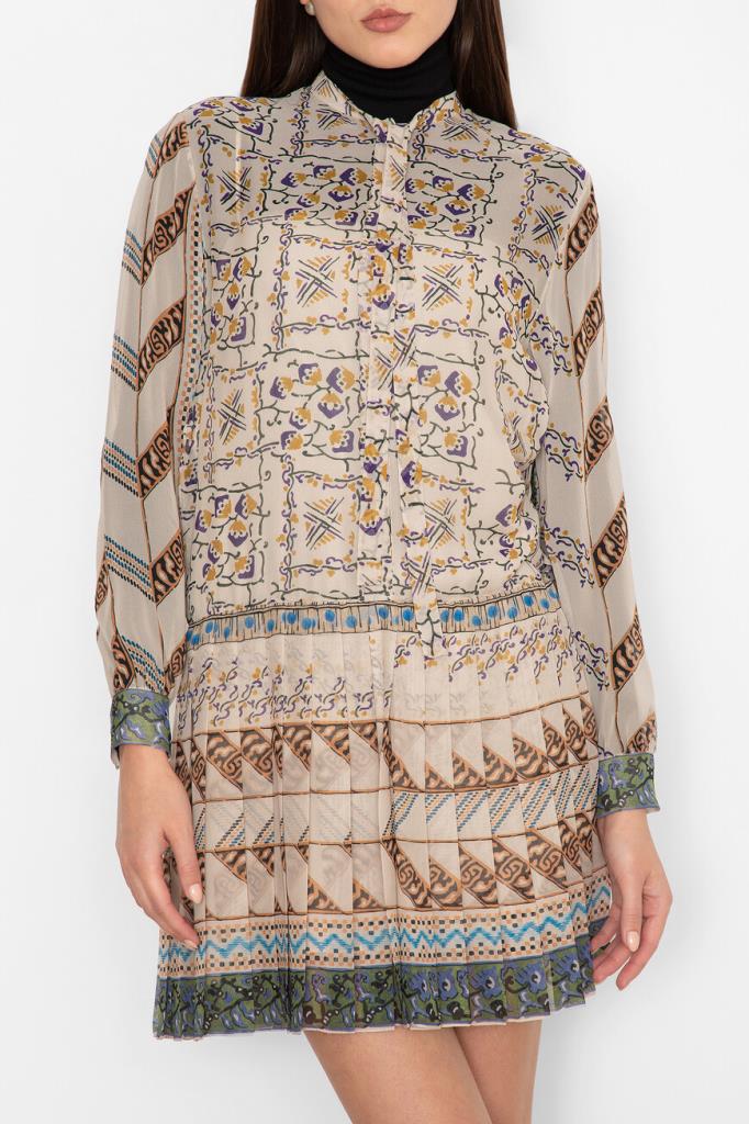 Шелковое платье с короткой плиссированной юбкой от Dior. Полупрозрачная модель приталенного кроя выполнена в светло-бежевом оттенке и дополнена разноцветным геометрическим принтом. Фасон изделия предполагает невысокий воротник-стойку на завязках и длинные рукава с манжетами на белой пуговице.