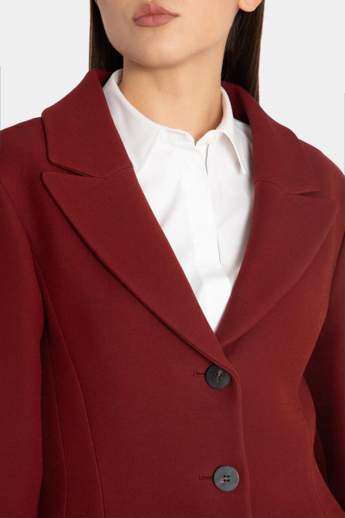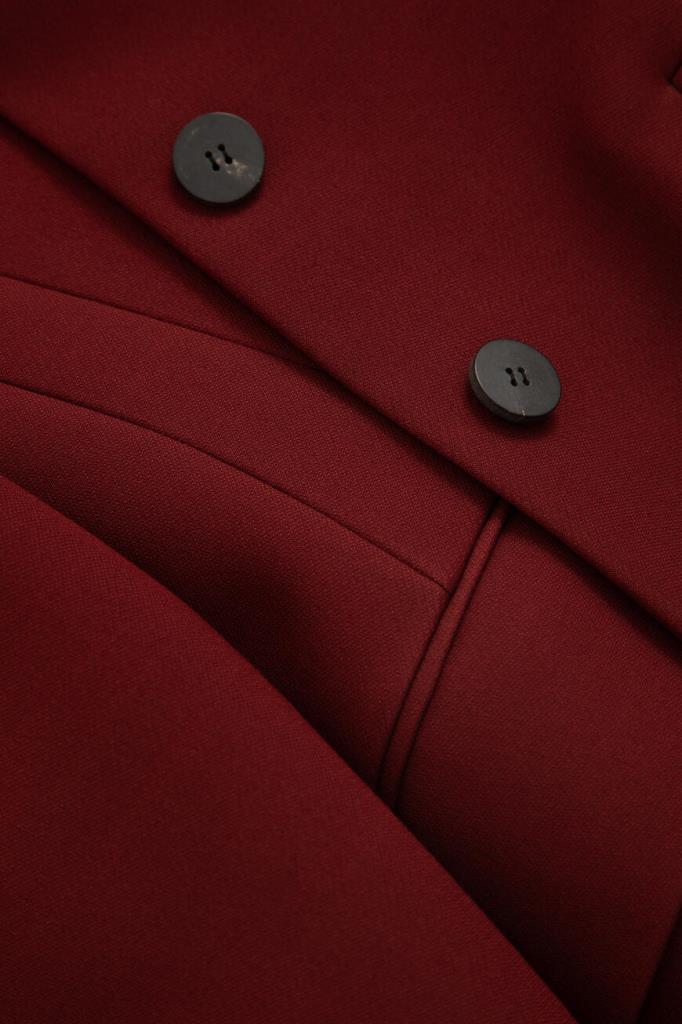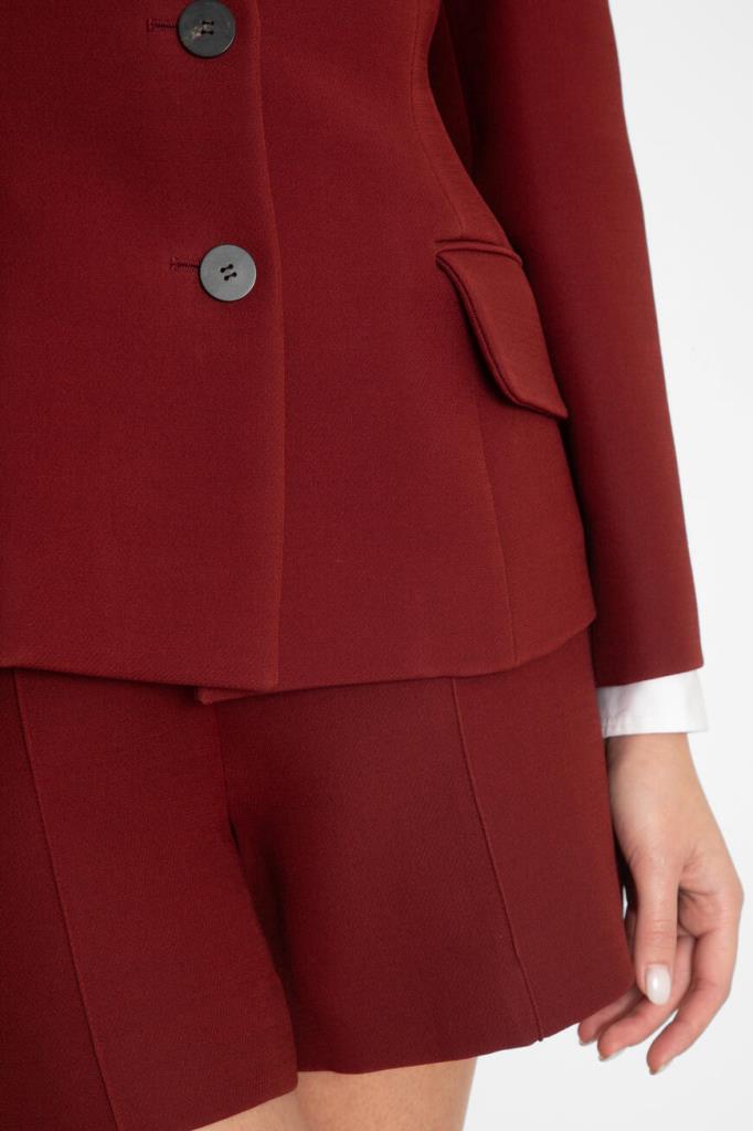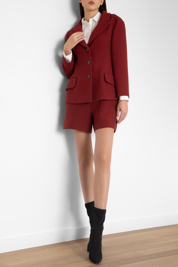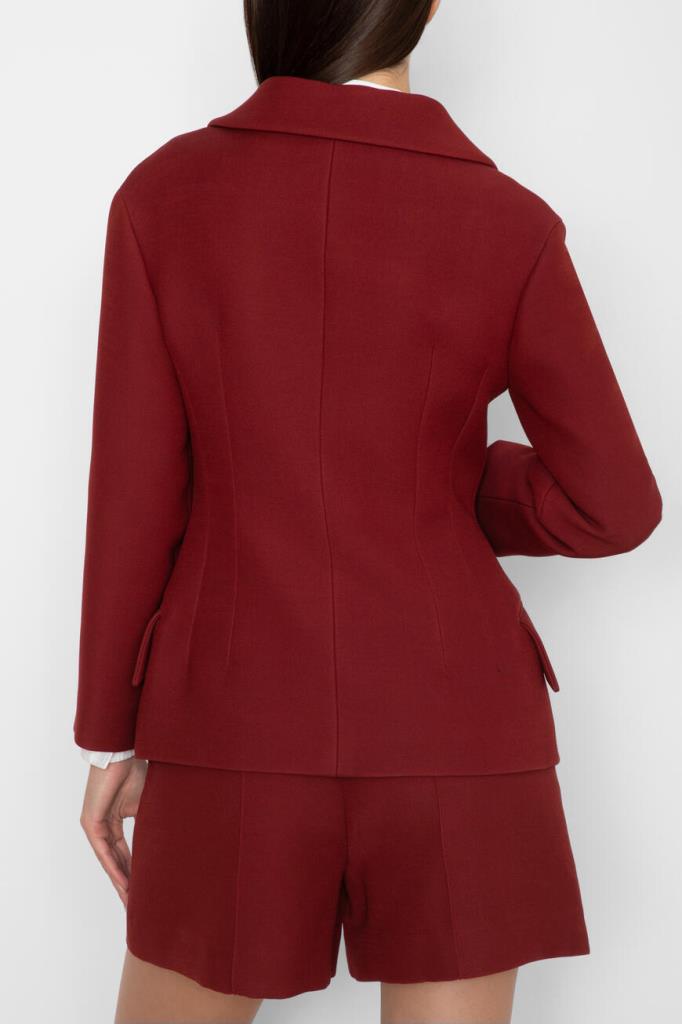 Культовый пиджак Bar от Dior представлен в красном цвете. Легендарная модель выполнена из шерсти с добавлением шелка. Благодаря премиальному составу ткани изделие можно с комфортом носить в холодный сезон. Однобортный пиджак с английским воротником составит элегантный комплект с красными шортами из той же коллекции.